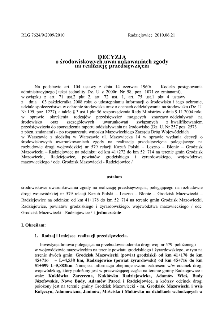 RLG 7624/9/2009/2010 Radziejowice 2010.06.21 DECYZJA o środowiskowych uwarunkowaniach zgody na realizację przedsięwzięcia Na podstawie art. 104 ustawy z dnia 14 czerwca 1960r. – Kodeks postępowania administracyjnego ( tekst jednolity Dz. U. z 2000r. Nr 98, poz. 1071 ze zmianami), w związku z art. 71 ust.2 pkt 2, art. 72 ust. 1, art. 75 ust.1 pkt 4 ustawy z dnia 03 października 2008 roku o udostępnianiu informacji o środowisku i jego ochronie, udziale społeczeństwa w ochronie środowiska oraz o ocenach oddziaływania na środowisko (Dz. U. Nr 199, poz. 1227), a takŜe § 3 ust.1 pkt 56 rozporządzenia Rady Ministrów z dnia 9.11.2004 roku w sprawie określenia rodzajów przedsięwzięć mogących znacząco oddziaływać na środowisko oraz szczegółowych uwarunkowań związanych z kwalifikowaniem przedsięwzięcia do sporządzenia raportu oddziaływania na środowisko (Dz. U. Nr 257 poz. 2573 z późn. zmianami) – po rozpatrzeniu wniosku Mazowieckiego Zarządu Dróg Wojewódzkich w Warszawie z siedzibą w Warszawie ul. Mazowiecka 14 w sprawie wydania decyzji o środowiskowych uwarunkowaniach zgody na realizację przedsięwzięcia polegającego na rozbudowie drogi wojewódzkiej nr 579 relacji Kazuń Polski – Leszno – Błonie – Grodzisk Mazowiecki – Radziejowice na odcinku: od km 41+272 do km 52+714 na terenie gmin Grodzisk Mazowiecki, Radziejowice, powiatów grodziskiego i Ŝyrardowskiego, województwa mazowieckiego / odc. Grodzisk Mazowiecki - Radziejowice / ustalam środowiskowe uwarunkowania zgody na realizację przedsięwzięcia, polegającego na rozbudowie drogi wojewódzkiej nr 579 relacji Kazuń Polski – Leszno – Błonie – Grodzisk Mazowiecki – Radziejowice na odcinku: od km 41+178 do km 52+714 na terenie gmin Grodzisk Mazowiecki, Radziejowice, powiatów grodziskiego i Ŝyrardowskiego, województwa mazowieckiego / odc. Grodzisk Mazowiecki - Radziejowice / i jednocześnie I. Określam: 1. Rodzaj i i miejsce realizacji przedsięwzięcia. Inwestycja liniowa polegająca na przebudowie odcinka drogi woj. nr 579 połoŜonego w województwie mazowieckim na terenie powiatu grodziskiego i Ŝyrardowskiego, w tym na terenie dwóch gmin: Grodzisk Mazowiecki (powiat grodziski) od km 41+178 do km 45+716 – L=4,538 km, Radziejowice (powiat Ŝyrardowski) od km 45+716 do km 51+599 L=5,883km. Niniejsza informacja obejmuje swoim zakresem w/w odcinek drogi wojewódzkiej, który połoŜony jest w przewaŜającej części na terenie gminy Radziejowice wsie: Kuklówka Zarzeczna, Kuklówka Radziejowicka, Adamów Wieś, Budy Józefowskie, Nowe Budy, Adamów Parcel i Radziejowice, a krótszy odcinek drogi połoŜony jest na terenie gminy Grodzisk Mazowiecki - m. Grodzisk Mazowiecki i wsie Kałęczyn, Adamowizna, Janinów, Mościska i Makówka na działkach wchodzących w zakres niniejszego opracowania. W trzech miejscach droga woj. nr 579 przecina tereny zabudowane: od km ~41+178 do ~44+046 w m. Kałęczyn, Janinów, Mościska; od km ~45+295 do km ~45+742 w m .Makówka oraz od km ~46+545 do km ~47+170 w m. Kuklówka Zarzeczna. Na pozostałym odcinku droga przebiega przez tereny niezabudowane o charakterze rolniczym– tereny rolne i tereny leśne. Lokalizacja inwestycji przebiega po śladzie istniejącej drogi wojewódzkiej nr 579 oraz zgodna jest z miejscowym planem zagospodarowania przestrzennego terenu miasta Grodzisk Mazowiecki i gminy Radziejowice. Lokalnie niezbędne będą wykupy lub dzierŜawy terenu pod poszerzenie istniejącego pasa drogowego, związane z budową: zatok autobusowych, chodników, ścieŜek rowerowych, ciągów pieszo - rowerowych i rowów odwadniających. Lokalizację i zakres przedsięwzięcia określa plan orientacyjny stanowiący załącznik nr 1 do niniejszej decyzji 2. Warunki wykorzystania terenu w fazie realizacji i eksploatacji ze szczególnym uwzględnieniem konieczności ochrony cennych wartości przyrodniczych, zasobów naturalnych i zabytków oraz ograniczenia uciąŜliwości dla terenów sąsiednich. W celu ograniczenia do minimum uciąŜliwości dla środowiska mogących wystąpić w fazie realizacji przedsięwzięcia, roboty naleŜy prowadzić wyłącznie w porze dziennej / między godziną 6.00 a 22.00 / z wykorzystaniem sprawnego sprzętu technicznego. - Zanieczyszczenie powietrza atmosferycznego: Przedsięwzięcie na etapie realizacji, eksploatacji i likwidacji nie będzie źródłem emisji zorganizowanej zanieczyszczeń gazowych i pyłowych do powietrza atmosferycznego. Na etapie realizacji przedsięwzięcia wystąpi emisja niezorganizowana, źródłami której będą: - praca silników urządzeń budowlanych, sprzętu i samochodów transportowych oraz pojazdów pracujących na terenie realizacji przedsięwzięcia. - pylenie związane z prowadzeniem prac ziemnych (wykonywanie wykopów lub nasypów) i magazynowaniem materiałów, Do robót budowlanych naleŜy uŜywać wyłącznie sprzętu sprawnego technicznie w celu zmniejszenia emisji zanieczyszczeń. W trakcie eksploatacji wyremontowanej drogi emitowane będą zanieczyszczenia związane ze spalaniem paliw w poruszających się pojazdach, jednak ze względu na polepszenie nawierzchni przeprowadzone w wyniku niniejszej inwestycji będzie ono mniejsze niŜ dotychczas. Przedsięwzięcie realizowane będzie poza wyznaczonymi i proponowanymi obszarami Natura 2000 wyznaczonymi w trybie ustawy z dnia 16 kwietnia 2004 r. O ochronie przyrody (Dz. U. Nr 92, poz. 880 z późniejszymi zmianami). - Odpady: W trakcie realizacji, eksploatacji i likwidacji przedsięwzięcia mogą być wytwarzane odpady niebezpieczne oraz inne niŜ niebezpieczne. Materiały z rozbiórki i odpady powstające w trakcie rozbudowy będą segregowane i gromadzone w przeznaczonym do tego celu miejscach, a następnie powtórnie wykorzystane. Pozostałe materiały nie nadające się do powtórnego wykorzystania na miejscu będą wywoŜone do baz materiałowych właściwego terenowo Rejonu Dróg Wojewódzkich. Miejsce prow