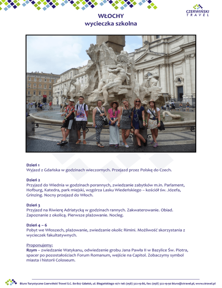 WŁOCHY wycieczka szkolna Dzień 1 Wyjazd z Gdańska w godzinach wieczornych. Przejazd przez Polskę do Czech. Dzień 2 Przyjazd do Wiednia w godzinach porannych, zwiedzanie zabytków m.in. Parlament, Hofburg, Katedra, park miejski, wzgórza Lasku Wiedeńskiego – kościół św. Józefa, Grinzing. Nocny przejazd do Włoch. Dzień 3 Przyjazd na Riwierę Adriatycką w godzinach rannych. Zakwaterowanie. Obiad. Zapoznanie z okolicą. Pierwsze plażowanie. Nocleg. Dzień 4 – 6 Pobyt we Włoszech, plażowanie, zwiedzanie okolic Rimini. Możliwość skorzystania z wycieczek fakultatywnych. Proponujemy: Rzym – zwiedzanie Watykanu, odwiedzenie grobu Jana Pawła II w Bazylice Św. Piotra, spacer po pozostałościach Forum Romanum, wejście na Capitol. Zobaczymy symbol miasta i historii Coloseum. WŁOCHY wycieczka szkolna San Marino – przepięknie położona miejscowość na zboczach Titano. Florencja – całodzienna wycieczka autokarem. W programie min. Plac Michała Anioła ze wspaniałym widokiem na miasto. Piza – słynna krzywa wieża położona na Polu Cudów. Mirabilandia – jeden z największych Parków Rozrywki w Europie. Posiada 7 stref tematycznych Asyż i Perugia – zwiedzanie Bazyliki św. Franciszka z XIII w. Piazza Comune oraz kościół św. Klary, założycielki zakonu Klarysek., spacer po Perugii. Dzień 7 Po śniadaniu wykwaterowanie. Przejazd do Wenecji. Zwiedzanie. Nocny przejazd przez Austrię i Czechy. Dzień 8 Zakończenie wycieczki. Cena: od 1155 zł Cena obejmuje: transport autokarem, 2 noclegi wyżywienie wg programu przewodników wg programu opiekę pilota wycieczek bezpłatny udział opiekunów (1 na 15 osób) opłaty parkingowe ubezpieczenie podatek VAT. Cena nie obejmuje: biletów wstępu do zwiedzanych obiektów wydatków własnych UWAGA: Możliwość zorganizowania wycieczki również dla szkół spoza Trójmiasta.