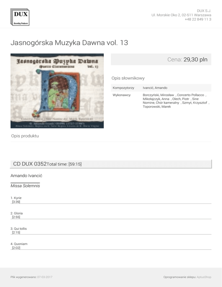 DUX S.J. Ul. Morskie Oko 2, 02-511 Warszawa +48 22 849 11 3 Jasnogórska Muzyka Dawna vol. 13 Cena: 29,30 pln Opis słownikowy Kompozytorzy Ivancić, Amando ∎ Wykonawcy Borczyński, Mirosław ∎, Concerto Pollacco ∎, Mikołajczyk, Anna ∎, Olech, Piotr ∎, Sine Nomine, Chór kameralny ∎, Szmyt, Krzysztof ∎, Toporowski, Marek ∎ Opis produktu CD DUX 0352Total time: [59:15] Amando Ivancić Missa Solemnis 1. Kyrie [3:39] 2. Gloria [2:55] 3. Qui tollis [2:15] 4. Quoniam [2:02] Plik wygenerowano: 07-03-2017 Oprogramowanie sklepu: AptusShop DUX S.J. Ul. Morskie Oko 2, 02-511 Warszawa +48 22 849 11 3 5. Cum Sancto Spiritu [2:10] 6. Credo [1:46] 7. Et incarnatus [3:34] 8. Et resurrexit [1:26] 9. Et vitam venturi [2:05] 10. Sanctus [1:36] 11. Benedictus [4:50] 12. Agnus Dei [2:24] 13. Dona nobis pacem [2:06] Amando Ivancić Regina coeli 14. Regina coeli [1:11] Amando Ivancić Salve Regina 15. Salve Regina [3:31] Plik wygenerowano: 07-03-2017 Oprogramowanie sklepu: AptusShop DUX S.J. Ul. Morskie Oko 2, 02-511 Warszawa +48 22 849 11 3 Amando Ivancić Litania de B. Maria Virgine 16. Kyrie eleison [5:14] 17. Mater Divinae gratiae [3:07] 18. Virgo prudentissima [2:08] 19. Rosa mystica [4:14] 20. Salus infirmorum [3:01] 21. Regina angelorum [1:21] 22. Agnus Dei [2:33] Wykonawcy: Concerto Pollacco Anna Mikołajczyk /sopran/ Chór kameralny Sine Nomine Krzysztof Szmyt /tenor/ Marek Toporowski /dyrygent/ Mirosław Borczyński /bas/ Piotr Olech /alt/ Plik wygenerowano: 07-03-2017 Powered by TCPDF (www.tcpdf.org) Oprogramowanie sklepu: AptusShop