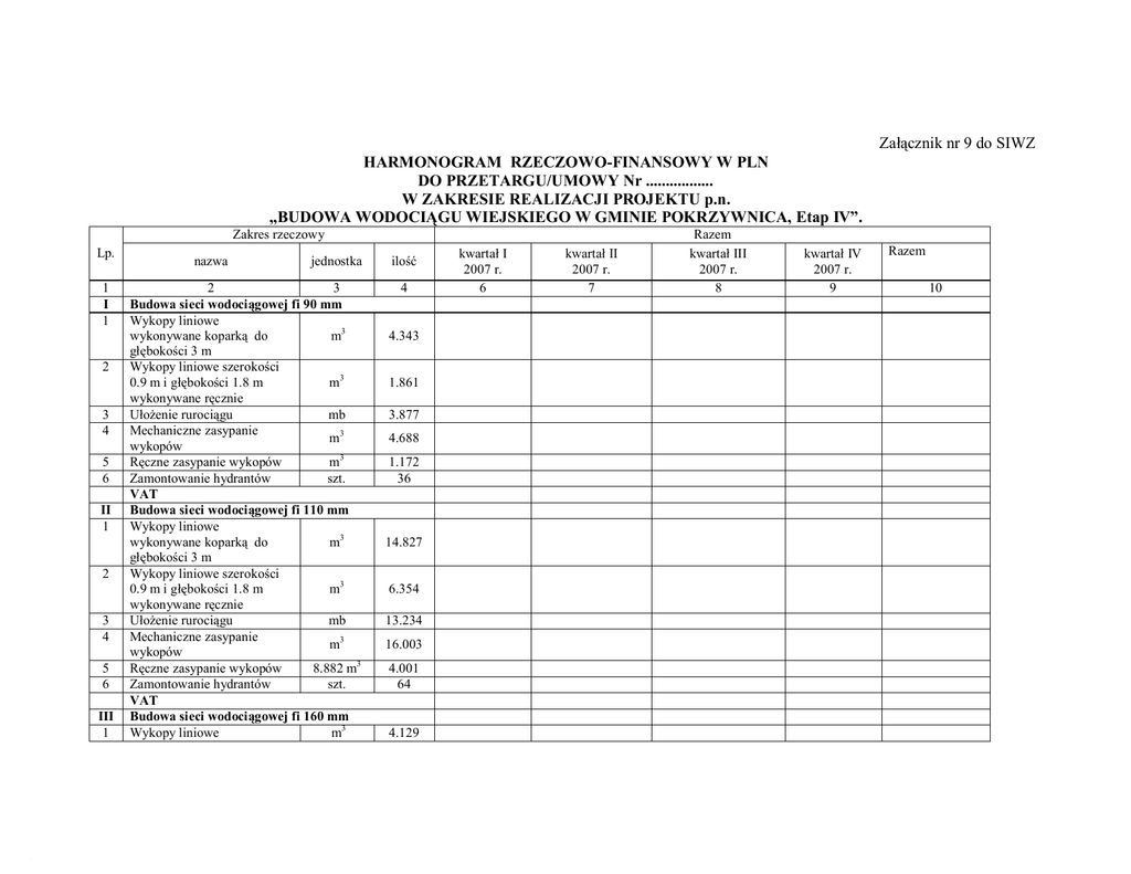 Załącznik nr 9 do SIWZ HARMONOGRAM RZECZOWO-FINANSOWY W PLN DO PRZETARGU/UMOWY Nr ................. W ZAKRESIE REALIZACJI PROJEKTU p.n. „BUDOWA WODOCIĄGU WIEJSKIEGO W GMINIE POKRZYWNICA, Etap IV”. Zakres rzeczowy Lp. 1 I 1 2 3 4 5 6 II 1 2 3 4 5 6 III 1 nazwa jednostka 2 3 Budowa sieci wodociągowej fi 90 mm Wykopy liniowe wykonywane koparką do m3 głębokości 3 m Wykopy liniowe szerokości 0.9 m i głębokości 1.8 m m3 wykonywane ręcznie Ułożenie rurociągu mb Mechaniczne zasypanie m3 wykopów Ręczne zasypanie wykopów m3 Zamontowanie hydrantów szt. VAT Budowa sieci wodociągowej fi 110 mm Wykopy liniowe wykonywane koparką do m3 głębokości 3 m Wykopy liniowe szerokości 0.9 m i głębokości 1.8 m m3 wykonywane ręcznie Ułożenie rurociągu mb Mechaniczne zasypanie m3 wykopów Ręczne zasypanie wykopów 8.882 m3 Zamontowanie hydrantów szt. VAT Budowa sieci wodociągowej fi 160 mm Wykopy liniowe m3 ilość 4 4.343 1.861 3.877 4.688 1.172 36 14.827 6.354 13.234 16.003 4.001 64 4.129 kwartał I 2007 r. 6 kwartał II 2007 r. 7 Razem kwartał III 2007 r. 8 kwartał IV 2007 r. 9 Razem 10 2 2 3 4 5 6 IV 1 2 3 4 5 6 V 1 2 3 4 5 6 wykonywane koparką do głębokości 3 m Wykopy liniowe szerokości 0.9 m i głębokości 1.8 m m3 wykonywane ręcznie Ułożenie rurociągu mb Mechaniczne zasypanie m3 wykopów Ręczne zasypanie wykopów m3 Zamontowanie hydrantów szt. VAT Budowa sieci wodociągowej fi 225 mm Wykopy liniowe wykonywane m3 koparką do głębokości 3 m Wykopy liniowe szerokości 0.9 m i głębokości 1.8 m m3 wykonywane ręcznie Ułożenie rurociągu mb Mechaniczne zasypanie m3 wykopów Ręczne zasypanie wykopów m3 Zamontowanie hydrantów szt. VAT Budowa przyłączy wodociągowych Wykop o głębokości do 3,0 m m3 wykonany na odkład koparką Wykop liniowy szer. 0,9 i głęb. 1,8 m wykonywany m3 ręcznie Ułożenie przyłączy z rur mb wodoc. polietylenowych (PE) Mechaniczne zasypanie wykopu liniowego kop. – m3 spych. ciągnikową Ręczne zasypanie wykopu m3 liniowego Zamontowanie wewnętrznej kpl 1.770 3.686 4.457 1.114 9 5.448 2.335 4.863 5.881 1.470 15 9.747 4.177 9.247 11.140 2.785 283 3 7 instalacji z wodomierzem i zaworem czerpalnym lub wcięciem do istniejącej instalacji Studzienki wodomierzowe Ø 800 mm VAT szt. 60 Razem koszty INWESTOR * .................................................................................... Data Podpis i pieczątka osób uprawnionych do akceptacji * w przypadku akceptacji i zawarcia umowy WYKONAWCA ............................................................................... Podpis i pieczątka osób uprawnionych do reprezentacji