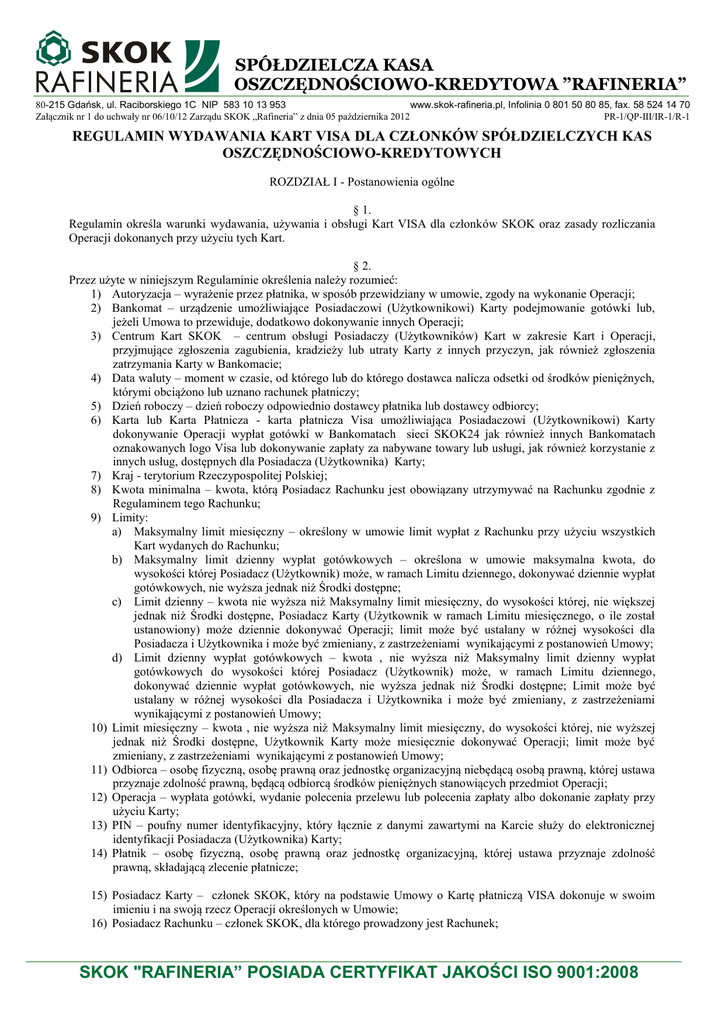 SPÓŁDZIELCZA KASA OSZCZĘDNOŚCIOWO-KREDYTOWA ”RAFINERIA” 80-215 Gdańsk, ul. Raciborskiego 1C NIP 583 10 13 953 www.skok-rafineria.pl, Infolinia 0 801 50 80 85, fax. 58 524 14 70 Załącznik nr 1 do uchwały nr 06/10/12 Zarządu SKOK „Rafineria” z dnia 05 października 2012 PR-1/QP-III/IR-1/R-1 REGULAMIN WYDAWANIA KART VISA DLA CZŁONKÓW SPÓŁDZIELCZYCH KAS OSZCZĘDNOŚCIOWO-KREDYTOWYCH ROZDZIAŁ I - Postanowienia ogólne § 1. Regulamin określa warunki wydawania, używania i obsługi Kart VISA dla członków SKOK oraz zasady rozliczania Operacji dokonanych przy użyciu tych Kart. § 2. Przez użyte w niniejszym Regulaminie określenia należy rozumieć: 1) Autoryzacja – wyrażenie przez płatnika, w sposób przewidziany w umowie, zgody na wykonanie Operacji; 2) Bankomat – urządzenie umożliwiające Posiadaczowi (Użytkownikowi) Karty podejmowanie gotówki lub, jeżeli Umowa to przewiduje, dodatkowo dokonywanie innych Operacji; 3) Centrum Kart SKOK – centrum obsługi Posiadaczy (Użytkowników) Kart w zakresie Kart i Operacji, przyjmujące zgłoszenia zagubienia, kradzieży lub utraty Karty z innych przyczyn, jak również zgłoszenia zatrzymania Karty w Bankomacie; 4) Data waluty – moment w czasie, od którego lub do którego dostawca nalicza odsetki od środków pieniężnych, którymi obciążono lub uznano rachunek płatniczy; 5) Dzień roboczy – dzień roboczy odpowiednio dostawcy płatnika lub dostawcy odbiorcy; 6) Karta lub Karta Płatnicza - karta płatnicza Visa umożliwiająca Posiadaczowi (Użytkownikowi) Karty dokonywanie Operacji wypłat gotówki w Bankomatach sieci SKOK24 jak również innych Bankomatach oznakowanych logo Visa lub dokonywanie zapłaty za nabywane towary lub usługi, jak również korzystanie z innych usług, dostępnych dla Posiadacza (Użytkownika) Karty; 7) Kraj - terytorium Rzeczypospolitej Polskiej; 8) Kwota minimalna – kwota, którą Posiadacz Rachunku jest obowiązany utrzymywać na Rachunku zgodnie z Regulaminem tego Rachunku; 9) Limity: a) Maksymalny limit miesięczny – określony w umowie limit wypłat z Rachunku przy użyciu wszystkich Kart wydanych do Rachunku; b) Maksymalny limit dzienny wypłat gotówkowych – określona w umowie maksymalna kwota, do wysokości której Posiadacz (Użytkownik) może, w ramach Limitu dziennego, dokonywać dziennie wypłat gotówkowych, nie wyższa jednak niż Środki dostępne; c) Limit dzienny – kwota nie wyższa niż Maksymalny limit miesięczny, do wysokości której, nie większej jednak niż Środki dostępne, Posiadacz Karty (Użytkownik w ramach Limitu miesięcznego, o ile został ustanowiony) może dziennie dokonywać Operacji; limit może być ustalany w różnej wysokości dla Posiadacza i Użytkownika i może być zmieniany, z zastrzeżeniami wynikającymi z postanowień Umowy; d) Limit dzienny wypłat gotówkowych – kwota , nie wyższa niż Maksymalny limit dzienny wypłat gotówkowych do wysokości której Posiadacz (Użytkownik) może, w ramach Limitu dziennego, dokonywać dziennie wypłat gotówkowych, nie wyższa jednak niż Środki dostępne; Limit może być ustalany w różnej wysokości dla Posiadacza i Użytkownika i może być zmieniany, z zastrzeżeniami wynikającymi z postanowień Umowy; 10) Limit miesięczny – kwota , nie wyższa niż Maksymalny limit miesięczny, do wysokości której, nie wyższej jednak niż Środki dostępne, Użytkownik Karty może miesięcznie dokonywać Operacji; limit może być zmieniany, z zastrzeżeniami wynikającymi z postanowień Umowy; 11) Odbiorca – osobę fizyczną, osobę prawną oraz jednostkę organizacyjną niebędącą osobą prawną, której ustawa przyznaje zdolność prawną, będącą odbiorcą środków pieniężnych stanowiących przedmiot Operacji; 12) Operacja – wypłata gotówki, wydanie polecenia przelewu lub polecenia zapłaty albo dokonanie zapłaty przy użyciu Karty; 13) PIN – poufny numer identyfikacyjny, który łącznie z danymi zawartymi na Karcie służy do elektronicznej identyfikacji Posiadacza (Użytkownika) Karty; 14) Płatnik – osobę fizyczną, osobę prawną oraz jednostkę organizacyjną, której ustawa przyznaje zdolność prawną, składającą zlecenie płatnicze; 15) Posiadacz Karty – członek SKOK, który na podstawie Umowy o Kartę płatniczą VISA dokonuje w swoim imieniu i na swoją rzecz Operacji określonych w Umowie; 16) Posiadacz Rachunku – członek SKOK, dla którego prowadzony jest Rachunek; SKOK "RAFINERIA” POSIADA CERTYFIKAT JAKOŚCI ISO 9001:2008 SPÓŁDZIELCZA KASA OSZCZĘDNOŚCIOWO-KREDYTOWA ”RAFINERIA” 80-215 Gdańsk, ul. Raciborskiego 1C NIP 583 10 13 953 www.skok-rafineria.pl, Infolinia 0 801 50 80 85, fax. 58 524 14 70 Załącznik nr 1 do uchwały nr 06/10/12 Zarządu SKOK „Rafineria” z dnia 05 października 2012 PR-1/QP-III/IR-1/R-1 17) Rachunek - rachunek członka prowadzony przez SKOK, będący rachunkiem płatniczym w rozumieniu ustawy z dnia 19 sierpnia 2011 r. o usługach płatniczych, w ciężar którego księgowane są i rozliczane Operacje dokonane przy użyciu Karty oraz prowizje i opłaty związane z jej używaniem; 18) Referencyjny kurs walutowy – kurs walutowy udostępniany przez Wydawcę. 19) SKOK - Spółdzielcza Kasa Oszczędnościowo Kredytowa; 20) Środki dostępne – Wolne środki powiększone o środki pozostające do wykorzystania na podstawie zawartej umowy linii pożyczkowej w Rachunku lub debetu przyznanego na podstawie odrębnej umowy; 21) Umowa – umowa o kartę płatniczą, stanowiąca wraz z Regulaminem i innymi załącznikami umowę ramową w rozumieniu ustawy z dnia 19 grudnia 2011 r. o usługach płatniczych, zawierana pomiędzy Wydawcą a członkiem SKOK; 22) Użytkownik - stały pełnomocnik członka SKOK do Rachunku, upoważniony przez Posiadacza Rachunku do dokonywania w imieniu i na rzecz Posiadacza Rachunku Operacji określonych w Umowie, którego dane identyfikacyjne są umieszczone na Karcie; 23) Wnio
