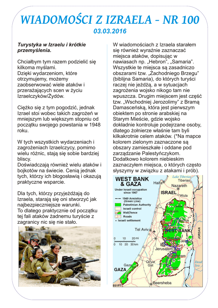 WIADOMOŚCI Z IZRAELA - NR 100 03.03.2016 Turystyka w Izraelu i krótkie przemyślenia. Chciałbym tym razem podzielić się kilkoma myślami. Dzięki wydarzeniom, które otrzymujemy, możemy zaobserwować wiele ataków i przerażających scen w życiu Izraelczyków/Żydów. Ciężko się z tym pogodzić, jednak Izrael stoi wobec takich zagrożeń w mniejszym lub większym stopniu od początku swojego powstania w 1948 roku. W tych wszystkich wydarzeniach i zagrożeniach Izraelczycy, pomimo wielu różnic, stają się sobie bardziej bliscy. Doświadczają również wielu ataków i bojkotów na świecie. Cenią jednak tych, którzy ich błogosławią i okazują praktyczne wsparcie. Dla tych, którzy przyjeżdżają do Izraela, starają się oni stworzyć jak najbezpieczniejsze warunki. To dlatego praktycznie od początku tej fali ataków żadnemu turyście z zagranicy nic się nie stało. W wiadomościach z Izraela starałem się również wyraźnie zaznaczać miejsca ataków, dopisując w nawiasach np. „Hebron”, „Samaria”. Wszystkie te miejsca są zasadniczo obszarami tzw. „Zachodniego Brzegu” (biblijna Samaria), do których turyści raczej nie jeżdżą, a w sytuacjach zagrożenia wojsko nikogo tam nie wpuszcza. Drugim miejscem jest część tzw. „Wschodniej Jerozolimy” z Bramą Damasceńską, która jest pierwszym obiektem po stronie arabskiej na Starym Mieście, gdzie wojsko dokładnie kontroluje podejrzane osoby, dlatego żołnierze właśnie tam byli kilkakrotnie celem ataków. (*Na mapce kolorem zielonym zaznaczone są obszary zamieszkałe i oddane pod zarządzanie Palestyńczykom. Dodatkowo kolorem niebieskim zaznaczyłem miejsca, o których często słyszymy w związku z atakami i prób). Gdy czyta się arabską prasę, najbardziej zdumiewające jest to, że Arabowie („Palestyńczycy”) narzekają i kompletnie nie rozumieją, dlaczego coraz mniej turystów ich odwiedza w sklepikach i kawiarenkach np. w Betlejem. Uważają, że to oczywiste i wszyscy powinni wiedzieć, iż ich celem są wyłącznie Żydzi. W swej „kulturze” i fanatyzmie uczą tego nawet małe dzieci i nie widzą nic złego w zabijaniu. Dlatego tak ważna jest nasza modlitwa o ten kraj i ludzi, którzy potrzebują zbawienia i pokoju w Mesjaszu. Cieszę się ogromnie, że możemy tworzyć grupę wierzących, którzy są zainteresowani Izraelem, narodem stanowiącym „źrenicę Bożego oka” (Zach. 2,12), z którym są związane obietnice i proroctwa – również te, które jeszcze się nie wypełniły, w tym wielkie przebudzenie i przyjście Mesjasza do Jerozolimy. Bóg nie skończył z Izraelem, tak jak nie skończył z nami (mimo że grzeszymy). On jest wierny i kochający. Ma swój plan dla Izraela i dla nas. Chce, byśmy błogosławili Izrael (I Mojż.12,3; IV Mojż. 22,12), pocieszali ich w trudnych sytuacjach (Iz. 40,1) i usilnie prosili o Pokój – Szalom dla Jerozolimy (Ps. 122). Jego planem jest również, byśmy stali razem połączeni w Mesjaszu, Lwie z pokolenia Judy, wszczepieni w jedno „Drzewo Oliwne” jako świadectwo Bożego działania dla całego świata. To połączenie jest pięknie wyrażone w Księdze Rut: „…lud twój – lud mój, a Bóg twój – Bóg mój”. Rut 1,16 Nie wspominając już o Księdze Zachariasza, która opisuje przyszłe świętowanie „Święta Namiotów” w Jerozolimie w czasach ostatecznych (Zach. 14,16-17). Tak więc widzimy, że Bóg również i nas zaprasza do swojej ziemi izraelskiej. Dlatego dobrze jest odwiedzić to szczególne w Bożych oczach miejsce i poznawać zarówno ten kraj, jak i jego mieszkańców (Zach. 8,2; Jer. 33,9). Pamiętajmy, że modlitwa ma moc! Widzimy to również w Bożym działaniu, ochronie i uzdrowieniu w Izraelu. Gdybyśmy kiedykolwiek mieli jakieś obawy, to nasz niebiański Ojciec aż 365 razy powtarza w swoim Słowie: „Nie bój się!” Bardzo dziękuję również wszystkim, którzy tak licznie włączyli się w akcję „Kartki dla Żołnierzy IDF”. Polecam się także waszym modlitwom, ponieważ od soboty przez ponad dwa tygodnie będę w Izraelu na wolontariacie. Niestety nie będę mógł tam używać internetu, ponieważ tym razem będę w bazie wojskowej, ale z cała pewnością opowiem tym wspaniałym żołnierzom, jak cudowną mamy grupę w Polsce, która modli się o nich i błogosławi. Załączam kilka fotografii niektórych miejsc w Izraelu. Ogród Getsemane Jerozolima, Wzgórze Świątynne Rzeka Jordan Galilea, szlaki turystyczne Pustynia Judzka na wiosnę Wiadomości oraz zdjęcia zebrał Jarosław Papiór Północna Galilea