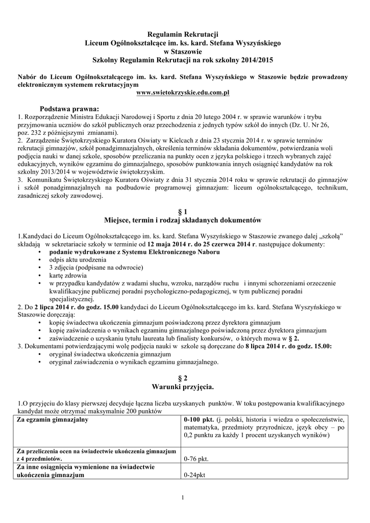 Regulamin Rekrutacji Liceum Ogólnokształcące im. ks. kard. Stefana Wyszyńskiego w Staszowie Szkolny Regulamin Rekrutacji na rok szkolny 2014/2015 Nabór do Liceum Ogólnokształcącego im. ks. kard. Stefana Wyszyńskiego w Staszowie będzie prowadzony elektronicznym systemem rekrutacyjnym www.swietokrzyskie.edu.com.pl Podstawa prawna: 1. Rozporządzenie Ministra Edukacji Narodowej i Sportu z dnia 20 lutego 2004 r. w sprawie warunków i trybu przyjmowania uczniów do szkół publicznych oraz przechodzenia z jednych typów szkół do innych (Dz. U. Nr 26, poz. 232 z późniejszymi zmianami). 2. Zarządzenie Świętokrzyskiego Kuratora Oświaty w Kielcach z dnia 23 stycznia 2014 r. w sprawie terminów rekrutacji gimnazjów, szkół ponadgimnazjalnych, określenia terminów składania dokumentów, potwierdzania woli podjęcia nauki w danej szkole, sposobów przeliczania na punkty ocen z języka polskiego i trzech wybranych zajęć edukacyjnych, wyników egzaminu do gimnazjalnego, sposobów punktowania innych osiągnięć kandydatów na rok szkolny 2013/2014 w województwie świętokrzyskim. 3. Komunikatu Świętokrzyskiego Kuratora Oświaty z dnia 31 stycznia 2014 roku w sprawie rekrutacji do gimnazjów i szkół ponadgimnazjalnych na podbudowie programowej gimnazjum: liceum ogólnokształcącego, technikum, zasadniczej szkoły zawodowej. §1 Miejsce, termin i rodzaj składanych dokumentów 1.Kandydaci do Liceum Ogólnokształcącego im. ks. kard. Stefana Wyszyńskiego w Staszowie zwanego dalej „szkołą” składają w sekretariacie szkoły w terminie od 12 maja 2014 r. do 25 czerwca 2014 r. następujące dokumenty: • podanie wydrukowane z Systemu Elektronicznego Naboru • odpis aktu urodzenia • 3 zdjęcia (podpisane na odwrocie) • kartę zdrowia • w przypadku kandydatów z wadami słuchu, wzroku, narządów ruchu i innymi schorzeniami orzeczenie kwalifikacyjne publicznej poradni psychologiczno-pedagogicznej, w tym publicznej poradni specjalistycznej. 2. Do 2 lipca 2014 r. do godz. 15.00 kandydaci do Liceum Ogólnokształcącego im ks. kard. Stefana Wyszyńskiego w Staszowie doręczają: • kopię świadectwa ukończenia gimnazjum poświadczoną przez dyrektora gimnazjum • kopię zaświadczenia o wynikach egzaminu gimnazjalnego poświadczoną przez dyrektora gimnazjum • zaświadczenie o uzyskaniu tytułu laureata lub finalisty konkursów, o których mowa w § 2. 3. Dokumentami potwierdzającymi wolę podjęcia nauki w szkole są doręczane do 8 lipca 2014 r. do godz. 15.00: • oryginał świadectwa ukończenia gimnazjum • oryginał zaświadczenia o wynikach egzaminu gimnazjalnego. §2 Warunki przyjęcia. 1.O przyjęciu do klasy pierwszej decyduje łączna liczba uzyskanych punktów. W toku postępowania kwalifikacyjnego kandydat może otrzymać maksymalnie 200 punktów Za egzamin gimnazjalny 0-100 pkt. (j. polski, historia i wiedza o społeczeństwie, matematyka, przedmioty przyrodnicze, język obcy – po 0,2 punktu za każdy 1 procent uzyskanych wyników) Za przeliczenia ocen na świadectwie ukończenia gimnazjum z 4 przedmiotów. 0-76 pkt. Za inne osiągnięcia wymienione na świadectwie ukończenia gimnazjum 0-24pkt 1 Przedmioty brane pod uwagę przy obliczaniu punktacji: język polski Dla wszystkich kandydatów matematyka język obcy nowożytny Dodatkowo Klasa o przedmiotach realizowanych w zakresie Informatyka lub fizyka rozszerzonym: matematyka, fizyka, informatyka Klasa o przedmiotach realizowanych w zakresie biologia lub chemia rozszerzonym: biologia, chemia, fizyka Klasa o przedmiotach realizowanych w zakresie wiedza o społeczeństwie lub historia rozszerzonym: język polski, historia, wiedza o społeczeństwie, j. łaciński i kultura antyczna Klasa o przedmiotach realizowanych w zakresie geografia lub informatyka rozszerzonym: matematyka, geografia, informatyka Punkty za oceny przeliczane będą według następującej skali: ocena celująca 19 pkt. ocena bardzo dobra 15 pkt. ocena dobra 10 pkt. ocena dostateczna 5 pkt. ocena dopuszczająca 2 pkt. Punktacja za inne osiągnięcia Świadectwo ukończenia gimnazjum z wyróżnieniem 5 punktów Potwierdzone osiągnięcia - co najmniej na szczeblu wojewódzkim w konkursach wiedzy organizowanych przez Kuratora Oświaty lub zajęcie od 1 do 3 miejsca w konkursach tematycznych na szczeblu woj. organizowanych przez szkoły: § finaliści jednego konkursu przedmiotowego § finaliści dwóch lub więcej konkursów przedmiotowych Potwierdzone osiągnięcia sportowe § na szczeblu powiatowym (rejonowym) § co najmniej na szczeblu wojewódzkim Potwierdzone osiągnięcia artystyczne § na szczeblu powiatowym (rejonowym) § co najmniej na szczeblu wojewódzkim 4 punkty 7 punktów 2 punkty 3 punkty 2 punkty 3 punkty Osiągnięcia w aktywności na rzecz innych ludzi, zwłaszcza formie wolontariatu rozumianym jako systematyczna, dobrowolna (co najmniej w okresie półrocznym), udokumentowana działalność wykonywana ochotniczo i bez wynagrodzenia, np. aktywna współpraca z domem dziecka, hospicjum, schroniskiem dla zwierząt, organizacjami charytatywnymi itp. 2 punkty 2. Konkursami organizowanymi przez Świętokrzyskiego Kuratora Oświaty są konkursy przedmiotowe dla gimnazjalistów: języka polskiego, języka angielskiego, języka niemieckiego, języka rosyjskiego, matematyki, chemii, fizyki, biologii, geografii, historii, informatyki. 3. Laureaci i finaliści ogólnopolskich olimpiad przedmiotowych oraz laureaci konkursów o zasięgu wojewódzkim i ponadwojewódzkim, których program obejmuje w całości lub poszerza treści podstawy programowej co najmniej jednego przedmiotu, przyjmowani są do Liceum Ogólnokształcącego im. ks. kard. Stefana Wyszyńskiego w Staszowie niezależnie od kryteriów, o których mowa w § 2 pkt 1. 4. Maksymalna liczba punktów możliwych do uzyskania łącznie wynosi 200. 5. Do szkoły zostaną przyjęci kandydaci, którzy uzyskali w kolejności największą ilość punktów. 2 6. Szkolna K