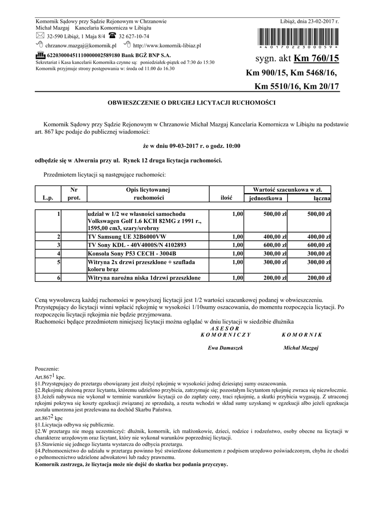 Sprawa KM 1214/15 - Kancelaria Komornicza w Libiążu