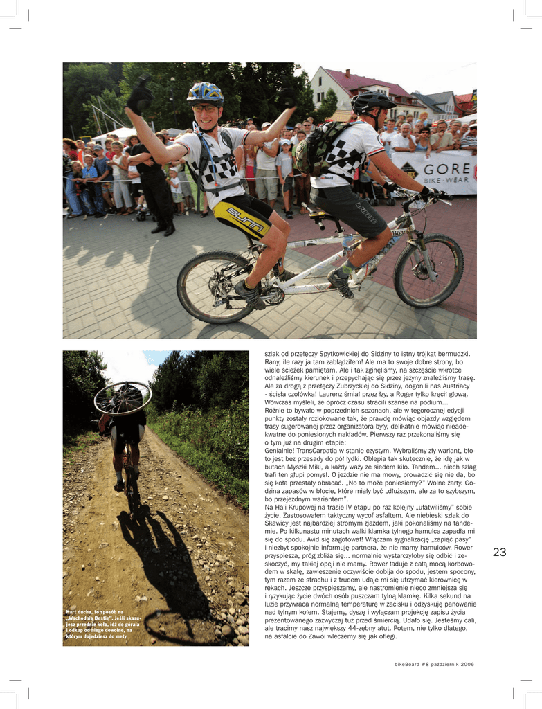 Hart ducha, to sposób na „Wschodnią Bestię”. Jeśli skasujesz przednie koło, idź do górala i odkup od niego dowolne, na którym dojedziesz do mety szlak od przełęczy Spytkowickiej do Sidziny to istny trójkąt bermudzki. Rany, ile razy ja tam zabłądziłem! Ale ma to swoje dobre strony, bo wiele ścieżek pamiętam. Ale i tak zginęliśmy, na szczęście wkrótce odnaleźliśmy kierunek i przepychając się przez jeżyny znaleźliśmy trasę. Ale za drogą z przełęczy Zubrzyckiej do Sidziny, dogonili nas Austriacy - ścisła czołówka! Laurenz śmiał przez łzy, a Roger tylko kręcił głową. Wówczas myśleli, że oprócz czasu stracili szanse na podium... Różnie to bywało w poprzednich sezonach, ale w tegorocznej edycji punkty zostały rozlokowane tak, że prawdę mówiąc objazdy względem trasy sugerowanej przez organizatora były, delikatnie mówiąc nieadekwatne do poniesionych nakładów. Pierwszy raz przekonaliśmy się o tym już na drugim etapie: Genialnie! TransCarpatia w stanie czystym. Wybraliśmy zły wariant, błoto jest bez przesady do pół łydki. Oblepia tak skutecznie, że idę jak w butach Myszki Miki, a każdy waży ze siedem kilo. Tandem... niech szlag trafi ten głupi pomysł. O jeździe nie ma mowy, prowadzić się nie da, bo się koła przestały obracać. „No to może poniesiemy?” Wolne żarty. Godzina zapasów w błocie, które miały być „dłuższym, ale za to szybszym, bo przejezdnym wariantem”. Na Hali Krupowej na trasie IV etapu po raz kolejny „ułatwiliśmy” sobie życie. Zastosowałem taktyczny wycof asfaltem. Ale niebieski szlak do Skawicy jest najbardziej stromym zjazdem, jaki pokonaliśmy na tandemie. Po kilkunastu minutach walki klamka tylnego hamulca zapadła mi się do spodu. Avid się zagotował! Włączam sygnalizację „zapiąć pasy” i niezbyt spokojnie informuję partnera, że nie mamy hamulców. Rower przyspiesza, próg zbliża się... normalnie wystarczyłoby się odbić i zeskoczyć, my takiej opcji nie mamy. Rower ładuje z całą mocą korbowodem w skałę, zawieszenie oczywiście dobija do spodu, jestem spocony, tym razem ze strachu i z trudem udaje mi się utrzymać kierownicę w rękach. Jeszcze przyspieszamy, ale nastromienie nieco zmniejsza się i ryzykując życie dwóch osób puszczam tylną klamkę. Kilka sekund na luzie przywraca normalną temperaturę w zacisku i odzyskuję panowanie nad tylnym kołem. Stajemy, dyszę i wyłączam projekcję zapisu życia prezentowanego zazwyczaj tuż przed śmiercią. Udało się. Jesteśmy cali, ale tracimy nasz największy 44-zębny atut. Potem, nie tylko dlatego, na asfalcie do Zawoi wleczemy się jak oflegi. bi k e Boa r d # 8 p a ź d z ie r n ik 2 0 0 6 23