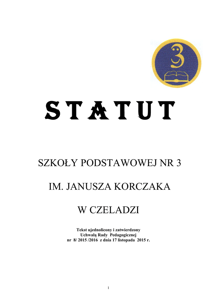 STATUT SZKOŁY PODSTAWOWEJ NR 3 IM. JANUSZA KORCZAKA W CZELADZI Tekst ujednolicony i zatwierdzony Uchwałą Rady Pedagogicznej nr 8/ 2015 /2016 z dnia 17 listopada 2015 r. 1 Spis treści Rozdział I Informacje o Szkole…………………………………………. str. 4 Rozdział II Cele i zadania szkoły ……………………………………….. str. 5 Rozdział III Organy szkoły ……………………………………………… str. 7 Rozdział IV Organizacja szkoły ……………………………………….. str. 13 Rozdział V Nauczyciele i inni pracownicy szkoły …………………….. str. 20 Rozdział VI Uczniowie szkoły …………………………………………. str. 25 Rozdział VII WSO ……………………………………………………… str. 26 Rozdział VIII Prawa i obowiązki rodziców/ prawnych opiekunów …. str. 53 Rozdział IX Prawa i obowiązki uczniów ………………………………. str. 55 Rozdział X Nagrody i kary ………………………………………………str. 57 Rozdział XI Postanowienia końcowe …………………………………... str. 59 2 STATUT SZKOŁY Podstawa prawna: 1. Ustawa z dnia 7 września 1991 r. o systemie oświaty (tekst jednolity Dz. U. z 2004r. Nr 256, poz. 2572 , z późn. zm.) oraz akty wykonawcze wydane na jej podstawie. 2. Ustawy z dnia 8 stycznia 1999 r. - Przepisy wprowadzające reformę ustroju szkolnego (Dz. U. z 1999 r Nr 12 poz. 96) 3. Ustawa z dnia 26 stycznia 1982 r. - Karta Nauczyciela (tekst jednolity Dz. U. z 2014 r. , poz. 191, z późn. zm.). 4. Rozporządzenie MEN z dnia 21 maja 2001 r. w sprawie ramowych statutów publicznego przedszkola oraz publicznych szkół . ( Dz. U. z 2001r. nr 61 , poz. 624 z późniejszymi zmianami). 5. Konwencji Praw Dziecka - ratyfikowana przez Polskę 30.04.1991 r. (Dz. U. Nr 120 poz. 526 i 527 z 1991 r.) 6. Rozporządzenia Ministra Edukacji Narodowej z dnia 10 czerwca 2015 r. w sprawie szczegółowych warunków i sposobu oceniania, klasyfikowania i promowania uczniów i słuchaczy w szkołach publicznych. (Dz. U. z 2015r., poz. 843.) 7. Rozporządzenie Ministra Edukacji Narodowej z dnia 7 lutego 2012 r. w sprawie ramowych planów nauczania w szkołach publicznych (Dz. U. z 2012 r., poz. 204 z późn. zm.). 8. Rozporządzenie Ministra Edukacji Narodowej z dnia 25 czerwca 2015 r. w sprawie szczegółowych warunków i sposobu przeprowadzania sprawdzianu, egzaminu gimnazjalnego i egzaminu maturalnego (Dz. U. z 2015 r. , poz. 959). 9. Rozporządzenie Ministra Edukacji Narodowej z dnia 30 kwietnia 2013 r. w sprawie zasad udzielania i organizacji pomocy psychologiczno-pedagogicznej w publicznych przedszkolach, szkołach i placówkach (Dz. U. z 2013, poz. 532) 10. Rozporządzenie Ministra Edukacji Narodowej z dnia 24 lipca 2015 r. w sprawie warunków organizowania kształcenia, wychowania i opieki dla dzieci i młodzieży niepełnosprawnych, niedostosowanych społecznie i zagrożonych niedostosowaniem społecznym (Dz. U. z 2015, poz. 1113) 3 NAZWA SZKOŁY §1 Szkoła Podstawowa nr 3 im. Janusza Korczaka w Czeladzi, ul. Staszica 47 §2 1. Nazwa jest używana przez szkołę w pełnym brzmieniu. 2. Na pieczęciach i stemplach może być używany czytelny skrót nazwy. 3. W szkole używane są także pieczątki organów szkoły. Rozdział I INFORMACJE O SZKOLE §3 1. Organem prowadzącym szkołę jest Gmina Czeladź. 2. Organem sprawującym nadzór pedagogiczny jest Kuratorium Oświaty w Katowicach. 3. Czas kształcenia trwa sześć lat i podzielony jest na dwa etapy dostosowane do okresów rozwojowych dziecka: etap I – klasy I - III, etap II – klasy IV - VI. 4. W szkole działa świetlica, stołówka szkolna z zapleczem kuchennym i biblioteka szkolna. 6. W szkole utworzone są oddziały integracyjne. 7. Dopuszcza się możliwość organizowania na terenie szkoły , przez podmioty spoza szkoły, zajęć odpłatnych dla uczniów, po uzyskaniu pozytywnej opinii Rady Rodziców. 8. W szkole mogą być prowadzone innowacje pedagogiczne i eksperymenty ( regulacja odrębnymi przepisami ). 4 §4 1. Ilekroć jest mowa o Statucie należy rozumieć przez to Statut Szkoły Podstawowej nr 3 im. Janusza Korczaka w Czeladzi 2. Ilekroć w Statucie jest mowa o szkole, należy przez to rozumieć Szkołę Podstawową nr 3 im. Janusza Korczaka w Czeladzi 3. Ilekroć w Statucie jest mowa o rodzicach, należy przez to rozumieć ogół rodziców wszystkich uczniów Szkoły oraz opiekunów prawnych wszystkich uczniów szkoły. 4. Ilekroć w Statucie jest mowa o organach szkoły, należy przez to rozumieć odpowiednio: 1) Dyrektora Szkoły 2) Radę Pedagogiczną 3) Radę Rodziców 4) Radę Samorządu Uczniowskiego Rozdział II CELE I ZADANIA SZKOŁY §5 1. Nadrzędnym celem szkoły jest wszechstronny rozwój ucznia , wspomagany przez integralnie pojmowane nauczanie , kształcenie umiejętności i wychowanie oraz opieka nad nim. W szczególności : 1) Wyposażenie w wiedzę i umiejętności , aby w ten sposób przygotować ucznia do dorosłego życia w warunkach współczesnego świata. 2) Wspieranie rodziców w dziedzinie wychowania z zachowaniem spójności działań wychowawczych pomiędzy szkołą a rodziną. 3) Profilaktyka niedostosowania społecznego i zapobieganie niepowodzeniom szkolnym. 4) Sprawowanie opieki nad uczniem odpowiednio do istniejących potrzeb. §6 1. Wspomagając rozwój dziecka , uznając jego podmiotowość i wprowadzając je w życie społeczne szkoła spełnia następujące zadania : 1) Wyposaża ucznia w gruntowną wiedzę i umiejętności. 2) Organizuje w ramach planu zajęć lekcyjnych naukę religii i etyki dla uczniów , których rodzice wyrażają takie życzenie. 3) Zapewnia w ramach swoich możliwości opiekę nad uczniami szczególnie uzdolnionymi , poprzez tworzenie kół artystycznych , przedmiotowych i zainteresowań. Na wniosek ucznia, rodziców (prawnych opiekunów), wychowawcy lub nauczyciela prowadzącego zajęcia eduka