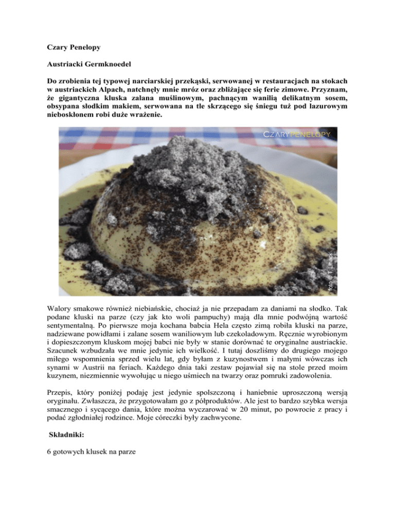 Czary Penelopy Austriacki Germknoedel Do zrobienia tej typowej narciarskiej przekąski, serwowanej w restauracjach na stokach w austriackich Alpach, natchnęły mnie mróz oraz zbliżające się ferie zimowe. Przyznam, że gigantyczna kluska zalana muślinowym, pachnącym wanilią delikatnym sosem, obsypana słodkim makiem, serwowana na tle skrzącego się śniegu tuż pod lazurowym nieboskłonem robi duże wrażenie. Walory smakowe również niebiańskie, chociaż ja nie przepadam za daniami na słodko. Tak podane kluski na parze (czy jak kto woli pampuchy) mają dla mnie podwójną wartość sentymentalną. Po pierwsze moja kochana babcia Hela często zimą robiła kluski na parze, nadziewane powidłami i zalane sosem waniliowym lub czekoladowym. Ręcznie wyrobionym i dopieszczonym kluskom mojej babci nie były w stanie dorównać te oryginalne austriackie. Szacunek wzbudzała we mnie jedynie ich wielkość. I tutaj doszliśmy do drugiego mojego miłego wspomnienia sprzed wielu lat, gdy byłam z kuzynostwem i małymi wówczas ich synami w Austrii na feriach. Każdego dnia taki zestaw pojawiał się na stole przed moim kuzynem, niezmiennie wywołując u niego uśmiech na twarzy oraz pomruki zadowolenia. Przepis, który poniżej podaję jest jedynie spolszczoną i haniebnie uproszczoną wersją oryginału. Zwłaszcza, że przygotowałam go z półproduktów. Ale jest to bardzo szybka wersja smacznego i sycącego dania, które można wyczarować w 20 minut, po powrocie z pracy i podać zgłodniałej rodzince. Moje córeczki były zachwycone. Składniki: 6 gotowych klusek na parze powidła śliwkowe (u mnie domowe powidła śliwkowo-czekoladowe, na które przepis Wam już podałam) zmielony w młynku mak niebieski wymieszany z cukrem pudrem 3 szklanki mleka 3 łyżki cukru 1 budyń waniliowy Przygotowanie: W kluskach za pomocą szpikulca wydrążyłam dziurę (robiąc tym samym w środku miejsce na powidła), następnie szprycą cukierniczą wstrzyknęłam je do środka. Budyń przygotowałam wg instrukcji na opakowaniu, z tą tylko różnicą, że użyłam do tego 3 a nie 2 szklanki mleka i 3 łyżki cukru. Ma powstać raczej płynny, ale nie za rzadki sos waniliowy. Ugotowałam wodę w garnku, umieściłam w nim sito do gotowania na parze. Nadziane kluchy umieściłam na sicie nad wrzątkiem i gotowałam 3-4 minuty. Na talerz nalałam 1 chochelkę sosu waniliowego, na nim ułożyłam pampucha, czyli germknödla i posypałam obficie zmielonym makiem, wymieszanym z cukrem pudrem i cukrem waniliowym. Zamiast sosu waniliowego można kluchę polać roztopionym masłem i obficie posypać słodkim makiem. Smacznego! Penelopa Rybarkiewicz-Szmajduch
