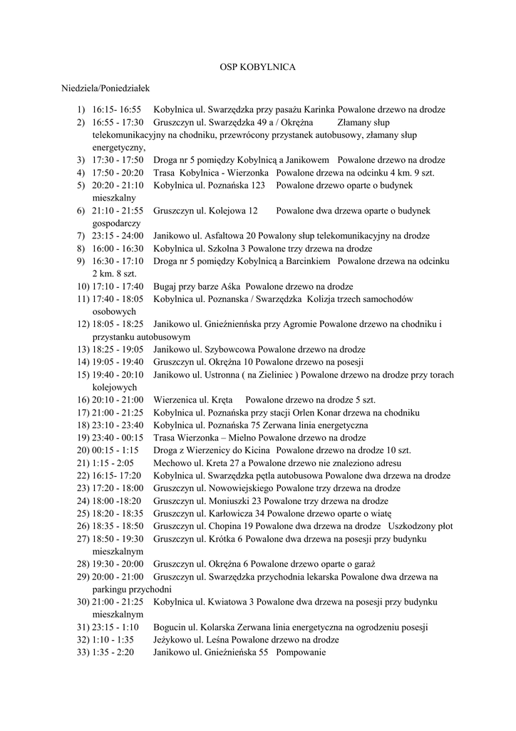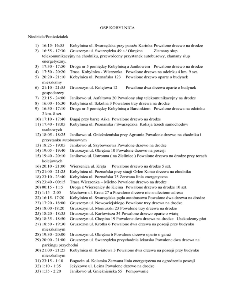 OSP KOBYLNICA Niedziela/Poniedziałek 1) 16:15- 16:55 Kobylnica ul. Swarzędzka przy pasażu Karinka Powalone drzewo na drodze 2) 16:55 - 17:30 Gruszczyn ul. Swarzędzka 49 a / Okrężna Złamany słup telekomunikacyjny na chodniku, przewrócony przystanek autobusowy, złamany słup energetyczny, 3) 17:30 - 17:50 Droga nr 5 pomiędzy Kobylnicą a Janikowem Powalone drzewo na drodze 4) 17:50 - 20:20 Trasa Kobylnica - Wierzonka Powalone drzewa na odcinku 4 km. 9 szt. 5) 20:20 - 21:10 Kobylnica ul. Poznańska 123 Powalone drzewo oparte o budynek mieszkalny 6) 21:10 - 21:55 Gruszczyn ul. Kolejowa 12 Powalone dwa drzewa oparte o budynek gospodarczy 7) 23:15 - 24:00 Janikowo ul. Asfaltowa 20 Powalony słup telekomunikacyjny na drodze 8) 16:00 - 16:30 Kobylnica ul. Szkolna 3 Powalone trzy drzewa na drodze 9) 16:30 - 17:10 Droga nr 5 pomiędzy Kobylnicą a Barcinkiem Powalone drzewa na odcinku 2 km. 8 szt. 10) 17:10 - 17:40 Bugaj przy barze Aśka Powalone drzewo na drodze 11) 17:40 - 18:05 Kobylnica ul. Poznanska / Swarzędzka Kolizja trzech samochodów osobowych 12) 18:05 - 18:25 Janikowo ul. Gnieźnienńska przy Agromie Powalone drzewo na chodniku i przystanku autobusowym 13) 18:25 - 19:05 Janikowo ul. Szybowcowa Powalone drzewo na drodze 14) 19:05 - 19:40 Gruszczyn ul. Okrężna 10 Powalone drzewo na posesji 15) 19:40 - 20:10 Janikowo ul. Ustronna ( na Zieliniec ) Powalone drzewo na drodze przy torach kolejowych 16) 20:10 - 21:00 Wierzenica ul. Kręta Powalone drzewo na drodze 5 szt. 17) 21:00 - 21:25 Kobylnica ul. Poznańska przy stacji Orlen Konar drzewa na chodniku 18) 23:10 - 23:40 Kobylnica ul. Poznańska 75 Zerwana linia energetyczna 19) 23:40 - 00:15 Trasa Wierzonka – Mielno Powalone drzewo na drodze 20) 00:15 - 1:15 Droga z Wierzenicy do Kicina Powalone drzewo na drodze 10 szt. 21) 1:15 - 2:05 Mechowo ul. Kreta 27 a Powalone drzewo nie znaleziono adresu 22) 16:15- 17:20 Kobylnica ul. Swarzędzka pętla autobusowa Powalone dwa drzewa na drodze 23) 17:20 - 18:00 Gruszczyn ul. Nowowiejskiego Powalone trzy drzewa na drodze 24) 18:00 -18:20 Gruszczyn ul. Moniuszki 23 Powalone trzy drzewa na drodze 25) 18:20 - 18:35 Gruszczyn ul. Karłowicza 34 Powalone drzewo oparte o wiatę 26) 18:35 - 18:50 Gruszczyn ul. Chopina 19 Powalone dwa drzewa na drodze Uszkodzony płot 27) 18:50 - 19:30 Gruszczyn ul. Krótka 6 Powalone dwa drzewa na posesji przy budynku mieszkalnym 28) 19:30 - 20:00 Gruszczyn ul. Okrężna 6 Powalone drzewo oparte o garaż 29) 20:00 - 21:00 Gruszczyn ul. Swarzędzka przychodnia lekarska Powalone dwa drzewa na parkingu przychodni 30) 21:00 - 21:25 Kobylnica ul. Kwiatowa 3 Powalone dwa drzewa na posesji przy budynku mieszkalnym 31) 23:15 - 1:10 Bogucin ul. Kolarska Zerwana linia energetyczna na ogrodzeniu posesji 32) 1:10 - 1:35 Jeżykowo ul. Leśna Powalone drzewo na drodze 33) 1:35 - 2:20 Janikowo ul. Gnieźnieńska 55 Pompowanie Poniedziałek 1) 6:40 - 7:20 Janikowo ul. Gnieźnieńska 77 Powalone dwa drzewa oparte o budynek mieszkalny 2) 7:20 - 8:50 Poznań ul. Kołodzieja 18 Ułamany konar na przewodach energetycznych 3) 8:50 - 9:10 Uzarzewo monitoring Monitoring Muzeum Łowiectwa 4) 9:10 - 9:30 Wierzenica ul. Lisia 5 ( nad stawami 5 ) Konar drzewa zwisający nad drogą 5) 9:30 - 10:15 Mechowo ul. Kręta 14a / 27 działki Pochylone drzewo na budynek mieszkalny 6) 10:15 - 10:50 Katarzynki ul. Glebowa Powalone dwa drzewa na drodze 7) 10:50 - 14:35 Kobylnica ul. Swarzędzka 13 Powalone drzewo na płocie 8) 13:25 - 13:50 Uzarzewo monitoring Monitoring Muzeum Łowiectwa 9) 16:05 - 18:35 Kobylnica ul. Poznańska 45 Uszkodzony komin 10) 20:50 - 23:35 Kobylnica Poznanska / Swarzedzka przy placu zabaw Pochylone drzewo na słup energetyczny 11) 23:35 - 00:25 Gruszczyn ul. Rumiankowa 9 Pochylone drzewo na budynek mieszkalny 12) 11:15 - 12:35 Kobylnica ul. Swarzędzka 13 Powalone drzewo na płocie 13) 12:35 - 13:30 Kobylnica ul. Szkolna 3 Powalone dwa drzewa przy budynku mieszkalnym 14) 13:30 - 16:05 Kobylnica ul. Poznańska 50 Powalone piec drzew na placu zabaw przy szkole podstawowej 15) 21:50 - 23:15 Kobylnica ul. Poznanska 91 Drzewo oparte o budynek 16) 23:15 - 00:00 Bogucin ul. Boczna 9 Drzewo pochylone nad liniami 17) 6:40 - 7:20 Janikowo ul. Gnieźnieńska 77 Powalone dwa drzewa oparte o budynek mieszkalny 18) 7:20 - 9:40 Poznań ul. Kołodzieja 18 Ułamany konar na przewodach energetycznych 19) 10:00 - 10:25 Poznań ul. Głuwna / Nadolna Powalone drzewo na przystanek autobusowy 20) 10:25 - 10:40 Poznań ul. Krańcowa 49 Ułamany konar przy budynku mieszkalnym 21) 10:40 - 11:10 Poznań ul. Kostrzyńska 15 Drzewo nad wejściem do budynku OSP SWARZĘDZ Niedziela/Poniedziałek 1) 17:10-18:45 Gortatowo, Swarzędzka 17, zerwany dach 2) 18:45-21:20 Gortatowo, Dożynkowo 30, drzewa oparte o budynki 3) 21:20-22:50 Gortatowo Dożynkowa powalone 6 drzew 4) 22:50-01:10 Gruszczyn, Łąkowa 6, drzewo na budynku 5) 00:25-01:10 Swarzędz, Rabowicka , zalany magazyn Poniedziałek 1) 11:45-12:05 Kosynierów, zalana stacja transformatorowa – bez działań 2) 13:25-14:45 Kobylnica, Poznańska, pożar trawy 3) 14:45-15:05 Zapłocie, pomoc pogotowiu 4) 15:05-23:00 Kobylnica, Poznańska 91, drzewo na budynku 5) 19:20-21:15 Poznań, Arkońska, drzewo pochylone na budynek 6) 23:00-00:15 Gruszczyn, Ukośna, zwisający konar 7) 23:00-00:20 Gruszczyn, Chopina, konar na budynku