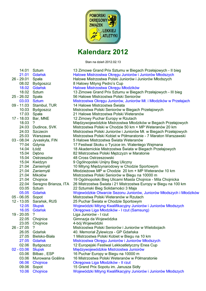 Kalendarz 2012 Stan na dzień 2012.02.13 14.01 21.01 26 - 29.01 08.02 18.02 18.02 25 - 26.02 03.03 09 - 11.03 10.03 17.03 17 - 18.03 18.03 24.03 24.03 25.03 03 - 08.04 ??.04 14.04 15.04 15.04 15.04 21.04 21.04 21.04 21.04 22.04 03.05 05.05 05 - 06.05 12 - 13.05 12.05 16.05 19 - 20.05 22.05 23.05 26 - 27.05 26.05 27.05 27.05 02.06 02 - 03.06 03.06 03.06 06.06 09.06 10.06 Sztum Gdańsk Spała Bydgoszcz Gdańsk Sztum Spała Sztum Stambuł, TUR Bydgoszcz Spała Bar, MNE ? Dudince, SVK Szczecin Warszawa Jyvaskyla, FIN Gdynia Łódź Dębno Ostrzeszów Kwidzyn Zaniemyśl Zaniemyśl Mikołów Chojnice Seregno Brianza, ITA Sztum Gdańsk Sopot Sarańsk, RUS Słupsk Gdańsk ? Chojnice Chojnice ? Gdańsk Bielsko-Biała Gdańsk Bydgoszcz Słupsk Bilbao , ESP Murowana Goślina Chojnice Sopot Chojnice 13 Zimowe Grand Prix Sztumu w Biegach Przełajowych - II bieg Halowe Mistrzostwa Okręgu Juniorów i Juniorów Młodszych Halowe Mistrzostwa Polski Juniorów i Juniorów Młodszych 8 Halowy Mityng Pedro’s Cup Halowe Mistrzostwa Okręgu Młodzików 13 Zimowe Grand Prix Sztumu w Biegach Przełajowych - III bieg 56 Halowe Mistrzostwa Polski Seniorów Mistrzostwa Okręgu Juniorów, Juniorów Mł. i Młodzików w Przełajach 14 Halowe Mistrzostwa Świata Mistrzostwa Polski Seniorów w Biegach Przełajowych 21 Halowe Mistrzostwa Polski Weteranów 12 Zimowy Puchar Europy w Rzutach Międzywojewódzkie Mistrzostwa Młodzików w Begach Przełajowych Mistrzostwa Polski w Chodzie 50 km + MP Weteranów 20 km Mistrzostwa Polski Juniorów i Juniorów Mł. w Biegach Przełajowych Mistrzostwa Polski Kobiet w Półmaratonie - 7 Maraton Warszawski 5 Halowe Mistrzostwa Świata Weteranów 17 Festiwal Skoku o Tyczce im. Walentego Wejmana 18 Akademickie Mistrzostwa Świata w Biegach Przełajowych 82 Mistrzostwa Polski Mężczyzn w Maratonie 48 Cross Ostrzeszowski 9 Ogólnopolski Unijny Bieg Uliczny 10 Mityng Międzynarodowy w Chodzie Sportowym Młodzieżowe MP w Chodzie 20 km + MP Weteranów 10 km Mistrzostwa Polski Seniorów w Biegu na 10000 m 19 Ogólnopolski Bieg Ulicami Miasta Chojnice - Mila Chojnicka 26 Mistrzostwa Świata i 21 Mistrzostwa Europy w Biegu na 100 km 22 Sztumski Bieg Solidarności 3 Maja Wojewódzkie Otwarcie Sezonu Juniorów, Juniorów Młodszych i Młodzików Mistrzostwa Polski Weteranów w Rzutach 25 Puchar Świata w Chodzie Sportowym Wojewódzki Mityng Kwalifikacyjny Juniorów i Juniorów Młodszych Okręgowa Liga Młodzików - I rzut (Samsung) Liga Juniorów - I rzut Gimnazja da Wojewódzka 4-bój Wojewódzki Mistrzostwa Polski Seniorów i Juniorów w Wielobojach 40. Memoriał Żylewicza - GP Gdańska 1 Mistrzostwa Polski Kobiet w Biegu na 10 km Mistrzostwa Okręgu Juniorów i Juniorów Młodszych 12 Europejski Festiwal Lekkoatletyczny Enea Cup Międzywojewódzkie Mistrzostwa Juniorów 16 Puchar Europy w Biegu na 10000 m 16 Mistrzostwa Polski Weteranów w Półmaratonie Okręgowa Liga Młodzików - II rzut 15 Grand Prix Sopotu im. Janusza Sidły Wojewódzki Mityng Kwalifikacyjny Juniorów i Juniorów Młodszych 12.06 15 - 17.06 16.06 16.06 17.06 20.06 22 - 24.06 27.06 - 01.07 30.06 - 01.07 07.07 07.07 10 - 15.07 11.07 20 - 22.07 21.07 28.07 03 - 12.08 04.08 11.08 16 - 25.08 19.08 25.08 25.08 01 - 02.09 01.09 01.09 02.09 02.09 08 - 09.09 08.09 09.09 08.09 15.09 15 - 16.09 .09 22.09 22.09 22.09 29 - 30.09 30.09 06.10 06.10 24.11 09.12 Chojnice Bielsko-Biała Koszalin Starogard Gdański Lębork Cetniewo Białystok Helsinki, FIN Białystok Denizli, TUR Puck Barcelona, ESP Gdańsk Kraków Szczecin Puck Londyn, GBR Gdańsk Sopot Zittau, GER Warszawa Toruń Chojnice Radom Gdańsk Gdańsk Słupsk Ponte di Legno, ITA Katowice Krynica Górska Piła Gdańsk Pasłęk do ustalenia do ustalenia ? Sopot Słupsk Słubice Warszawa Kawama, BUL Niezabyszewo Olszyna Budapeszt, HUN Licealiada Wojewódzka 88 Mistrzostwa Polski Seniorów Mistrzostwa Polski Weteranów w 5-boju Wojewódzki Mityng Kwalifikacyjny Juniorów i Juniorów Młodszych 26 Mistrzostwa Polski Weteranów w Maratonie 4 Dysk Pomorski Mistrzostwa Polski Juniorów 21 Mistrzostwa Europy 22 Mistrzostwa Polski Weteranów 11 Mistrzostwa Europy w Biegach Górskich 10 Otwarte Mistrzostwa Ziemi Puckiej w 4-boju Rzutowym + Chód 3000 m 14 Mistrzostwa Świata Juniorów Mityng Ogólnopolski 18 Ogólnopolska Olimpiada Młodzieży 58 Memoriał Janusza Kusocińskiego 4 Półmaraton Ziemi Puckiej 30 Igrzyska Olimpijskie 3 Mistrzostwa Polski Mężczyzn w Biegu na 10 km + 19 Bieg św. Dominika Tyczka na molo 18 Mistrzostwa Europy Weteranów 3 Memoriał Kamili Skolomowskiej Memoriał im. Grzegorza Duneckiego w 3-boju Sprinterskim Mityng Ogólnopolski 29 Młodzieżowe Mistrzostwa Polski 48 Puchar Obrońców Poczty Polskiej w Chodzie Sportowym Mistrzostwa Polski Juniorów w Chodzi 20 km + MP Weteranów 5 km Mistrzostwa Okręgu Młodzików 28 Mistrzostwa Świat w Biegach Górskich 10 Mistrzostwa Świata w Biegu 24 godzinnym Mistrzostwa Polski Weteranów w Biegu na 10 km Mistrzostwa Polski Mężczyzn w Półmaratonie Mityng Ogólnopolski Młodzieżowe Mistrzostwa Polski w Biegu na 10000 m Międzywojewódzkie Mistrzostwa Młodzików Międzywojewódzki Mecz Juniorów: Poznań - Gdańsk - Bydgoszcz Liga Juniorów - Finał 12 Puchar Bałtyku Weteranów Wojewódzkie Zakończenie Sezonu Mały Memoriał Janusza Kusocińskiego - Mistrzostwa Polski Młodzików 32 Mistrzostwa Polski Kobiet w Maratonie - 34 Maraton Warszawski 18 Mistrzostwa Świata w Półmaratonie 25 Jubileuszowy Bieg Rodła Młodzieżowe Mistrzostwa Polski w Biegach Przełajowych 19 Mistrzostwa Europy w Biegach Przełajowych