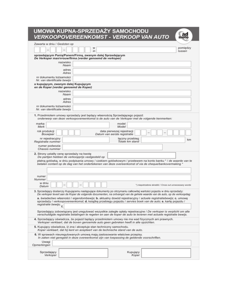 UMOWA KUPNA-SPRZEDA¯Y SAMOCHODU VERKOOPOVEREENKOMST - VERKOOP VAN AUTO Zawarta w dniu / Gesloten op _ _ pomiêdzy tussen w in sprzedaj¹cym Pani¹/Panem/Firm¹, zwanym dalej Sprzedaj¹cym De Verkoper man/vrouw/firma (verder genoemd de verkoper) nazwisko Naam adres Adres nr dokumentu to¿samoœci Nr. van identificatie bewijs a kupuj¹cym, zwanym dalej Kupuj¹cym en de Koper (verder genoemd de Koper) nazwisko Naam adres Adres nr dokumentu to¿samoœci Nr. van identificatie bewijs 1. Przedmiotem umowy sprzeda¿y jest bêd¹cy w³asnoœci¹ Sprzedaj¹cego pojazd: onderwerp van deze verkoopovereenkomst is de auto van de Verkoper met de volgende kenmerken: marka Merk model Model rok produkcji Bouwjaar data pierwszej rejestracji Datum van eerste registratie _ _ ³¹czny przebieg Totale km stand nr rejestracyjny Registratie nummer km numer podwozia Chassis nummer 2. Strony ustali³y cenê sprzeda¿y na kwotê De partijen hebben de verkoopprijs vastgesteld op p³atn¹ gotówk¹, w dniu podpisania umowy / czekiem gotówkowym / przelewem na konto banku * / de waarde van te betalen contant op de dag van het ondertekenen van deze overeenkomst of via de cheque/bankovermaking * numer Nummer w dniu Datum _ _ *) niepotrzebne skreœliæ / Cross out unnecessary words 3. Sprzedaj¹cy dostarczy Kupuj¹cemu nastêpuj¹ce dokumenty po otrzymaniu ca³kowitej wartoœci pojazdu w dniu sprzeda¿y: De verkoper levert aan de Koper de volgende documenten, na ontvangst van de gehele waarde van de auto, op de verkoopdag: a. œwiadectwo w³asnoœci / eigendombewijs; b. aktualny dowód rejestracyjny / actuele registratiebewijs; c. umowê sprzeda¿y / verkoopovereenkomst; d. ksi¹¿kê przebiegu pojazdu / servies boek van de auto; e. kartê pojazdu / registratie bewijs; f. Sprzedaj¹cy zobowi¹zany jest uregulowaæ wszystkie zaleg³e op³aty rejestracyjne / De verkoper is verplicht om alle verschuldigde registratie betalingen te regelen en aan de koper de auto te leveren met actuele registratie bewijs. 4. Sprzedaj¹cy oœwiadcza, ¿e pojazd bêd¹cy przedmiotem umowy nie ma wad fizycznych ani prawnych. Verkoper verklaart, dat de boven genoemde auto geen gebreken heeft in alle opzichten. 5. Kupuj¹cy oœwiadcza, i¿ zna i akceptuje stan techniczny samochodu. Koper verklaart, dat hij kent en acepteert van de technische stand van de auto. 6. W sprawach nieuregulowanych umow¹ maj¹ zastosowanie w³aœciwe przepisy. In zaken niet geregeld in deze overeenkomst zijn van toepassing de geldende voorschriften. Uwagi Opmerkingen . Sprzedaj¹cy Verkoper Kupuj¹cy Koper