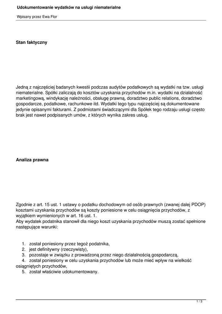 Udokumentowanie wydatków na usługi niematerialne Wpisany przez Ewa Flor Stan faktyczny Jedną z najczęściej badanych kwestii podczas audytów podatkowych są wydatki na tzw. usługi niematerialne. Spółki zaliczają do kosztów uzyskania przychodów m.in. wydatki na działalność marketingową, windykację należności, obsługę prawną, doradztwo public relations, doradztwo gospodarcze, podatkowe, rachunkowe itd. Wydatki tego typu najczęściej są dokumentowane jedynie opisanymi fakturami. Z podmiotami świadczącymi dla Spółek tego rodzaju usługi często brak jest nawet podpisanych umów, z których wynika zakres usług. Analiza prawna Zgodnie z art. 15 ust. 1 ustawy o podatku dochodowym od osób prawnych (zwanej dalej PDOP) kosztami uzyskania przychodów są koszty poniesione w celu osiągnięcia przychodów, z wyjątkiem wymienionych w art. 16 ust. 1. Aby wydatek podatnika stanowił dla niego koszt uzyskania przychodów muszą zostać spełnione następujące warunki: 1. został poniesiony przez tegoż podatnika, 2. jest definitywny (rzeczywisty), 3. pozostaje w związku z prowadzoną przez niego działalnością gospodarczą, 4. został poniesiony w celu uzyskania przychodów lub może mieć wpływ na wielkość osiągniętych przychodów, 5. został właściwie udokumentowany. 1/3 Udokumentowanie wydatków na usługi niematerialne Wpisany przez Ewa Flor Przepis art. 15 PDOP nie określa zasad udokumentowania wydatków zaliczanych do kosztów uzyskania przychodów. Sposób dokumentowania usług o charakterze niematerialnym (m.in. doradczych) tak, aby ich kwalifikacja do kosztów podatkowych nie budziła wątpliwości organów skarbowych wzbudza wiele kontrowersji. Często bowiem nie istnieje rzeczywisty i wymierny efekt wykonania tego rodzaju usług, jak np. ekspertyza czy opracowanie, tym samym trudno jest określić, czy ich realizacja mogła mieć wpływ na osiągnięcie przychodu przez podatnika. Dodatkowo, przy braku dowodów świadczących o tym, że usługa o charakterze niematerialnym rzeczywiście została wykonana, organy skarbowe mogą zarzucić fikcyjność dokonanej transakcji. Co na to orzecznictwo? W sprawie tej niejednokrotnie wypowiadały się Naczelne Sądy Administracyjne. NSA w wyroku z 24.07.2003 r., SA/Bd 1514/03, Legalis, stwierdził co następuje: „Okoliczność, że podpisano kontrakt, wystawiono fakturę i dokonano zapłaty nie stanowi wcale przesądzającego dowodu, że czynność została wykonana, a poniesiony koszt był uzasadniony i został rzeczywiście poniesiony". Podobnie wypowiedział się NSA 12 grudnia 2003 r., I SA/Łd 1677/2002: „Zapłacenie za usługę reklamową, mimo braku jakiegokolwiek dowodu jej wykonania, nie może być uznane za racjonalne działanie podatnika; nie można wtedy mówić o wykazaniu związku między wydatkiem a możliwością uzyskania przychodu.(...). Nie można zgodzić się ze stroną skarżącą, że dla uznania określonego wydatku za koszt uzyskania przychodu wystarczające jest przedłożenie rachunku i ogólne wskazanie celu, w jakim poniesiono wydatki w nim wskazane". Konkluzje 2/3 Udokumentowanie wydatków na usługi niematerialne Wpisany przez Ewa Flor Podatnicy ponosząc wydatki na usługi doradcze, marketingowe, prawne i inne o charakterze niematerialnym, przede wszystkim powinni je mieć udokumentowane umowami na świadczenie tego typu usług. Oprócz faktur lub rachunków powinny być także udokumentowane raportami, ekspertyzami, opiniami lub załącznikami (jeżeli np. umowa dotyczy wynagrodzenia zryczałtowanego) stwierdzającymi zakres wykonanych usług np. w danym miesiącu. Należy nadmienić, że organy podatkowe nie mają jednak prawa badać zasadności ekonomicznej ponoszonych wydatków, lecz jedynie fakt, czy zostały poniesione w celu osiągnięcia przychodu lub zabezpieczenia albo zachowania źródła przychodów. „Nie należy do organów podatkowych ani do Sądu badanie celowości i efektywności decyzji gospodarczych podejmowanych przez podatnika (...)" - Wojewódzki Sąd Administracyjny we Wrocławiu, wyrok z 5 kwietnia 2004 r. (I SA/Wr 3918/2001; niepubl.). Organy podatkowe mogą ewentualnie kwestionować umowy jako zawarte dla pozoru lub że przedmiotowe usługi nie zostały faktycznie wykonane - art. 24b§1 Ordynacji podatkowej. Wtedy organy te mogą pominąć skutki podatkowe czynności prawnych, jeżeli udowodnią, że z dokonania tych czynności nie można było oczekiwać innych istotnych korzyści niż wynikające z obniżenia wysokości zobowiązania podatkowego, zwiększenia straty, podwyższenia nadpłaty lub zwrotu podatku. 3/3