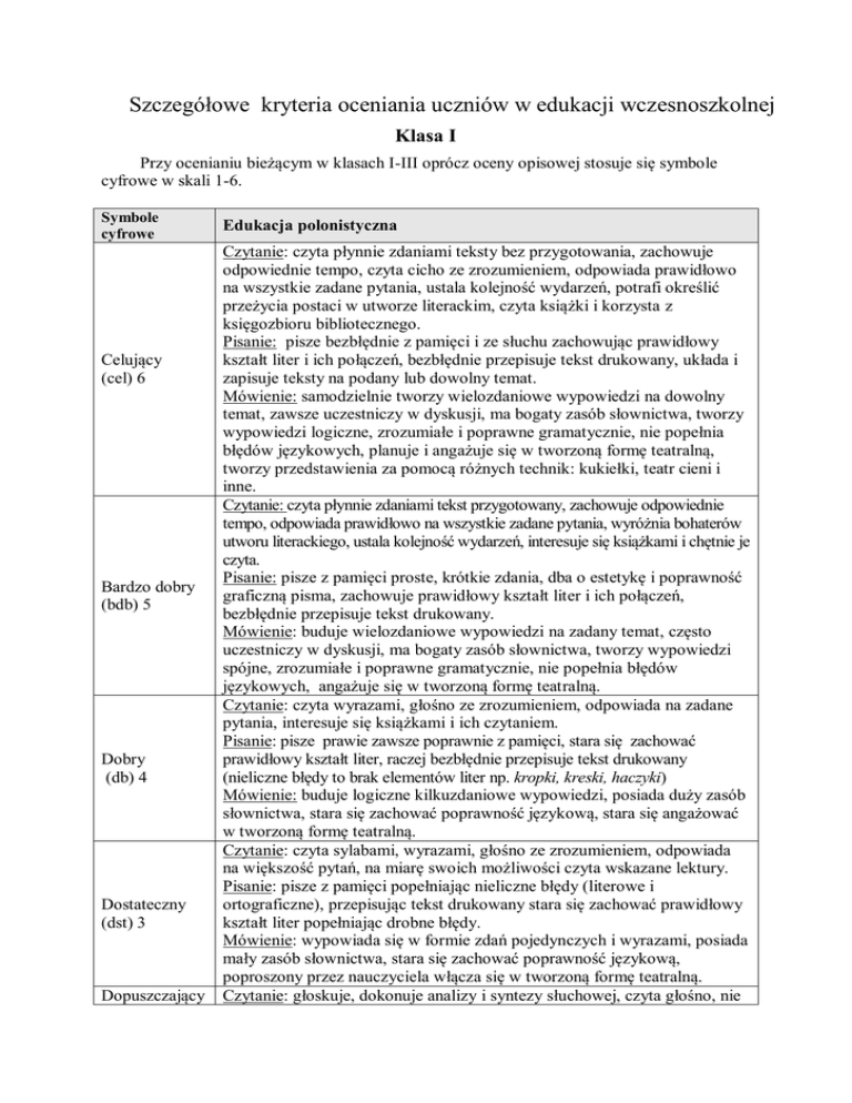 Szczegółowe kryteria oceniania uczniów w edukacji wczesnoszkolnej Klasa I Przy ocenianiu bieżącym w klasach I-III oprócz oceny opisowej stosuje się symbole cyfrowe w skali 1-6. Symbole cyfrowe Celujący (cel) 6 Bardzo dobry (bdb) 5 Dobry (db) 4 Dostateczny (dst) 3 Dopuszczający Edukacja polonistyczna Czytanie: czyta płynnie zdaniami teksty bez przygotowania, zachowuje odpowiednie tempo, czyta cicho ze zrozumieniem, odpowiada prawidłowo na wszystkie zadane pytania, ustala kolejność wydarzeń, potrafi określić przeżycia postaci w utworze literackim, czyta książki i korzysta z księgozbioru bibliotecznego. Pisanie: pisze bezbłędnie z pamięci i ze słuchu zachowując prawidłowy kształt liter i ich połączeń, bezbłędnie przepisuje tekst drukowany, układa i zapisuje teksty na podany lub dowolny temat. Mówienie: samodzielnie tworzy wielozdaniowe wypowiedzi na dowolny temat, zawsze uczestniczy w dyskusji, ma bogaty zasób słownictwa, tworzy wypowiedzi logiczne, zrozumiałe i poprawne gramatycznie, nie popełnia błędów językowych, planuje i angażuje się w tworzoną formę teatralną, tworzy przedstawienia za pomocą różnych technik: kukiełki, teatr cieni i inne. Czytanie: czyta płynnie zdaniami tekst przygotowany, zachowuje odpowiednie tempo, odpowiada prawidłowo na wszystkie zadane pytania, wyróżnia bohaterów utworu literackiego, ustala kolejność wydarzeń, interesuje się książkami i chętnie je czyta. Pisanie: pisze z pamięci proste, krótkie zdania, dba o estetykę i poprawność graficzną pisma, zachowuje prawidłowy kształt liter i ich połączeń, bezbłędnie przepisuje tekst drukowany. Mówienie: buduje wielozdaniowe wypowiedzi na zadany temat, często uczestniczy w dyskusji, ma bogaty zasób słownictwa, tworzy wypowiedzi spójne, zrozumiałe i poprawne gramatycznie, nie popełnia błędów językowych, angażuje się w tworzoną formę teatralną. Czytanie: czyta wyrazami, głośno ze zrozumieniem, odpowiada na zadane pytania, interesuje się książkami i ich czytaniem. Pisanie: pisze prawie zawsze poprawnie z pamięci, stara się zachować prawidłowy kształt liter, raczej bezbłędnie przepisuje tekst drukowany (nieliczne błędy to brak elementów liter np. kropki, kreski, haczyki) Mówienie: buduje logiczne kilkuzdaniowe wypowiedzi, posiada duży zasób słownictwa, stara się zachować poprawność językową, stara się angażować w tworzoną formę teatralną. Czytanie: czyta sylabami, wyrazami, głośno ze zrozumieniem, odpowiada na większość pytań, na miarę swoich możliwości czyta wskazane lektury. Pisanie: pisze z pamięci popełniając nieliczne błędy (literowe i ortograficzne), przepisując tekst drukowany stara się zachować prawidłowy kształt liter popełniając drobne błędy. Mówienie: wypowiada się w formie zdań pojedynczych i wyrazami, posiada mały zasób słownictwa, stara się zachować poprawność językową, poproszony przez nauczyciela włącza się w tworzoną formę teatralną. Czytanie: głoskuje, dokonuje analizy i syntezy słuchowej, czyta głośno, nie odpowiada prawidłowo na pytania, interesuje się książkami. Pisanie: przepisuje tekst odwzorowując litera po literze, pisząc z pamięci popełnia wiele błędów (np. opuszcza lub dodaje litery, myli litery o podobnym kształcie, robi błędy ortograficzne), nie zachowuje kształtu liter i połączeń literowych, myli wielkie litery z małymi. Mówienie: wypowiada się wyrazami, ma ubogi zasób słów, popełnia błędy językowe. Czytanie: popełnia błędy w głoskowaniu wyrazów, ma trudności w dokonywaniu analizy i syntezy słuchowej i słuchowo-wzrokowej wyrazów, nie czyta, nie odpowiada na zadawane pytania. Pisanie: przepisuje tekst odwzorowując litera po literze, popełnia przy tym liczne Niedostateczny błędy, nie potrafi pisać z pamięci, nie zachowuje liniatury, kształtu liter i (ndst) 1 połączeń literowych, myli wielkie litery z małymi. Mówienie: wypowiada się najczęściej w formie przeczącej lub twierdzącej, wyrazami jednosylabowymi, posiada bardzo ubogie słownictwo, mówi niechętnie popełniając liczne błędy językowe. (dop) 2 Symbole cyfrowe Celujący cel) 6 Bardzo dobry (bdb) 5 Dobry (db) 4 Dostateczny Edukacja matematyczna Działania w zakresie dodawania i odejmowania: rozumie i wykonuje samodzielnie dodawanie i odejmowanie w zakresie 20, rozwiązuje równania jednodziałaniowe z niewiadomą w postaci okienka. Zadania tekstowe: samodzielnie rozwiązuje zadania i układa treści zadań do sytuacji życiowej, rysunku, schematu graficznego i działania arytmetycznego. Umiejętności praktyczne: zawsze prawidłowo i samodzielnie dokonuje pomiarów długości, masy, obliczeń pieniężnych, zna pojęcie długu i konieczności spłacenia go, określa czas za pomocą zegara i kalendarza Działania w zakresie dodawania i odejmowania: rozumie i wykonuje samodzielnie dodawanie i odejmowanie w zakresie 10, rozwiązuje łatwe równania jednodziałaniowe z niewiadomą w postaci okienka. Zadania tekstowe: samodzielnie i bezbłędnie rozwiązuje zadania jednodziałaniowe, zapisuje rozwiązanie zadania przedstawionego słownie w konkretnej sytuacji. Umiejętności praktyczne: prawidłowo i samodzielnie dokonuje pomiarów długości i masy, obliczeń pieniężnych, zna pojęcie długu i konieczności spłacenia go, określa czas z pomocą zegara i kalendarza nazywa dni tygodnia i nazwy miesięcy, starannie kontynuuje rozpoczęty wzór, (np. szlaczek), dostrzega symetrię Działania w zakresie dodawania i odejmowania: rozumie i wykonuje dodawanie i odejmowanie w zakresie przekraczającym 10 popełniając drobne błędy, rozwiązuje łatwe równania jednodziałaniowe z niewiadomą w postaci okienka (bez przenoszenia na drugą stronę) Zadania tekstowe: korzysta ze wskazówek nauczyciela i bezbłędnie rozwiązuje zadania jednodziałaniowe, poprawnie rozwiązuje zadanie przedstawione słownie w konkretnej sytuacji Umiej