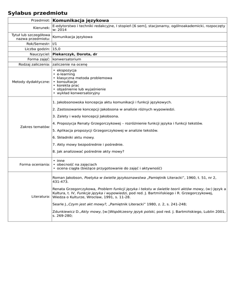 Sylabus przedmiotu Przedmiot: Komunikacja językowa E-edytorstwo i techniki redakcyjne, I stopień [6 sem], stacjonarny, ogólnoakademicki, rozpoczęty Kierunek: w: 2014 Tytuł lub szczegółowa Komunikacja językowa nazwa przedmiotu: Rok/Semestr: I/1 Liczba godzin: 15,0 Nauczyciel: Piekarczyk, Dorota, dr Forma zajęć: konwersatorium Rodzaj zaliczenia: zaliczenie na ocenę • • • Metody dydaktyczne: • • • • ekspozycja e-learning klasyczna metoda problemowa konsultacje korekta prac objaśnienie lub wyjaśnienie wykład konwersatoryjny 1. Jakobsonowska koncepcja aktu komunikacji i funkcji językowych. 2. Zastosowanie koncepcji Jakobsona w analizie różnych wypowiedzi. 3. Zalety i wady koncepcji Jakobsona. Zakres tematów: 4. Propozycja Renaty Grzegorczykowej – rozróżnienie funkcji języka i funkcji tekstów. 5. Aplikacja propozycji Grzegorczykowej w analizie tekstów. 6. Składniki aktu mowy. 7. Akty mowy bezpośrednie i pośrednie. 8. Jak analizować pośrednie akty mowy? • inne Forma oceniania: • obecność na zajęciach • ocena ciągła (bieżące przygotowanie do zajęć i aktywność) Roman Jakobson, Poetyka w świetle językoznawstwa „Pamiętnik Literacki”, 1960, t. 51, nr 2, 431-473. Renata Grzegorczykowa, Problem funkcji języka i tekstu w świetle teorii aktów mowy , (w:) Język a Kultura, t. IV, Funkcje języka i wypowiedzi, pod red. J. Bartmińskiego i R. Grzegorczykowej, Literatura: Wiedza o Kulturze, Wrocław, 1991, s. 11-28. Searle J.,Czym jest akt mowy?, „Pamiętnik Literacki” 1980, z. 2, s. 241-248; Zdunkiewicz D.,Akty mowy, [w:]Współczesny język polski, pod red. J. Bartmińskiego, Lublin 2001, s. 269-280;