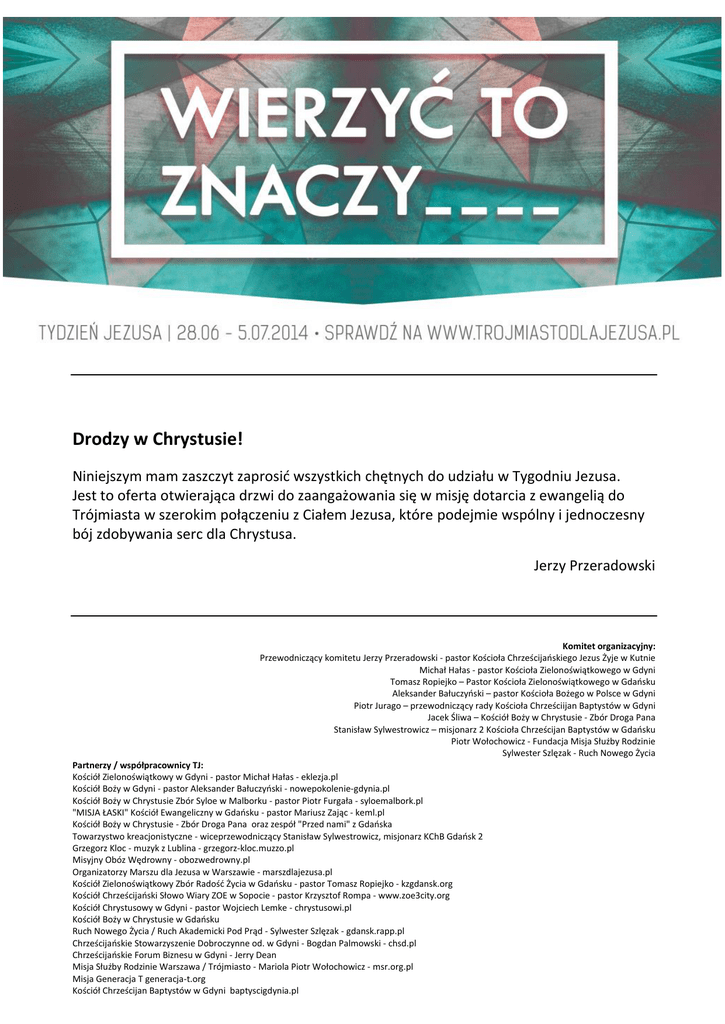 Drodzy w Chrystusie! Niniejszym mam zaszczyt zaprosić wszystkich chętnych do udziału w Tygodniu Jezusa. Jest to oferta otwierająca drzwi do zaangażowania się w misję dotarcia z ewangelią do Trójmiasta w szerokim połączeniu z Ciałem Jezusa, które podejmie wspólny i jednoczesny bój zdobywania serc dla Chrystusa. Jerzy Przeradowski Komitet organizacyjny: Przewodniczący komitetu Jerzy Przeradowski - pastor Kościoła Chrześcijańskiego Jezus Żyje w Kutnie Michał Hałas - pastor Kościoła Zielonoświątkowego w Gdyni Tomasz Ropiejko – Pastor Kościoła Zielonoświątkowego w Gdańsku Aleksander Bałuczyński – pastor Kościoła Bożego w Polsce w Gdyni Piotr Jurago – przewodniczący rady Kościoła Chrześciijan Baptystów w Gdyni Jacek Śliwa – Kościół Boży w Chrystusie - Zbór Droga Pana Stanisław Sylwestrowicz – misjonarz 2 Kościoła Chrześcijan Baptystów w Gdańsku Piotr Wołochowicz - Fundacja Misja Służby Rodzinie Sylwester Szlęzak - Ruch Nowego Życia Partnerzy / współpracownicy TJ: Kościół Zielonoświątkowy w Gdyni - pastor Michał Hałas - eklezja.pl Kościół Boży w Gdyni - pastor Aleksander Bałuczyński - nowepokolenie-gdynia.pl Kościół Boży w Chrystusie Zbór Syloe w Malborku - pastor Piotr Furgała - syloemalbork.pl "MISJA ŁASKI" Kościół Ewangeliczny w Gdańsku - pastor Mariusz Zając - keml.pl Kościół Boży w Chrystusie - Zbór Droga Pana oraz zespół "Przed nami" z Gdańska Towarzystwo kreacjonistyczne - wiceprzewodniczący Stanisław Sylwestrowicz, misjonarz KChB Gdańsk 2 Grzegorz Kloc - muzyk z Lublina - grzegorz-kloc.muzzo.pl Misyjny Obóz Wędrowny - obozwedrowny.pl Organizatorzy Marszu dla Jezusa w Warszawie - marszdlajezusa.pl Kościół Zielonoświątkowy Zbór Radość Życia w Gdańsku - pastor Tomasz Ropiejko - kzgdansk.org Kościół Chrześcijański Słowo Wiary ZOE w Sopocie - pastor Krzysztof Rompa - www.zoe3city.org Kościół Chrystusowy w Gdyni - pastor Wojciech Lemke - chrystusowi.pl Kościół Boży w Chrystusie w Gdańsku Ruch Nowego Życia / Ruch Akademicki Pod Prąd - Sylwester Szlęzak - gdansk.rapp.pl Chrześcijańskie Stowarzyszenie Dobroczynne od. w Gdyni - Bogdan Palmowski - chsd.pl Chrześcijańskie Forum Biznesu w Gdyni - Jerry Dean Misja Służby Rodzinie Warszawa / Trójmiasto - Mariola Piotr Wołochowicz - msr.org.pl Misja Generacja T generacja-t.org Kościół Chrześcijan Baptystów w Gdyni baptyscigdynia.pl