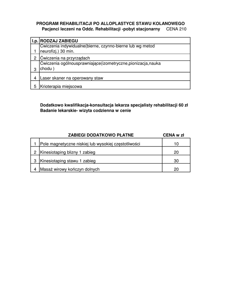 PROGRAM REHABILITACJI PO ALLOPLASTYCE STAWU KOLANOWEGO Pacjenci leczeni na Oddz. Rehabilitacji -pobyt stacjonarny CENA 210 l.p. RODZAJ ZABIEGU Ćwiczenia indywidualne(bierne, czynno-bierne lub wg metod 1 neurofizj.) 30 min. 2 Ćwiczenia na przyrządach Ćwiczenia ogólnousprawniające(izometryczne,pionizacja,nauka 3 chodu ) 4 Laser skaner na operowany staw 5 Krioterapia miejscowa Dodatkowo kwalifikacja-konsultacja lekarza specjalisty rehabilitacji 60 zł Badanie lekarskie- wizyta codzienna w cenie ZABIEGI DODATKOWO PŁATNE CENA w zł 1 Pole magnetyczne niskiej lub wysokiej częstotliwości 10 2 Kinesiotaping blizny 1 zabieg 20 3 Kinesiotaping stawu 1 zabieg 30 4 MasaŜ wirowy kończyn dolnych 20
