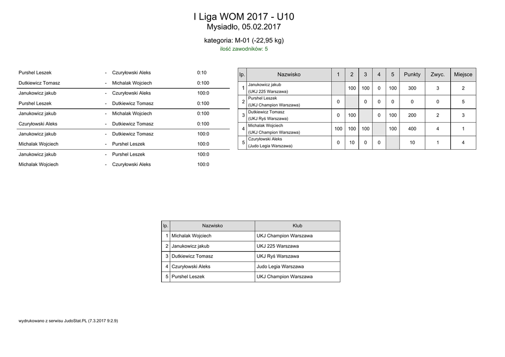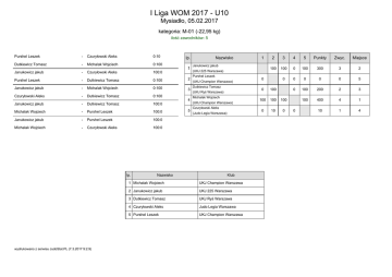 I Liga WOM 2017 - U10 Mysiadło, 05.02.2017 kategoria: M-01 (-22,95 kg) ilość zawodników: 5 Purshel Leszek - Czuryłowski Aleks 0:10 Dutkiewicz Tomasz - Michalak Wojciech 0:100 Janukowicz jakub - Czuryłowski Aleks 100:0 Purshel Leszek - Dutkiewicz Tomasz 0:100 2 Janukowicz jakub - Michalak Wojciech 0:100 3 Czuryłowski Aleks - Dutkiewicz Tomasz 0:100 Janukowicz jakub - Dutkiewicz Tomasz 100:0 Michalak Wojciech - Purshel Leszek 100:0 Janukowicz jakub - Purshel Leszek 100:0 Michalak Wojciech - Czuryłowski Aleks 100:0 lp. wydrukowano z serwisu JudoStat.PL (7.3.2017 9:2.9) Nazwisko lp. 1 4 5 Nazwisko 1 Janukowicz jakub (UKJ 225 Warszawa) Purshel Leszek (UKJ Champion Warszawa) Dutkiewicz Tomasz (UKJ Ryś Warszawa) Michalak Wojciech (UKJ Champion Warszawa) Czuryłowski Aleks (Judo Legia Warszawa) Klub 1 Michalak Wojciech UKJ Champion Warszawa 2 Janukowicz jakub UKJ 225 Warszawa 3 Dutkiewicz Tomasz UKJ Ryś Warszawa 4 Czuryłowski Aleks Judo Legia Warszawa 5 Purshel Leszek UKJ Champion Warszawa 2 3 4 5 Punkty Zwyc. Miejsce 100 100 0 100 300 3 2 0 0 0 0 0 5 0 100 200 2 3 100 400 4 1 10 1 4 0 0 100 100 100 100 0 10 0 0
