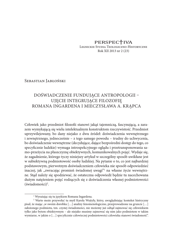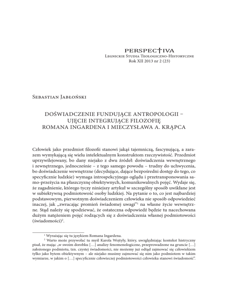 46 Sebastian Jabłoński PERSPEC†IVA Legnickie Studia Teologiczno-Historyczne Rok XII 2013 nr 2 (23) Sebastian Jabłoński DOŚWIADCZENIE FUNDUJĄCE ANTROPOLOGII – UJĘCIE INTEGRUJĄCE FILOZOFIĘ ROMANA INGARDENA I MIECZYSŁAWA A. KRĄPCA Człowiek jako przedmiot filozofii stanowi jakąś tajemniczą, fascynującą, a zarazem wymykającą się wielu intelektualnym konstruktom rzeczywistość. Przedmiot uprzywilejowany, bo dany niejako z dwu źródeł: doświadczenia wewnętrznego i zewnętrznego, jednocześnie – z tego samego powodu – trudny do uchwycenia, bo doświadczenie wewnętrzne (decydujące, dające bezpośredni dostęp do tego, co specyficznie ludzkie) wymaga introspekcyjnego oglądu i przetransponowania samo-przeżycia na płaszczyznę obiektywnych, komunikowalnych pojęć. Wydaje się, że zagadnienie, którego tyczy niniejszy artykuł w szczególny sposób uwikłane jest w subiektywną podmiotowość osoby ludzkiej. Na pytanie o to, co jest najbardziej podstawowym, pierwotnym doświadczeniem człowieka nie sposób odpowiedzieć inaczej, jak „zwracając promień świadomej uwagi”1 na własne życie wewnętrzne. Stąd należy się spodziewać, że ostateczna odpowiedź będzie tu nacechowana dużym natężeniem pojęć rodzących się z doświadczenia własnej podmiotowości (świadomości)2. Wyrażając się tu językiem Romana Ingardena. Warto może przywołać tu myśl Karola Wojtyły, który, uwzględniając kontekst histryczny pisał, że mając „w swoim dorobku […] analizy fenomenologiczne, przeprowadzone na gruncie […] założonego podmiotu, tzn. czystej świadomości, nie możemy już odtąd zajmować się człowiekiem tylko jako bytem obiektywnym – ale niejako musimy zajmować się nim jako podmiotem w takim wymiarze, w jakim o […] specyficznie człowieczej podmiotowości człowieka stanowi świadomość”. 1 2 Doświadczenie fundujące antropologii… 47 Wobec powyższego, trafny wydaje się wybór wymienionych w tytule artykułu autorów jako źródła inspiracji w realizacji możliwie całościowego opisu podstawowego ludzkiego doświadczenia. Podczas gdy u Mieczysława A. Krąpca postaramy się odnaleźć opis tego, co stanowi treść realnie się dokonującego, najbardziej fundamentalnego, pierwotnego doświadczenia ludzkiego (określonego przez tego filozofa jako doświadczenie macierzyste), do Romana Ingardena zwrócimy się po uzupełnienie opisu w kontekście procesów związanych ze świadomością podmiotu3. Takie ujęcie problemu może być narażone na zarzut nieuprawnionego „mieszania” różnych co do natury nurtów myślenia filozoficznego. Jednak, skoro – jak stwierdza Krąpiec – to właśnie być „«świadomym siebie» uchodzi za wstępny etap normalnego psychicznego życia człowieka i za podstawową sytuację ludzką”4, to próba pojęciowego uchwycenia i wyjaśnienia „podstawowej ludzkiej sytuacji” (rozumianej jako punkt wyjścia antropologii filozoficznej) zdaje się domagać analizy „świadomości siebie”, która ją w jakiś sposób warunkuje5. Zgodnie z prawdą należy jednak przyznać, że w proponowanym ujęciu dochodzi do pewnego „zacierania granicy” pomiędzy tym, co subiektywne i obiektywne, lecz czyż proces „rozpuszczania” tej – utrwalonej w historii filozofii – granicy nie zostaje tak naprawdę usprawiedliwiony siłą doświadczenia siebie samego K. Wojtyła. Podmiotowość i „to, co nieredukowalne” w człowieku. W: Osoba i czyn oraz inne dzieła antropologiczne. Red. T. Styczeń, W. Chudy, J. W. Gałkowski, A. Rodziński, A. Szostek. Lublin 1994 s.436. 3 Relację obu przywołanych w artykule opisów można – uciekając się znów do myśli Wojtyły – określić jako „zabudowę terenu metafizycznego” przez „filozoficzne próby uchwycenia w doświadczeniu człowieka tego, co nieredukowalne, subiektywne, podmiotowe”. Wojtyła. Podmiotowość. s. 438. Dla pełnej jasności naszych rozważań podkreślmy tu zasadniczy – w kontekście historii filozofii, szczególnie zaś przywołanych w niniejszym artykule autorów – podział na antropologię metafizyczną i filozofię podmiotu. Pierwszy z nurtów, reprezentowany przez Mieczysława A. Krąpca, stanowi filozoficzny namysł nad człowiekiem w ramach ogólnego systemu metafizycznego, ufundowanego na przeświadczeniu o oczywistości istnienia świata realnego i Ja filozofującego, przyznającego prymat poznawczy percepcji zmysłowej świata materialnego. Natomiast określenie „filozofii podmiotu” stosujemy do myślenia ukierunkowanego na analizę człowieka, przede wszystkim zaś jego struktur poznawczych. W niniejszej pracy filozofia podmiotu jest reprezentowana w formie przyjętej przez autora Sporu o istnienie świata perspektywy transcendentalnej (kierującej się dążeniem, by „istnienie i uposażenie czegokolwiek […] wywieść z istnienia ego i z przebiegu jego przeżyć”. R. Ingarden. Spór o istnienie świata. T. 1. Warszawa 1987 s. 18) i w fenomenologicznym nastawieniu badawczym. Sam Ingarden określa swój sposób filozofowania zaprezentowany w Sporze jako „ontologię”, co zostanie bliżej wyjaśnione w dalszej części artykułu. 4 M. A. Krąpiec. Ja – człowiek. Lublin 1991 s. 127. 5 Podkreślmy tu, że – zgodnie z zastrzeżeniem Krąpca – ujmujemy „świadome ja” w duchu filozofii realistycznej: „Bezpośrednie dane świadomości w tym miejscu są uprawnionym punktem wyjścia, gdyż dotyczą właśnie tego, co w świadomości i przez świadomość się ujawnia i zyskuje ludzki wyraz. Nie znaczy to jednak, by został tu zaakceptowany ściśle fenomenologiczny opis i punk wyjścia lub by świadomość miała być czymś pierwotnym w filozoficznej analizie […]. Znaczy to jednak, że samowiedza, jaką każdy z nas o sobie posiada, jest na terenie antropologii filozoficznej czymś, co jest pierwotnie dane”. Krąpiec. Ja – człowiek. s. 120 (przypis 5). 48 Sebastian Jabłoński jednoc