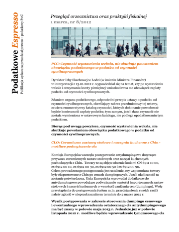 Publikacja wydawana przez dział prawno – podatkowy PwC Podatkowe Espresso Przegląd orzecznictwa oraz praktyki fiskalnej 1 marca, nr 8/2012 PCC: Czynność wystawienia weksla, nie skutkuje powstaniem obowiązku podatkowego w podatku od czynności cywilnoprawnych Dyrektor Izby Skarbowej w Łodzi (w imieniu Ministra Finansów) w interpretacji z 13.01.2012 r. wypowiedział się na temat, czy po wystawieniu weksla i otrzymaniu kwoty pieniężnej wnioskodawca ma obowiązek zapłaty podatku od czynności cywilnoprawnych. Zdaniem organu podatkowego, odpowiedni przepis ustawy o podatku od czynności cywilnoprawnych, określający zakres przedmiotowy tej ustawy, zawiera enumeratywny katalog czynności, których dokonanie powodować będzie konieczność zapłaty podatku; tym samym, jeżeli dana czynność nie została wymieniona w ustawowym katalogu, nie podlega opodatkowaniu tym podatkiem. Biorąc pod uwagę powyższe, czynność wystawienia weksla, nie skutkuje powstaniem obowiązku podatkowego w podatku od czynności cywilnoprawnych. CŁO: Ceramiczne zastawy stołowe i naczynia kuchenne z Chin możliwe podwyższenie cła Komisja Europejska wszczęła postępowanie antydumpingowe dotyczące przywozu ceramicznych zastaw stołowych oraz naczyń kuchennych pochodzących z Chin. Towary te są objęte obecnie kodami CN 6911 10 00, ex 6912 00 10, ex 6912 00 30, ex 6912 00 50 i ex 6912 00 90. Celem prowadzonego postępowania jest ustalenie, czy wspomniane towary były eksportowane z Chin po cenach dumpingowych. Jeżeli okoliczność ta zostanie potwierdzona, Unia Europejska wprowadzi dodatkowe cło antydumpingowe powodujące podwyższenie wartości importowanych zastaw stołowych i naczyń kuchennych o wysokość zaniżenia cen (dumpingu). Wolę przystąpienia do postępowania (celem m.in. przedstawienia swoich racji) należy zgłosić w nieprzekraczalnym terminie do 2 marca 2012 r. Wynik postępowania w zakresie stosowania dumpingu cenowego i ewentualnego wprowadzenia ostatecznego cła antydumpingowego ma być znany w połowie maja 2013 r. Jednakże już w połowie listopada 2012 r. możliwe będzie wprowadzenie tymczasowego cła atydumpingowego, obowiązującego do zakończenia zakończenia procedury antydumpingowej. Okoliczności te powinny zostać uwzględnione przez importerów oraz użytkowników tych towarów przy kalkulacji opłacalności transakcji importowych. CIT: Nieumorzoną wartość zlikwidowanej części placu składowego można zaliczyć zaliczyć do kosztów uzyskania przychodów bezpośrednio Dyrektor Izby Skarbowej w Łodzi (w imieniu Ministra Finansów) w interpretacji z 1.02.2012 r. wypowiedział się na temat, czy nieumorzoną wartość zlikwidowanej części placu składowego spółka może zaliczyć do kosztów uzyskania przychodów w miesiącu fizycznej likwidacji. Zdaniem organu podatkowego, jeżeli likwidacja środka trwałego nie jest związana ze zmianą rodzaju działalności, strata z tego tytułu, w wysokości nieumorzonej wartości środka trwałego, stanowi wi bezpośrednio koszty uzyskania przychodów, nie zwiększając tym samym wartości początkowej nowego budynku. Nieumorzona część wartości początkowej likwidowanego środka trwałego, nie zwiększa wartości początkowej nowego środka trwałego, lecz stanowi bezpośrednio bezpośrednio koszty uzyskania przychodów. CIT: Otrzymane odszkodowanie w formie pieniężnej podlega opodatkowaniu podatkiem dochodowym od osób prawnych Dyrektor Izby Skarbowej w Łodzi (w imieniu Ministra Finansów) w interpretacji z 8.02.2012 r. wypowiedział się na temat, czy otrzymane przez niego odszkodowanie w formie pieniężnej podlega opodatkowaniu podatkiem dochodowym od osób prawnych. Przetestuj taxonline.pl Zeskanuj kod www.taxonline.pl/testowy Zdaniem organu podatkowego, literalna wykładnia odpowiednich przepisów ustawy o podatku dochodowym od osób prawnych prowadzi do wniosku, że do przychodów podatkowych zalicza się tylko takie przychody, które w danym momencie są trwałe, definitywne i bezwarunkowe. Nie będą to, zatem jakiekolwiek przychody, lecz przychody, przychody, w stosunku, do których podatnikowi przysługiwać będzie prawo do ich otrzymania i które będą stanowić jego trwałe przysporzenie majątkowe. Mając powyższe na uwadze należy stwierdzić, iż otrzymane przez spółkę odszkodowanie w formie pieniężnej stanowi przychód na gruncie ustawy o podatku dochodowym od osób prawnych, mające wpływ na opodatkowanie tym podatkiem. W przypadku pytań, prosimy o kontakt z Tomaszem Misiakiem: [email protected], Tel.: 22 523 4858, tel. kom.: 502 18 4858 Zastrzeżenie prawne: Przegląd orzecznictwa oraz praktyki fiskalnej ma jedynie charakter informacyjny i nie może stanowić jedynej podstawy do podejmowania działań. © 2012 PricewaterhouseCoopers Sp. z o.o. Wszystkie prawa zastrzeżone. W tym dokumencie nazwa "PwC" odnosi się do PricewaterhouseCoopers Sp. z o.o., firmy wchodzącej w skład sieci PricewaterhouseCoopers International Limited, z których każda stanowi odrębny i niezależny niezależny podmiot prawny.