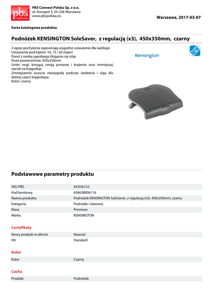 PBS Connect Polska Sp. z o.o. ul. Annopol 3, 03-236 Warszawa www.pbspolska.eu Warszawa, 2017-03-07 Karta katalogowa produktu: Podnóżek KENSINGTON SoleSaver, z regulacją (x3), 450x350mm, czarny 3 opcje pochylenia zapewniają wygodne ustawienie dla każdego Ustawienie pod kątem: 10, 15 i 20 stopni Panel z ramką zapobiega ślizganiu się stóp Duża powierzchnia: 450x350mm Unieś nogi, koryguj swoją postawę i krążenie oraz zmniejszaj nacisk na kręgosłup Zmniejszenie uczucia niewygody podczas siedzenia i ulga dla dolnej części kręgosłupa Kolor: czarny Podstawowe parametry produktu SKU PBS ACK56152 Kod kreskowy 636638006116 Nazwa produktu Podnóżek KENSINGTON SoleSaver, z regulacją (x3), 450x350mm, czarny Kategoria Podnóżki i taborety Klasa Premium Marka KENSINGTON Certyfikaty Nowy produkt w ofercie Nowość Hit Standard Kolor Kolor Czarny Cecha Produkt Podnóżek PBS Connect Polska Sp. z o.o. ul. Annopol 3, 03-236 Warszawa www.pbspolska.eu Warszawa, 2017-03-07 Karta katalogowa produktu cd. Podnóżek KENSINGTON SoleSaver, z regulacją (x3), 450x350mm, czarny Podstawowe parametry produktu Typ 3 poziomy wysokości Materiał Plastik W ofercie od 2017-01 Wymiary Wymiary (mm) 450x350 Wspólny słownik zamówień CPV 39113700-4 Podnóżki