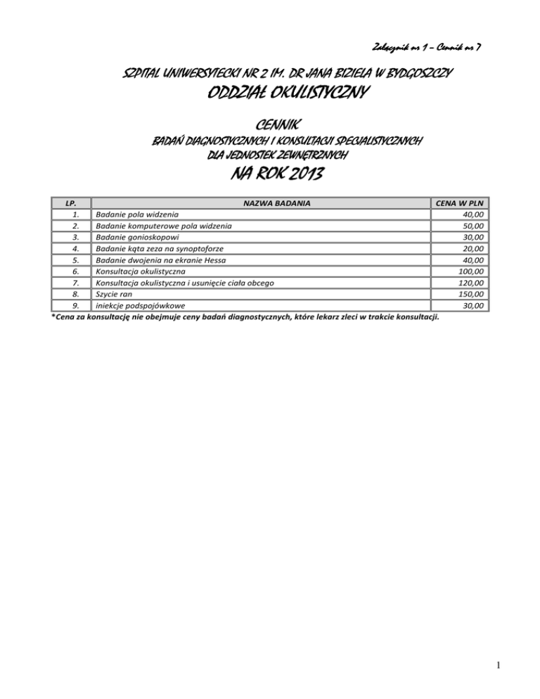 Załącznik nr 1 – Cennik nr 7 SZPITAL UNIWERSYTECKI NR 2 IM. DR JANA BIZIELA W BYDGOSZCZY ODDZIAŁ OKULISTYCZNY OKULISTYCZNY CENNIK BADAŃ DIAGNOSTYCZNYCH I KONSULTACJI SPECJALISTYCZNYCH DLA JEDNOSTEK JEDNOSTEK ZEWNĘTRZNYCH NA ROK 2013 LP. NAZWA BADANIA CENA W PLN 1. Badanie pola widzenia 40,00 2. Badanie komputerowe pola widzenia 50,00 3. Badanie gonioskopowi 30,00 4. Badanie kąta zeza na synoptoforze 20,00 5. Badanie dwojenia na ekranie Hessa 40,00 6. Konsultacja okulistyczna 100,00 7. Konsultacja okulistyczna i usunięcie ciała obcego 120,00 8. Szycie ran 150,00 9. iniekcje podspojówkowe 30,00 *Cena za konsultację nie obejmuje ceny badań diagnostycznych, które lekarz zleci w trakcie konsultacji. 1