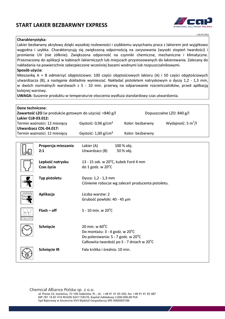 START LAKIER BEZBARWNY EXPRESS v.01-07.2012 Charakterystyka: Lakier bezbarwny akrylowy dzięki wysokiej rozlewności i szybkiemu wysychaniu praca z lakierem jest wyjątkowo wygodna i szybka. Charakteryzują się zwiększoną odpornością na zarysowania (wysoki stopień twardości) i promienie UV (nie żółknie). Zwiększona odporność na czynniki chemiczne, mechaniczne i klimatyczne. Przeznaczony do aplikacji w kabinach lakierniczych lub miejscach przystosowanych do lakierowania. Zalecany do nakładania na powierzchnie zabezpieczone wcześniej bazami wodnymi lub rozpuszczalnikowymi. Sposób użycia: Mieszankę A + B odmierzyć objętościowo: 100 części objętościowych lakieru (A) i 50 części objętościowych utwardzacza (B), a następnie dokładnie wymieszać. Nakładać pistoletem natryskowym o dyszy 1,2 - 1,3 mm, w dwóch normalnych warstwach z 5 - 10 min. przerwą na odparowanie rozcieńczalników, przed aplikacją kolejnej warstwy. UWAGA: Suszenie produktu w temperaturze otoczenia wydłuża standardowy czas utwardzenia. Dane techniczne: Zawartość LZO (w produkcie gotowym do użycia): <840 g/l Lakier CLB-03.012: Termin ważności: 12 miesięcy Gęstość: 0,96 g/cm³ Utwardzacz CDL-04.017: Termin ważności: 12 miesięcy Gęstość: 1,00 g/cm³ Dopuszczalne LZO: 840 g/l Kolor: bezbarwny Wydajność: 5 m 2/l Kolor: bezbarwny Proporcja mieszania 2:1 Lakier (A) Utwardzacz (B) 100 % obj. 50 % obj. Lepkość natrysku Czas życia 13 - 15 sek. w 20oC, kubek Ford 4 mm do 1 godz. w 20oC Typ pistoletu Dysza: 1,2 - 1,3 mm Ciśnienie robocze wg zaleceń producenta pistoletu. Aplikacja Liczba warstw: 2 Grubość powłoki: 40 - 45 μm Flash – off 5 - 10 min. w 20oC Schnięcie 20 min. w 60oC Do montażu: 3 - 4 godz. w 20oC Do polerowania: 5 - 7 godz. w 20oC Całkowita twardość po 5 - 7 dniach w 20oC Schnięcie IR Fala krótka i średnia: 10 min.