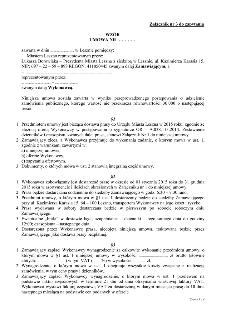 Załącznik nr 3 do zapytania - WZÓR – UMOWA NR …………. zawarta w dniu ............................... w Lesznie pomiędzy: − Miastem Leszno reprezentowanym przez: Łukasza Borowiaka – Prezydenta Miasta Leszna z siedzibą w Lesznie, ul. Kazimierza Karasia 15, NIP: 697 – 22 – 59 – 898 REGON: 411050445 zwanym dalej Zamawiającym, a − ..............................................................................................................., reprezentowanym przez: ....................................... - ................................ zwanym dalej Wykonawcą. Niniejsza umowa została zawarta w wyniku przeprowadzonego postępowania o udzielenie zamówienia publicznego, którego wartość nie przekracza równowartości 30 000 o następującej treści: §1 1. Przedmiotem umowy jest bieżąca dostawa prasy do Urzędu Miasta Leszna w 2015 roku, zgodnie ze złożoną ofertą Wykonawcy w postępowaniu o sygnaturze OR – A.038.113.2014. Zestawienie dzienników i czasopism, zwanych dalej prasą, stanowi Załącznik Nr 1 do niniejszej umowy. 2. Zamawiający zleca, a Wykonawca przyjmuje do wykonania zadanie, o którym mowa w ust. 1, zgodnie z warunkami zawartymi w: a) niniejszej umowie, b) ofercie Wykonawcy, c) zapytaniu ofertowym. 3. Dokumenty, o których mowa w ust. 2 stanowią integralną część umowy. §2 1. Wykonawca zobowiązany jest dostarczać prasę w okresie od 01 stycznia 2015 roku do 31 grudnia 2015 roku w asortymencie i ilościach określonych w Załączniku nr 1 do niniejszej umowy. 2. Prasa będzie dostarczana codziennie do siedziby Zamawiającego w godz. 6:30 – 7:30 rano. 3. Przedmiot umowy, o którym mowa w §1 ust. 1 dostarczony będzie do siedziby Zamawiającego przy ul. Kazimierza Karasia 15, 64 – 100 Leszno, transportem Wykonawcy na jego koszt i ryzyko. 4. Prasa wydawana w soboty dostarczana będzie w pierwszym po sobocie roboczym dniu Zamawiającego. 5. Ewentualne „braki” w dostawie będą uzupełniane: – dzienniki – tego samego dnia do godziny 12:00; czasopisma – następnego dnia. 6. Dostarczona przez Wykonawcę prasa, nieobjęta niniejszą umową, traktowana będzie przez Zamawiającego jako dostawa prasy bezpłatnej. §3 1. Zamawiający zapłaci Wykonawcy wynagrodzenie za całkowite wykonanie przedmiotu umowy, o którym mowa w §1 ust. 1 niniejszej umowy w wysokości ……………………….. zł brutto (słownie złotych: ……………………… ) w tym VAT (…….. %) w wysokości …………. zł. 2. Wynagrodzenie, o którym mowa w ust. 1 obejmuje wszystkie koszty związane z realizacją zamówienia, w tym ceny prasy i dzienników. 3. Zamawiający zapłaci Wykonawcy wynagrodzenie, o którym mowa w ust. 1 przelewem na podstawie faktur częściowych w terminie 21 dni od dnia otrzymania właściwej faktury VAT. Wykonawca wystawi fakturę częściową VAT za dostarczoną w danym miesiącu prasę do 10 dnia następnego miesiąca na podstawie cen podanych w ofercie. Strona 1 z 4 4. Strony przyjmują, iż dniem zapłaty jest dzień obciążenia rachunku Zamawiającego. §4 1. Zamawiający winien zgłaszać Wykonawcy reklamacje ilościowe i jakościowe w dniu dostawy prasy, a Wykonawca winien uwzględnić uzasadnione reklamacje. 2. W przypadku zmiany cen u wydawcy, bądź ustawowej zmiany stawki podatku VAT Wykonawca zobowiązany jest pisemnie poinformować o tym fakcie Zamawiającego. §5 1. Osobą upoważnioną przez Zamawiającego do spraw związanych z realizacją niniejszej umowy jest ……………………………………….......,tel.………………………………………………..……… 2. Osobą upoważnioną przez Wykonawcę do spraw związanych z realizacją niniejszej umowy jest …………………………………………..,tel. ……………………………………………………...... 3. Zmiana w trakcie realizacji przedmiotu zamówienia danych wskazanych powyżej nie stanowi zmiany niniejszej umowy i wymaga jedynie pisemnego powiadomienia drugiej strony. §6 1. Zakazuje się zmian postanowień zawartej umowy w stosunku do treści oferty, na podstawie której dokonano wyboru Wykonawcy, chyba że będą to zmiany wynikające z następujących przesłanek: a) konieczność zamówienia pozycji prasowej, nie ujętej wcześniej przez Zamawiającego w wykazie prasy stanowiącym Załącznik nr 2 do zapytania ofertowego, b) zmiana cen dostarczanej prasy u wydawcy, c) przekształcenie którejkolwiek ze stron umowy, d) dostosowanie umowy do zmian powszechnie obowiązujących przepisów prawa mających wpływ na realizację przedmiotu zamówienia, nie dotyczy stawki VAT (wzrost stawki VAT, nie wpływa na wysokość wynagrodzenia – koszty związane ze wzrostem stawki obciążają Wykonawcę), e) zajdą inne okoliczności, których nie można było przewidzieć w dniu zawarcia umowy. 2. Wszelkie zmiany niniejszej umowy wymagają formy pisemnego aneksu pod rygorem nieważności. 3. W razie wystąpienia istotnej zmiany okoliczności powodującej, że wykonanie umowy nie leży w interesie publicznym, czego nie można było przewidzieć w chwili zawarcia umowy, Zamawiający może odstąpić od umowy w terminie 30 dni od powzięcia wiadomości o powyższych okolicznościach. 4. W przypadku, o którym mowa w ust. 3 niniejszego paragrafu , Wykonawca może żądać wyłącznie wynagrodzenia należnego z tytułu wykonania części umowy. §7 1. Wykonawca zapłaci kary umowne Zamawiającemu w przypadku: 1) opóźnienia w należytym wykonaniu umowy w wysokości 10% wartości dostarczonej w danym dniu prasy, przy czym za opóźnienie należy uważać dostawę prasy po godzinie 7:30 rano lub dostawę „braków” po godzinie 12:00, 2) odstąpienia przez Wykonawcę od wykonania umowy, w całości lub części, z przyczyn, za które odpowiada Wykonawca, w wysokości 10% wartości umowy lub odpowiednio 10% wartości dostaw, od których odstąpiono, 3) odstąpienie od umowy przez Zamawiającego, w całości lub 