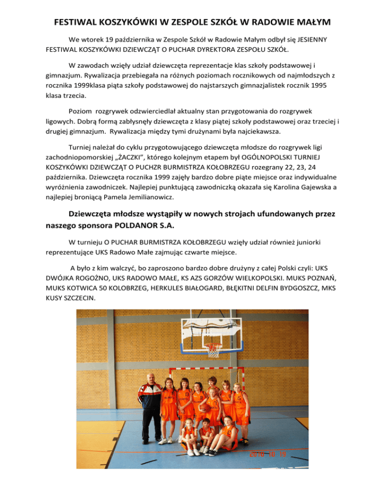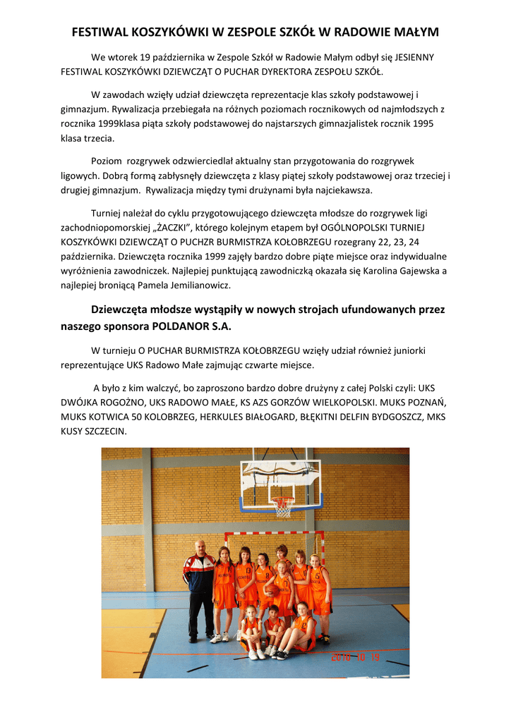 FESTIWAL KOSZYKÓWKI W ZESPOLE SZKÓŁ W RADOWIE MAŁYM We wtorek 19 października w Zespole Szkół w Radowie Małym odbył się JESIENNY FESTIWAL KOSZYKÓWKI DZIEWCZĄT O PUCHAR DYREKTORA ZESPOŁU SZKÓŁ. W zawodach wzięły udział dziewczęta reprezentacje klas szkoły podstawowej i gimnazjum. Rywalizacja przebiegała na różnych poziomach rocznikowych od najmłodszych z rocznika 1999klasa piąta szkoły podstawowej do najstarszych gimnazjalistek rocznik 1995 klasa trzecia. Poziom rozgrywek odzwierciedlał aktualny stan przygotowania do rozgrywek ligowych. Dobrą formą zabłysnęły dziewczęta z klasy piątej szkoły podstawowej oraz trzeciej i drugiej gimnazjum. Rywalizacja między tymi drużynami była najciekawsza. Turniej należał do cyklu przygotowującego dziewczęta młodsze do rozgrywek ligi zachodniopomorskiej „ŻACZKI”, którego kolejnym etapem był OGÓLNOPOLSKI TURNIEJ KOSZYKÓWKI DZIEWCZĄT O PUCHZR BURMISTRZA KOŁOBRZEGU rozegrany 22, 23, 24 października. Dziewczęta rocznika 1999 zajęły bardzo dobre piąte miejsce oraz indywidualne wyróżnienia zawodniczek. Najlepiej punktującą zawodniczką okazała się Karolina Gajewska a najlepiej broniącą Pamela Jemilianowicz. Dziewczęta młodsze wystąpiły w nowych strojach ufundowanych przez naszego sponsora POLDANOR S.A. W turnieju O PUCHAR BURMISTRZA KOŁOBRZEGU wzięły udział również juniorki reprezentujące UKS Radowo Małe zajmując czwarte miejsce. A było z kim walczyć, bo zaproszono bardzo dobre drużyny z całej Polski czyli: UKS DWÓJKA ROGOŻNO, UKS RADOWO MAŁE, KS AZS GORZÓW WIELKOPOLSKI. MUKS POZNAŃ, MUKS KOTWICA 50 KOLOBRZEG, HERKULES BIAŁOGARD, BŁĘKITNI DELFIN BYDGOSZCZ, MKS KUSY SZCZECIN. SKŁADY DRUŻYN: REPREZENTACJA UKS RADOWO MAŁE 1. KAROLINA GAJEWSKA 2. NATALIA SZCZEPANSKA 3. KARINA SOBAŃSKA 4. ŻANETA NICZMAN 5. KLAUDIA TABORSKA 6. PAMELA JEMILIANOWICZ 7. KAMILA PRZYGOCKA 8. ANETA LEWANDOWSKA 9. JULIA PIĄTKOWSKA 10. SANDRA ŻELAZNA 11. NIKOŁAJUK KLAUDIA 12. DOBRZAŃSKA KINGA SKŁAD GRUŻYNY UKS RADOWO MAŁE JUNIORKI 1. STRZELCZYK DOMINIKA 2. TCHURZ ANNA 3. BUDZYŃSKA MONIKA 4. ŻAŁOBOWSKA NATALIA 5. KUSYK DOROTA 6. PRZYGOCKA ALEKSANDRA 7. LORENT IZABELA 8. WAWRZYNIAK ANNA Trener i organizator turnieju MIROSŁAW BUDZYŃSKI
