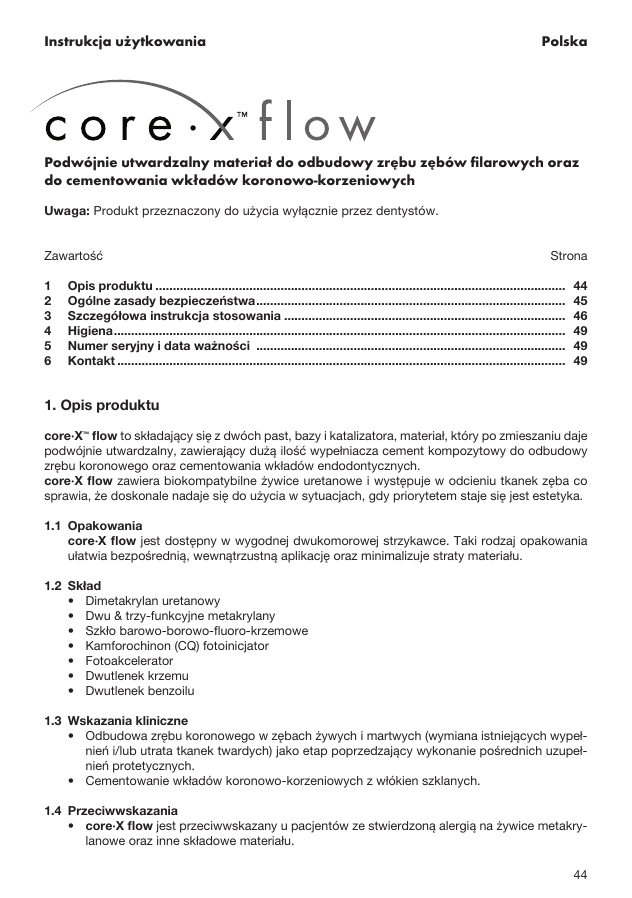 Instrukcja użytkowania Polska Podwójnie utwardzalny materiał do odbudowy zrębu zębów filarowych oraz do cementowania wkładów koronowo-korzeniowych Uwaga: Produkt przeznaczony do użycia wyłącznie przez dentystów. Zawartość 1 2 3 4 5 6 Strona Opis produktu....................................................................................................................... Ogólne zasady bezpieczeństwa.......................................................................................... Szczegółowa instrukcja stosowania.................................................................................. Higiena................................................................................................................................... Numer seryjny i data ważności .......................................................................................... Kontakt.................................................................................................................................. 44 45 46 49 49 49 1. Opis produktu core·X™ flow to składający się z dwóch past, bazy i katalizatora, materiał, który po zmieszaniu daje podwójnie utwardzalny, zawierający dużą ilość wypełniacza cement kompozytowy do odbudowy zrębu koronowego oraz cementowania wkładów endodontycznych. core·X flow zawiera biokompatybilne żywice uretanowe i występuje w odcieniu tkanek zęba co sprawia, że doskonale nadaje się do użycia w sytuacjach, gdy priorytetem staje się jest estetyka. 1.1 Opakowania core·X flow jest dostępny w wygodnej dwukomorowej strzykawce. Taki rodzaj opakowania ułatwia bezpośrednią, wewnątrzustną aplikację oraz minimalizuje straty materiału. 1.2 Skład • Dimetakrylan uretanowy • Dwu & trzy-funkcyjne metakrylany • Szkło barowo-borowo-fluoro-krzemowe • Kamforochinon (CQ) fotoinicjator • Fotoakcelerator • Dwutlenek krzemu • Dwutlenek benzoilu 1.3 Wskazania kliniczne • Odbudowa zrębu koronowego w zębach żywych i martwych (wymiana istniejących wypełnień i/lub utrata tkanek twardych) jako etap poprzedzający wykonanie pośrednich uzupełnień protetycznych. • Cementowanie wkładów koronowo-korzeniowych z włókien szklanych. 1.4 Przeciwwskazania • core·X flow jest przeciwwskazany u pacjentów ze stwierdzoną alergią na żywice metakrylanowe oraz inne składowe materiału. 44 1.5 Kompatybilne systemy wiążące core·X flow należy stosować po uprzedniej aplikacji odpowiedniego systemu wiążącego do zębiny i szkliwa. core·X flow jest kompatybilny z wieloma systemami wiążącymi do szliwa i zębiny, w tym ze wszystkimi systemami wiążącymi firmy DENTSPLY przeznaczonymi do użycia z podwójnie lub chemoutwardzalnymi materiałami wypełniającymi (patrz pełne wersje Instrukcji Stosowania wybranych systemów wiążących). Inne systemy wiążące do szkliwa i zębiny mogą być wykorzystywane wyłącznie na odpowiedzialność lekarza praktyka. 2 Ogólne zasady bezpieczeństwa Należy zapoznać się z następującymi ogólnymi i szczegółowymi zasadami bezpiecznego użytkowania zawartymi w pozostałych częściach instrukcji. 2.1 Środki ostrożności • core·X flow zawiera polimeryzujące monomery ,które mogą wywoływać podrażnienia skóry, oczu i błon śluzowych oraz mogą prowadzić do wystąpienia objawów alergicznego, kontaktowego dermatitis u niektórych wrażliwych pacjentów. • Unikać kontaktu z oczami, aby zapobiec podrażnieniom lub potencjalnemu uszkodzeniu rogówki. W przypadku bezpośredniego kontaktu z oczami należy natychmiast przepłukać je dużą ilością wody i skierować pacjenta do lekarza okulisty. • Unikać kontaktu ze skórą, aby zapobiec podrażnieniom i możliwej do wystąpienia odpowiedzi alergicznej. W razie bezpośredniego kontaktu może pojawić się na skórze zaczerwienie w postaci rumienia. Po bezpośrednim kontakcie należy dokładnie zetrzeć materiał z danego miejsca gazikiem, a następnie przemyć je dokładnie wodą i mydłem. Jeśli pojawi się zaczerwienienie skóry lub inna reakcja alergiczna należy przerwać stosowanie materiału i skontaktować się z lekarzem ogólnym. • Unikać kontaktu z tkankami miękkimi/błonami śluzowymi, aby zapobiec wystąpieniu objawów zapalnych. Jeśli dojdzie jednak do bezpośredniego kontaktu to należy usunąć materiał gazikiem, a następnie spłukać dużą ilością wody. Jeśli te objawy utrzymują się dłużej pacjent powinien skontaktować się z lekarzem. 2.2 Uwagi specjalne 1. Ten produkt należy stosować wyłącznie zgodnie z zaleceniami zawartymi w instrukcji stosowania. Użycie materiału niezgodne z jego przeznaczeniem opisanym szczegółowo w instrukcji stosowania może nastąpić tylko na wyłączną odpowiedzialność lekarza praktyka. 2. Kontakt ze śliną lub krwią w czasie wykonywania wypełnienia może doprowadzić do jego osłabienia Zaleca się stosowanie koferdamu lub innych adekwatnych do sytuacji klinicznej sposobów izolacji. 3. Zaleca się stosowanie ochronnych okularów, maseczek, ubrania ochronnego oraz rękawiczek. Rekomendujemy także stosowanie okularów ochronnych dla pacjentów. 4. Strzykawka musi być dokładnie zamykana oryginalną zakrętką po każdym użyciu. 5. core·X flow jest przeznaczony do stosowania jako produkt podwójnie utwardzalny. Aby osiągnąć optymalny stopień utwardzenia należy postępować zgodnie ze szczegółową instrukcją postępowania. Metody polimeryzacji świetlnej, podwójnego oraz chemicznego utwardzania są zawarte w poszczególnych etapach aplikacji. 6. Aby osiągnąć najlepsze właściwości core·X flow powinien być mieszany w równych ilościach objętościowych bezpośrednio przez końcówki mieszające. Zmiany proporcji 1:1 mogą negatywnie wpłynąć na czas pracy oraz pogorszyć ostateczne właściwości fizyczne produktu. Dozowanie i mieszanie bez wykorzystania dołączonych do opakowania końcówek nie jest zalecane. 7. core·X flow p