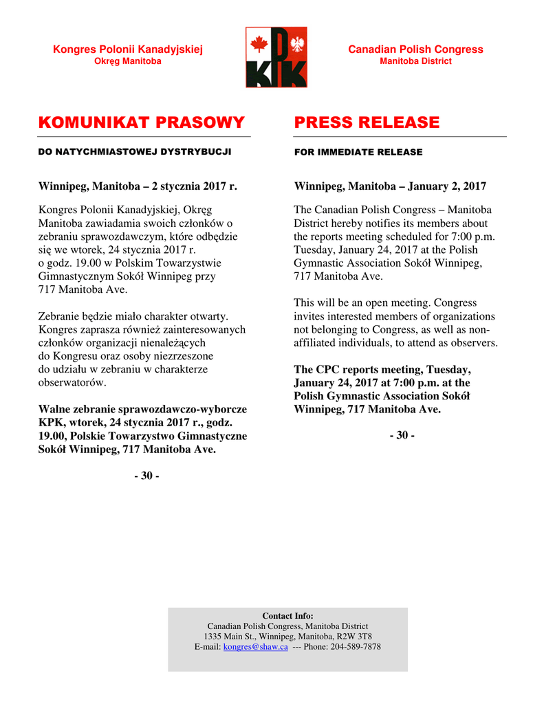 Kongres Polonii Kanadyjskiej Canadian Polish Congress Okręg Manitoba Manitoba District KOMUNIKAT PRASOWY PRESS RELEASE DO NATYCHMIASTOWEJ DYSTRYBUCJI FOR IMMEDIATE RELEASE Winnipeg, Manitoba – 2 stycznia 2017 r. Winnipeg, Manitoba – January 2, 2017 Kongres Polonii Kanadyjskiej, Okręg Manitoba zawiadamia swoich członków o zebraniu sprawozdawczym, które odbędzie się we wtorek, 24 stycznia 2017 r. o godz. 19.00 w Polskim Towarzystwie Gimnastycznym Sokół Winnipeg przy 717 Manitoba Ave. The Canadian Polish Congress – Manitoba District hereby notifies its members about the reports meeting scheduled for 7:00 p.m. Tuesday, January 24, 2017 at the Polish Gymnastic Association Sokół Winnipeg, 717 Manitoba Ave. Zebranie będzie miało charakter otwarty. Kongres zaprasza również zainteresowanych członków organizacji nienależących do Kongresu oraz osoby niezrzeszone do udziału w zebraniu w charakterze obserwatorów. Walne zebranie sprawozdawczo-wyborcze KPK, wtorek, 24 stycznia 2017 r., godz. 19.00, Polskie Towarzystwo Gimnastyczne Sokół Winnipeg, 717 Manitoba Ave. This will be an open meeting. Congress invites interested members of organizations not belonging to Congress, as well as nonaffiliated individuals, to attend as observers. The CPC reports meeting, Tuesday, January 24, 2017 at 7:00 p.m. at the Polish Gymnastic Association Sokół Winnipeg, 717 Manitoba Ave. - 30 - Contact Info: Canadian Polish Congress, Manitoba District 1335 Main St., Winnipeg, Manitoba, R2W 3T8 E-mail: [email protected] --- Phone: 204-589-7878 - 30 -