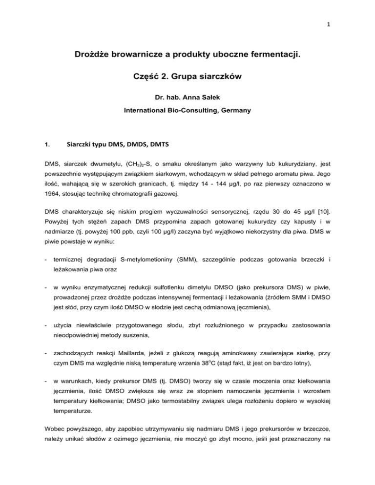 1 Drożdże browarnicze a produkty uboczne fermentacji. Część 2. Grupa siarczków Dr. hab. Anna Sałek International Bio-Consulting, Germany 1. Siarczki typu DMS, DMDS, DMTS DMS, siarczek dwumetylu, (CH3)2-S, o smaku określanym jako warzywny lub kukurydziany, jest powszechnie występującym związkiem siarkowym, wchodzącym w skład pełnego aromatu piwa. Jego ilość, wahającą się w szerokich granicach, tj. między 14 - 144 µg/l, po raz pierwszy oznaczono w 1964, stosując technikę chromatografii gazowej. DMS charakteryzuje się niskim progiem wyczuwalności sensorycznej, rzędu 30 do 45 µg/l [10]. Powyżej tych stężeń zapach DMS przypomina zapach gotowanej kukurydzy czy kapusty i w nadmiarze (tj. powyżej 100 ppb, czyli 100 µg/l) zaczyna być wyjątkowo niekorzystny dla piwa. DMS w piwie powstaje w wyniku: - termicznej degradacji S-metylometioniny (SMM), szczególnie podczas gotowania brzeczki i leżakowania piwa oraz - w wyniku enzymatycznej redukcji sulfotlenku dimetylu DMSO (jako prekursora DMS) w piwie, prowadzonej przez drożdże podczas intensywnej fermentacji i leżakowania (źródłem SMM i DMSO jest słód, przy czym ilość DMSO w słodzie jest cechą odmianową jęczmienia), - użycia niewłaściwie przygotowanego słodu, zbyt rozluźnionego w przypadku zastosowania nieodpowiedniej metody suszenia, - zachodzących reakcji Maillarda, jeżeli z glukozą reagują aminokwasy zawierające siarkę, przy czym DMS ma względnie niską temperaturę wrzenia 38oC (stąd fakt, iż jest on bardzo lotny), - w warunkach, kiedy prekursor DMS (tj. DMSO) tworzy się w czasie moczenia oraz kiełkowania jęczmienia, ilość DMSO zwiększa się wraz ze stopniem namoczenia jęczmienia i wzrostem temperatury kiełkowania; DMSO jako termostabilny związek ulega rozłożeniu dopiero w wysokiej temperaturze. Wobec powyższego, aby zapobiec utrzymywaniu się nadmiaru DMS i jego prekursorów w brzeczce, należy unikać słodów z ozimego jęczmienia, nie moczyć go zbyt mocno, jeśli jest przeznaczony na 2 słód, nie stosować podwyższonej temperatury roszenia słodu, nie wydłużać czasu roszenia słodu, stosować wyższą temperaturę końcową suszenia słodu (85°C w ciągu co najmniej 3 godzin), intensywnie, minimum przez 1 godzinę, gotować brzeczkę (celem usunięcia DMS), w stosunkowo szybkim tempie opróżniać Whirlpool i błyskawicznie schłodzić brzeczkę, aby nie dopuścić do ponownego tworzenia się DMS. Znaczna część prekursorów wędruje do kiełków korzeniowych, tak że w gotowym, wysuszonym, polerowanym słodzie ilość ich jest znacznie mniejsza. Pod wpływem ciepła (suszenie, zacieranie, gotowanie brzeczki) prekursor DMS ulega rozpadowi, tworząc lotny DMS, z którego po utlenieniu powstaje "nieaktywny" sulfotlenek dimetylowy (DMS-O ). DMS-O to substancja o bardzo wysokiej temperaturze wrzenia i w związku z tym w czasie zacierania słodu przechodzi całkowicie do brzeczki. Czasami drożdże przetwarzają DMS-O w DMS. Inny „nieaktywny" prekursor, SMM, jest przez drożdże wchłaniany i nie przekształcany w DMS. DMS natomiast, na skutek podwyższonej temperatury podsuszania słodu, jest redukowany. Duży wpływ na jego zawartość ma również temperatura dosuszania. Dosuszanie w temperaturze 70oC nie jest wystarczające do całkowitego usunięcia DMS ze słodu, nawet przy zwykle stosowanej temperaturze, wynoszącej 80oC przez 5 godzin. Podnosząc temperaturę suszenia słodu z 80 do 85oC i utrzymując ją przez 4 godziny - można uzyskać zmniejszenie zawartości, ale prekursora DMS, o około 40%. Inną zaletą stosowania wyższej temperatury suszenia słodu jest również rozległa inaktywacja jego lipooksygenaz. Lipooksygenazy, bowiem, katalizują utlenianie kwasów tłuszczowych do wodoronadtlenków, z których następnie tworzą się związki karbonylowe odpowiedzialne za smak i zapach "starego" piwa. Problem z wysokim stężeniem prekursora DMS (np. DMSO) znacznie łatwiej jest rozwiązać w słodowni, aniżeli w browarze, tym bardziej, że w browarach istnieje tendencja do skracania czasu i obniżania temperatury gotowania brzeczki, co uniemożliwia rozłożenie i usunięcie dużych ilości DMSO. Ten prekursor ulatnia się całkowicie, jeżeli gotowanie trwa 75 do 80 minut w temperaturze 106 do 107oC. Obecnie takiego procesu już się nie przeprowadza ze względu na obciążenie termiczne nastawu. Brzeczkę natomiast gotuje się 60 do 70 minut w 102 do 104oC. Jednakże i takie warunki przygotowywania brzeczki stwarzają problemy. Podczas gotowania brzeczki w kotle warzelnym nie jest możliwe nadrobienie nieefektywnego procesu usuwania DMS podczas wytwarzania słodu, dlatego wymaga się, ażeby zawartość, np. SMM (innego prekursora DMS) w słodzie wynosiła maksymalnie 15 mg/kg. Efektywność odparowania lotnych składników, szczególnie DMS, można podnieść przy pomocy specjalnych parasoli do rozdzielania brzeczki oraz w wyniku jej "dynamicznego gotowania". System ten ma polegać nie na utrzymywaniu stałej wysokiej temperatury (103-105oC) gotowania, lecz na zastosowaniu tzw. odpuszczania brzeczki poprzez zmienne ciśnienie. Skutkiem tego ujednolica się brzeczkę w kotle warzelnym, ponieważ wznoszące się pęcherzyki pary w wyniku rozprężania 3 powodują jej silne mieszanie. Wznoszące się pęcherzyki pary jednocześnie "przemywają gazowo" całą objętość brzeczki. W konsekwencji osiąga się szybsze usuwanie strąconych niewłaściwych związków aromatycznych, stąd dzięki temu może być skrócony czas gotowania i całkowite odparowanie lotnych związków siarkowych bez niekorzystnych efektów w całym procesie gotowania brzeczki. Istotne jest, aby podczas procesu gotowaniania brać pod uwagę również inne parametry. Uwzględnione muszą być okresy utrzymania gorącej brzeczki przed i po gotowaniu. Nie ma wątpliwości, że w tej fazie odtwarzają się związki DMS, jak również związki furfurylowe, co wpływa negatywnie na s
