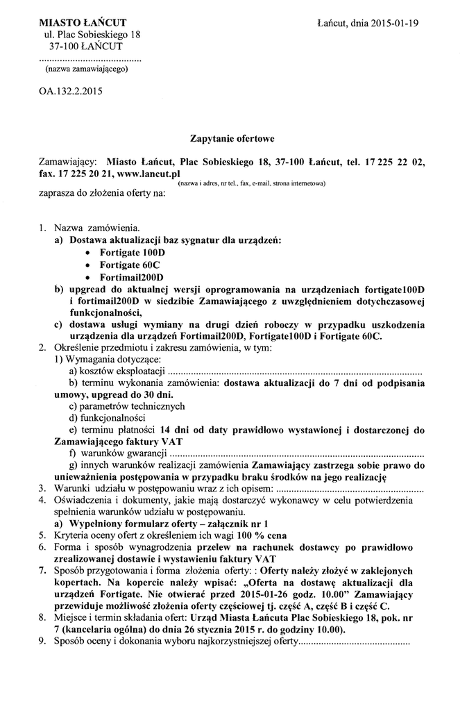 MIASTO LAN-CUT ul. Plac Sobieski ego 18 37-100 LANCUT Zamawiaj'lcy: Miasto Laneut, Plae Sobieskiego 18, 37-100 Laneut, tel. 17225 22 02, fax. 172252021, www.laneut.pl (nazwa i adres, ill tel., fax, e-mail, strona intemetowa) 1. Nazwa zam6wienia. a) Dostawa aktualizaeji baz sygnatur dla urz~dzen: • Fortigate 100D • Fortigate 60C • Fortimail200D b) upgread do aktualnej wersji oprogramowania na urz~dzeniaeh fortigatel00D i fortimail200D w siedzibie Zamawiaj~eego z uwzgl~dnieniem dotyehezasowej funkejonalnosci, e) dostawa uslugi wymiany na drugi dzien roboezy w przypadku uszkodzenia urz~dzenia dla urz~dzen Fortimail200D, Fortigatel00D i Fortigate 60C. 2. Okreslenie przedmiotu i zakresu zam6wienia, w tym: 1) Wymagania dotycz'lce: a) koszt6w eksploatacji . b) terminu wykonania zam6wienia: dostawa aktualizaeji do 7 dni od podpisania umowy, upgread do 30 dni. c) parametr6w technicznych d) funkcjonalnosci e) terminu platnosci 14 dni od daty prawidlowo wystawionej i dostarezonej do Zamawiaj~eego faktury VAT f) warunk6w gwarancji . g) innych warunk6w realizacji zam6wienia Zamawiaj~ey zastrzega sobie prawo do uniewaznienia post~powania w przypadku braku srodkow na jego realizaej~ 3. Warunki udzialu w postypowaniu wraz z ich opisem: . 4. Oswiadczenia i dokumenty, jakie maj'l dostarczy6 wykonawcy w celu potwierdzenia spelnienia warunk6w udzialu w postypowaniu. a) Wypelniony formularz oferty - zal~eznik nr 1 5. Kryteria oceny ofert z okresleniem ich wagi 100 % eena 6. Forma i spos6b wynagrodzenia przelew na raehunek dostawey po prawidlowo zrealizowanej dostawie i wystawieniu faktury VAT 7. Spos6b przygotowania i forma zlozenia oferty: : Oferty nalezy zlozyc w zaklejonyeh kopertaeh. Na kopercie nalezy wpisac: "Oferta na dostaw~ aktualizaeji dla urz~dzen Fortigate. Nie otwierac przed 2015-01-26 godz. 10.00" Zamawiaj~ey przewiduje mozliwosc zlozenia oferty ez~sciowej tj. ez~sc A, ez~sc B i ez~sc C. 8. Miejsce i termin skladania ofert: Urz~d Miasta Laneuta Plae Sobieskiego 18, pok. nr 7 (kaneelaria ogolna) do dnia 26 styeznia 2015 r. do godziny 10.00). 9. Spos6b oceny i dokonania wyboru najkorzystniejszej oferty . Zal,!czniki: 1) Fonnularz oferty Sporz,!dzil: ~P/~~9:~~!~ ....~~e./~ Podpis pracownik<J'~' Zatwierdzil: .....'P~d~;; i~""""'" Lp. 1 2 3 Opis: Dla urz,!dzenia FortigatelOOD Dla urz,!dzenia Fortigate60C Dla urz,!dzenia Fortirnai1200D RAZEM: ceny brutto: Cena brutto zl b) w cz~sci B: Lp. 1 2 Opis: Dla urz,!dzenia Fortigatel OOD Dla urz,!dzenia Fortirnai1200D RAZEM: ceny brutto: c) w cz~sci c: Lp. Opis: 1 Dla urz,!dzenia Fortigate 1OOD 2 Dla urz,!dzenia Fortigate60C Dla urz,!dzenia Fortirnai1200D 3 RAZEM: Cena brutto zl Cena brutto 7. Oswiadczam, wykonac na technicznym 8. Zal,!czniki: 1) (..) ze zapoznalem siy z opisem przedmiotu zamowienia i zobowi,!zuje siy go wyZej wskazanych warunkach. Oswiadczam, ze dysponujy potencjalem i osobami zdolnymi do wykonania zamowienia. . .