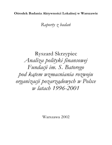 Ośrodek Badania Aktywności Lokalnej w Warszawie Raporty z badań Ryszard Skrzypiec Analiza polityki finansowej Fundacji im. S. Batorego pod kątem wzmacniania rozwoju organizacji pozarządowych w Polsce w latach 1996-2001 Warszawa 2002 Ośrodek Badania Aktywności Lokalnej w Warszawie Spis treści Finansowanie rozwoju infrastruktury Trzeciego sektora w Polsce przez Fundację Batorego w latach 1996-2001.........................................................................................................................3 Tabela 1. Najwięksi grantobiorcy środków Fundacji im. S. Batorego w latach 1996-2001.. 8 2 Ośrodek Badania Aktywności Lokalnej w Warszawie Finansowanie rozwoju infrastruktury Trzeciego sektora w Polsce przez Fundację Batorego w latach 1996-2001 Za ilustrację naszych rozważań na temat polityki budowania instytucji tzw. infrastruktury sektora organizacji pozarządowych w Polsce w pierwszej dekadzie transformacji ustrojowej posłuży nam analiza wydatków Fundacji im. S. Batorego. Fundację Batorego należy zaliczyć do grona największych podmiotów finansujących aktywność obywatelską na rzecz dobra wspólnego w Polsce. I to zarówno pod względem wielkości wolumenu środków, jak i rozległości obszarów oraz form działania. Wydzielone programy obejmują swym zainteresowaniem szerokie spektrum inicjatyw: od akademickich i edukacyjnych, przez młodzieżowe, w sferze kultury, pomocy społecznej, profilaktyki uzależnień i medycyny po standardy funkcjonowania państwa. Wśród dotowanych przedsięwzięć znajdujemy zarówno działania operacyjne realizowane przez tzw. organizacje podstawowe, infrastrukturalne zorientowane na budowanie konkretnych instytucji, jak i bardzo specjalistyczne projekty realizowane przez instytucje typu think-tank. Ze środków będących w dyspozycji Fundacji korzystają przede wszystkim polskie organizacje pozarządowe. Należy w tym miejscu zauważyć, że w kręgu zainteresowania Fundacji leży również inicjowanie działań za naszą wschodnią granicą. Wybór Fundacji Batorego został podyktowany także faktem, że jest to jedyny tego typu podmiot, którego kompletnymi danymi finansowymi za okres kilku ostatnich lat dysponujemy. To pozwala spojrzeć na realizowaną przezeń politykę z różnych perspektyw. Na potrzeby analiz dokonaliśmy zestawienia kilku typów dotacji: • z programu organizacji pozarządowych – instytucjonalnych, nagród dla organizacji pozarządowych, na tworzenie centrów wolontariatu, funduszy lokalnych i instytucji wspierających funkcjonowanie organizacji (fora, federacje itp.) przeznaczonych na projekty grantowe, • z programu prawnego – na tworzenie biur porad obywatelskich, • z programu kobiecego – na profesjonalizację i podnoszenie standardów działania organizacji (pochodzące z dotacji Fundacji Forda w latach 1999-2000), • z pozostałych programów – na działania zorientowane na tworzenie warunków dla rozwoju organizacji pozarządowych – m.in. w zakresie mediów, dostępu do Internetu, dostarczania informacji, udzielania grantów, szkoleń, pomocy merytorycznej itd. 3 Ośrodek Badania Aktywności Lokalnej w Warszawie Podstawę selekcji stanowiło uznanie1, że celem udzielenia tych właśnie dotacji było – bezpośrednie lub pośrednie - wsparcie procesu rozwoju sektora organizacji pozarządowych, w tym także poprzez budowę jego infrastruktury. W latach 1996-2001 Fundacja Batorego dysponowała środkami w łącznej wysokości przekraczającej kwotę 200 mln PLN. W tym czasie prowadziła 26 programów tematycznych, z czego stale 11: akademicki, wschód, Forum Europy Środkowej i Wschodniej, kobiecy, Komisja Edukacji w Dziedzinie Alkoholizmu, kulturalny, media, medyczny, młodzieżowy, organizacji pozarządowych oraz wydawniczy. Niektóre z tych programów zmieniały w tym czasie nazwy i zakres zainteresowania, w ramach niektórych wyodrębniano podprogramy i specjalistyczne ścieżki dotacji (np. w kobiecym „Regionalny Program Kobiecy”, organizacji pozarządowych „Szklarnia”, dotacje instytucjonalne itd.). Pod względem wolumenu środków największym programem okazał się program organizacji pozarządowych z budżetem ponad 40 mln PLN (20% całości środków Fundacji). Następne w kolejności, to: akademicki (nieco ponad 19 mln PLN), kulturalny (około 15,5 mln PLN), Forum EŚiW (ponad 11 mln PLN) i młodzieżowy (nieco ponad 10 mln PLN). Z innych dostępnych dla organizacji pozarządowych należy wyróżnić: internetowy (8,7), kobiecy (8,3), powódź (7,5 - w latach 1997-1998), wschód (5,7), prawny (4,8 - od 1998) i społeczność lokalna (4,6 – w latach 1997-2000). Natomiast wielkość wolumenu środków przekazanych na wzmacnianie procesu rozwoju sektora organizacji w Polsce oszacowaliśmy na około 48,5 mln PLN, co stanowiło około ¼ łącznego budżetu Fundacji Batorego w tym czasie. Co prawda, Z powyższych środków, jak wynika z opracowanego zestawienia, skorzystało aż 191 podmiotów2, jednakże rozpiętość pomiędzy benefecjentami największych i najmniejszych dotacji sięga wielu milionów złotych. Dlatego dokonaliśmy podziału tej zbiorowości na trzy grupy podmiotów ze względu na łączną wysokość otrzymanych w latach 1996-2001 środków: • 11 podmiotów otrzymało środki w wysokości przekraczającej 1 mln PLN (łącznie około 25,7 mln – 53%) - aż 9 instytucji ma swoją siedzibę w Warszawie, zaś dwie pozostałe, to „Komitet Organizacyjny Obchodów 1000-lecia Miasta Gdańska” oraz krakowska Fundacja „Partnerstwo dla Środowiska”, której przekazano środki z przeznaczeniem na dotacje oraz realizację przedsięwzięć ekologicznych, • 69 podmiotów otrzymało środki w wysokości od 100 000 do 999 999 PLN (łącznie około 17,8 mln – 37%), • 111 podmiotów otrzymało środki w wysokości nie przekraczającej kwoty 99 999 PLN (łącznie około 5,0 mln – 10%). Największą pulę środków otrzymała Fundacja