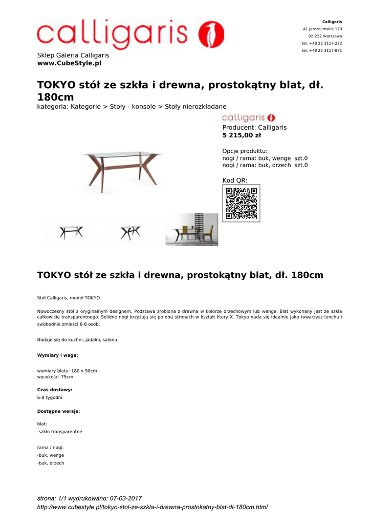 Calligaris Al. Jerozolimskie 179 02-222 Warszawa tel. +48 22 3117-222 tel. +48 22 3117-871 Sklep Galeria Calligaris www.CubeStyle.pl TOKYO stół ze szkła i drewna, prostokątny blat, dł. 180cm kategoria: Kategorie > Stoły - konsole > Stoły nierozkładane Producent: Calligaris 5 215,00 zł Opcje produktu: nogi / rama: buk, wenge szt.0 nogi / rama: buk, orzech szt.0 Kod QR: TOKYO stół ze szkła i drewna, prostokątny blat, dł. 180cm Stół Calligaris, model TOKYO Nowoczesny stół z oryginalnym designem. Podstawa zrobiona z drewna w kolorze orzechowym lub wenge. Blat wykonany jest ze szkła całkowicie transparentnego. Solidne nogi krzyżują się po obu stronach w kształt litery X. Tokyo nada się idealnie jako towarzysz lunchu i swobodnie zmieści 6-8 osób. Nadaje się do kuchni, jadalni, salonu. Wymiary i waga: wymiary blatu: 180 x 90cm wysokość: 75cm Czas dostawy: 6-8 tygodni Dostępne wersje: blat: -szkło transparentne rama / nogi: -buk, wenge -buk, orzech strona: 1/1 wydrukowano: 07-03-2017 http://www.cubestyle.pl/tokyo-stol-ze-szkla-i-drewna-prostokatny-blat-dl-180cm.html