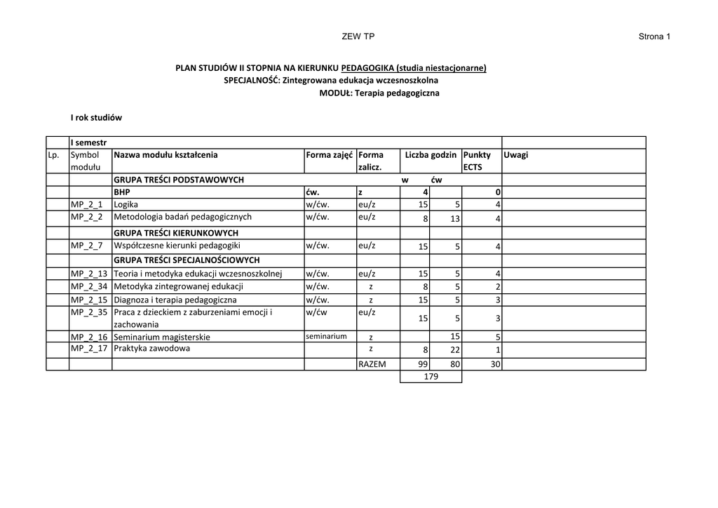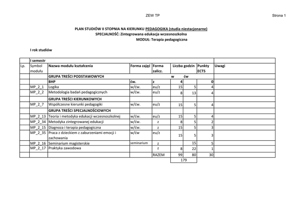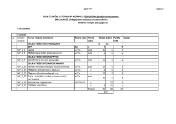 ZEW TP Strona 1 PLAN STUDIÓW II STOPNIA NA KIERUNKU PEDAGOGIKA (studia niestacjonarne) SPECJALNOŚĆ: Zintegrowana edukacja wczesnoszkolna MODUŁ: Terapia pedagogiczna I rok studiów Lp. I semestr Symbol Nazwa modułu kształcenia modułu GRUPA TREŚCI PODSTAWOWYCH BHP MP_2_1 Logika MP_2_2 Metodologia badań pedagogicznych MP_2_7 MP_2_13 MP_2_34 MP_2_15 MP_2_35 MP_2_16 MP_2_17 GRUPA TREŚCI KIERUNKOWYCH Współczesne kierunki pedagogiki GRUPA TREŚCI SPECJALNOŚCIOWYCH Teoria i metodyka edukacji wczesnoszkolnej Metodyka zintegrowanej edukacji wczesnoszkolnej Diagnoza i terapia pedagogiczna Praca z dzieckiem z zaburzeniami emocji i zachowania Seminarium magisterskie Praktyka zawodowa Forma zajęć Forma zalicz. ćw. w/ćw. w/ćw. z eu/z eu/z w/ćw. w/ćw. w/ćw. w/ćw. w/ćw seminarium Liczba godzin Punkty Uwagi ECTS w ćw 4 0 15 5 4 8 13 4 eu/z 15 5 4 eu/z z z eu/z 15 8 15 5 5 5 4 2 3 15 5 3 15 22 80 5 1 30 z z RAZEM 8 99 179 ZEW TP Lp. II semestr Symbol Nazwa modułu kształcenia modułu GRUPA TREŚCI PODSTAWOWYCH MP_2_3 Współczesne koncepcje filozofii i etyki MP_2_4 Analiza statystyczna w badaniach MP_2_5 Współczesne problemy socjologii MP_2_6 Współczesne problemy psychologii GRUPA TREŚCI SPECJALNOŚCIOWYCH MP_2_36 Metodyka nauczania języka polskiego dzieci w wieku wczesnoszkolnym MP_2_37 Metodyka nauczania matematyki dzieci w wieku wczesnoszkolnym MP_2_38 Problemy niedostosowania społecznego MP_2_16 Seminarium magisterskie MP_2_17 Praktyka zawodowa Forma zajęć Forma zalicz. w/ćw. ćw w/ćw. w/ćw. eu/z z eu/z eu/z w/ćw. eu/z w/ćw. eu/z konw. z z z seminarium RAZEM Strona 2 Liczba godzin Punkty ECTS w ćw 15 5 8 15 5 15 5 Uwagi 4 1 4 4 15 5 4 15 5 4 13 15 2 5 13 77 226 138 364 2 30 ZEW TP Strona 3 II rok studiów Lp. III semestr Symbol Nazwa modułu kształcenia modułu GRUPA TREŚCI KIERUNKOWYCH MP_2_8 Andragogika MP_2_9 Pedagogika porównawcza GRUPA TREŚCI SPECJALNOŚCIOWYCH MP_2_39 Metodyka nauczania środowiska dzieci w wieku wczesnoszkolnym MP_2_40 Metodyka nauczania plastyki dzieci w wieku wczesnoszkolnym MP_2_41 Metodyka nauczania muzyki dzieci w wieku wczesnoszkolnym MP_2_16 Seminarium magisterskie Forma zajęć Forma zalicz. w/ćw. w/ćw. eu/z eu/z w/ćw. eu/z w/ćw. eu/z w/ćw. eu/z seminarium 15 5 4 8 5 3 8 5 3 8 5 3 15 5 77 2 5 3 z MP_2_17 Praktyka zawodowa GRUPA TREŚCI MODUŁU TEMATYCZNEGO MP_2_50 Specjalne potrzeby edukacyjne – diagnoza i terapia MP_2_51 Diagnoza i terapia uczniów ze specyficznymi problemami w uczeniu się Liczba godzin Punkty Uwagi ECTS w ćw 15 5 4 z 13 w/ćw z 15 w/ćw z 13 8 3 RAZEM 95 130 225 30 ZEW TP Lp. Strona 4 IV semestr Symbol Nazwa modułu kształcenia modułu GRUPA TREŚCI KIERUNKOWYCH MP_2_10 Antropologia kulturowa w/ćw. eu/z 15 5 4 MP_2_11 Pedeutologia w/ćw. eu/z 15 5 4 w/ćw. eu/z 8 5 3 w/ćw. eu/z 8 5 3 GRUPA TREŚCI SPECJALNOŚCIOWYCH MP_2_42 Metodyka nauczania wychowania fizycznego dzieci w wieku wczesnoszkolnym MP_2_43 Metodyka nauczania techniki dzieci w wieku wczesnoszkolnym MP_2_33 Zajęcia reedukacyjno-wyrównawcze MP_2_16 Seminarium magisterskie Forma zajęć Forma zalicz. Liczba godzin Punkty ECTS w ćw Uwagi ćw. z 13 2 seminarium z 15 5 10 3 5 63 2 4 30 GRUPA TREŚCI MODUŁU TEMATYCZNEGO MP_2_52 Wybrane zagadnienia wsparcia logopedycznego w/ćw. z 10 MP_2_53 Poradnictwo rodzinne i zawodowe MP_2_54 Socjoterapia i psychoterapia w terapii pedagogicznej z eu/z RAZEM 13 15 84 147 w w/ćw