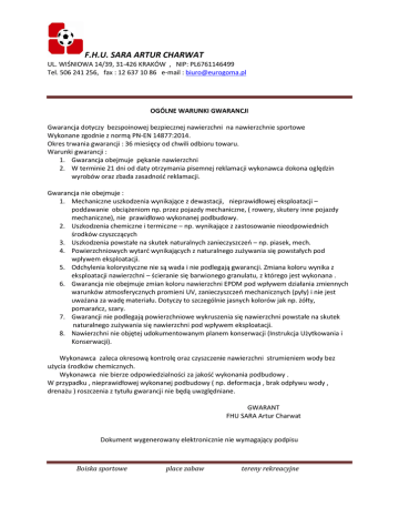 F.H.U. SARA ARTUR CHARWAT UL. WIŚNIOWA 14/39, 31-426 KRAKÓW , NIP: PL6761146499 Tel. 506 241 256, fax : 12 637 10 86 e-mail : [email protected] OGÓLNE WARUNKI GWARANCJI Gwarancja dotyczy bezspoinowej bezpiecznej nawierzchni na nawierzchnie sportowe Wykonane zgodnie z normą PN-EN 14877:2014. Okres trwania gwarancji : 36 miesięcy od chwili odbioru towaru. Warunki gwarancji : 1. Gwarancja obejmuje pękanie nawierzchni 2. W terminie 21 dni od daty otrzymania pisemnej reklamacji wykonawca dokona oględzin wyrobów oraz zbada zasadność reklamacji. Gwarancja nie obejmuje : 1. Mechaniczne uszkodzenia wynikające z dewastacji, nieprawidłowej eksploatacji – poddawanie obciążeniom np. przez pojazdy mechaniczne, ( rowery, skutery inne pojazdy mechaniczne), nie prawidłowo wykonanej podbudowy. 2. Uszkodzenia chemiczne i termiczne – np. wynikające z zastosowanie nieodpowiednich środków czyszczących 3. Uszkodzenia powstałe na skutek naturalnych zanieczyszczeń – np. piasek, mech. 4. Powierzchniowych wytarć wynikających z naturalnego zużywania się powstałych pod wpływem eksploatacji. 5. Odchylenia kolorystyczne nie są wada i nie podlegają gwarancji. Zmiana koloru wynika z eksploatacji nawierzchni – ścieranie się barwionego granulatu, z którego jest wykonana . 6. Gwarancja nie obejmuje zmian koloru nawierzchni EPDM pod wpływem działania zmiennych warunków atmosferycznych promieni UV, zanieczyszczeń mechanicznych (pyły) i nie jest uważana za wadę materiału. Dotyczy to szczególnie jasnych kolorów jak np. żółty, pomarańcz, szary. 7. Gwarancji nie podlegają powierzchniowe wykruszenia się nawierzchni powstałe na skutek naturalnego zużywania się nawierzchni pod wpływem eksploatacji. 8. Nawierzchni nie objętej udokumentowanym planem konserwacji (Instrukcja Użytkowania i Konserwacji). Wykonawca zaleca okresową kontrolę oraz czyszczenie nawierzchni strumieniem wody bez użycia środków chemicznych. Wykonawca nie bierze odpowiedzialności za jakość wykonania podbudowy . W przypadku , nieprawidłowej wykonanej podbudowy ( np. deformacja , brak odpływu wody , drenażu ) roszczenia z tytułu gwarancji nie będą uwzględniane. GWARANT FHU SARA Artur Charwat Dokument wygenerowany elektronicznie nie wymagający podpisu Boiska sportowe place zabaw tereny rekreacyjne