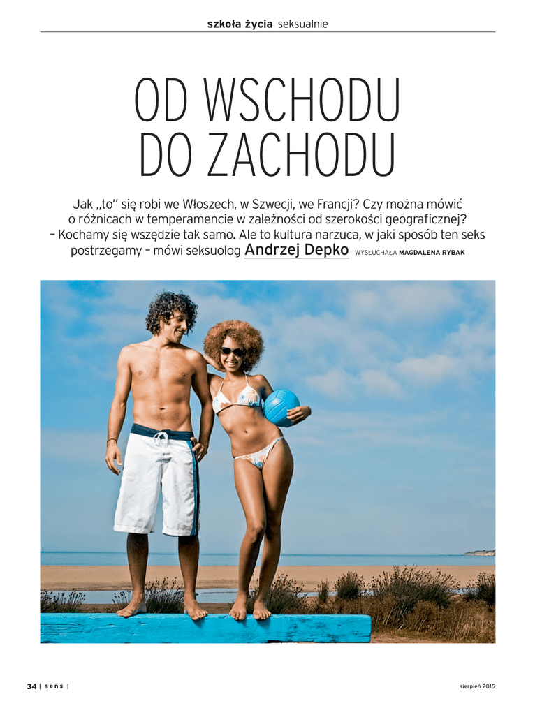 szkoła życia seksualnie Od Wschodu do Zachodu Jak „to” się robi we Włoszech, w Szwecji, we Francji? Czy można mówić o różnicach w temperamencie w zależności od szerokości geograficznej? – Kochamy się wszędzie tak samo. Ale to kultura narzuca, w jaki sposób ten seks postrzegamy – mówi seksuolog Andrzej Depko wysłuchała Magdalena Rybak 34 | sens | sierpień 2015 B ez wątpienia podejście do seksu w różnych częściach świata się różni. Żeby zrozumieć seksualność danej nacji, musimy poznać jej historię i przyjrzeć się temu, jak ewoluowała. W każdym państwie panują inne obyczaje, są one również inne w regionach, klasach i grupach społecznych. Ostatecznie jednak o tym, jak się kochamy, decyduje nie szerokość geograficzna, a system wierzeń, zasad i przekonań, którymi nasiąkamy, funkcjonując przynajmniej 18 lat w danej rodzinie i kręgu społecznym. Mogą one zachęcić nas do doskonalenia się w ars amandi, ale też spowodować, że pragnienie przyjemności będziemy wiązać z poczuciem dyskomfortu, bo uznamy je za nieprzyzwoite. Dlatego też dwie osoby wychowane w jednym kraju mogą mieć zupełnie inny zakres doznań erotycznych i inaczej przeżywać swoją seksualność tylko z tego względu, że inne czynniki przyczyniały się do formowania ich poglądów. Jedna może mieć opór przed seksem oralnym, bo w domu słyszała, że od pasa w dół jest się nieczystym. I w sytuacji, w której partner chce ją całować w łechtaczkę albo – co gorsza – oczekuje wzajemności, czyli pieszczoty prącia, ona czuje, że robi coś złego. Z kolei osoba, było w wiktoriańskiej Anglii, która która nabyła umiejętność cieszenia wprowadziła rygorystyczny system się ze swojej seksualności, nie ma zakazów i nakazów dotyczących kompleksów z tego powodu, może moralności, ale jednocześnie kwitło czerpać z obu aktywności wielką tam podziemie seksualne. Jednym przyjemność. Dlatego czynnikiem numer jeden determinującym naz kanałów realizacji wypartych posze podejście do seksu jest nie kraj trzeb seksualnych stała się sztuka erotyczna tworzona na potrzeby pochodzenia, a stopień, w jakim ówczesnych dżentelmenów. religia wpływa na kształJej obsceniczność może swotowanie naszego systemu bodnie konkurować ze współwartości. I dotyczy to Japonia bywa czesnym porno lub sztuką zarówno katolików, jak przedstawiana erotyczną starożytnej Grecji, i protestantów. jako KRÓLESTWO gdzie seksualność była traksex-shopów towana zupełnie naturalnie. Purytanie Jak widać, związek pomięi dżentelmeni i domów masażu. dzy seksem a kulturą jest W Stanach ZjednoczoTymczasem jest złożony. Nie zrozumie się nych, które wydają się to kraj o dużej ojczyzną luzu i otwarzachowań seksualnych bez tolerancji tości, duża część propoznania istoty danej kultui wyrozumiałości ry i jej uwarunkowań oraz testantów jest bardzo dla różnych restrykcyjna w kwestii historii. Kultura wymusza na seksu, przynajmniej nas dostosowanie zachowań potrzeb seksualnych do obowiązująw warstwie deklarowacych wymogów. I właśnie to nej. Głoszą potępienie dla wymuszenie powoduje, że w kulwielu form zachowań seksualnych, turach purytańskich deklarujemy a w czterech ścianach dają upust rezygnację z pewnych zachowań swoim skrywanym lub wypieranym i potępienie dla nich, choć skrycie potrzebom, stając się klientami prodo nich dążymy. Jaki to ma wpływ stytutek albo biorąc udział w orna psychikę? Tłumienie biologiczgiach seksualnych. Jednym słowem nych potrzeb wpływa niekorzystnie – realizują swoje potrzeby w sposób zupełnie odmienny od modena rozwój osobowości człowieka, pozbawia go radości życia, generuje lu, który przedstawiany jest jako problemy w związkach lub przyczynajbardziej właściwy dla rozwoju nia się do tworzenia podwójnych całego społeczeństwa. Podobnie standardów moralnych. Jaki jest twój seksualny paszport? rzyjrzyj się temu, jak kształtowało się twoje podejście do seksualności. P Jakie przekonania wyniosłaś z domu rodzinnego, jakie przejęłaś od otoczenia? lokalizuj trudności wynikające z tradycji kulturowej, w której się wychowałaś. Z Jakie zachowania postrzegasz jako nieczyste, perwersyjne, zboczone? kreśl, co akceptujesz w sferze seksu – co jest dla ciebie dopuszczalne, O a co absolutnie nie. baj o swój rozwój wewnętrzny poprzez lekturę książek o afirmacji seksualności D oraz warsztaty pracy nad samoświadomością, wglądu w swoje relacje, potrzeby i swoją cielesność. 2015 sierpień A na Wschodzie... Japonia bywa przedstawiana jako kraj domów masażu, sex-shopów i miejsc zaspokajania nietypowych potrzeb, np. fascynacji w ubieraniu pieluszek niemowlęcych. W potocznym wyobrażeniu Japończycy to ludzie, którzy albo ciężko pracują, albo zaspokajają swoje wyrafinowane apetyty seksualne dzięki gotowym na wszystko gejszom. Tymczasem jest to kraj o dużej | sens | 35 tolerancji i wyrozumiałości dla różnych potrzeb. Każdy może spróbować wszystkiego, ale nikt nie jest do tego przymuszany. Jeśli ktoś chce pójść do przybytku, w którym przyjmują kobiety przebrane za postaci z mang, to jego osobista sprawa. I nikt nie jest z tego powodu oceniany. To dobry klimat do rozwoju własnych preferencji erotycznych. Podobny istnieje w Indiach. Wystarczy, spojrzeć na płaskorzeźby świątynne w Khajuraho, prezentujące odważne sceny miłosne, jak seks oralny lub w trójkątach. Gdybyśmy takie świątynie chcieli pobudować w Polsce, to reliefy zostałyby od razu obtłuczone młotkiem przez brygady obrońców moralności. Tymczasem w Indiach są traktowane jako dziedzictwo kulturowe. Indyjskie traktaty o miłości erotycznej – Kamasutra i mniej znana Ananga Ranga – pokazują, jak dużą wagę ówcześni przykładali do sfery seksualności. Kamasutra opisuje różne rodzaje gry wstępnej, m.in. w następstwie ośmiokrotnej kombinacji ośmiu