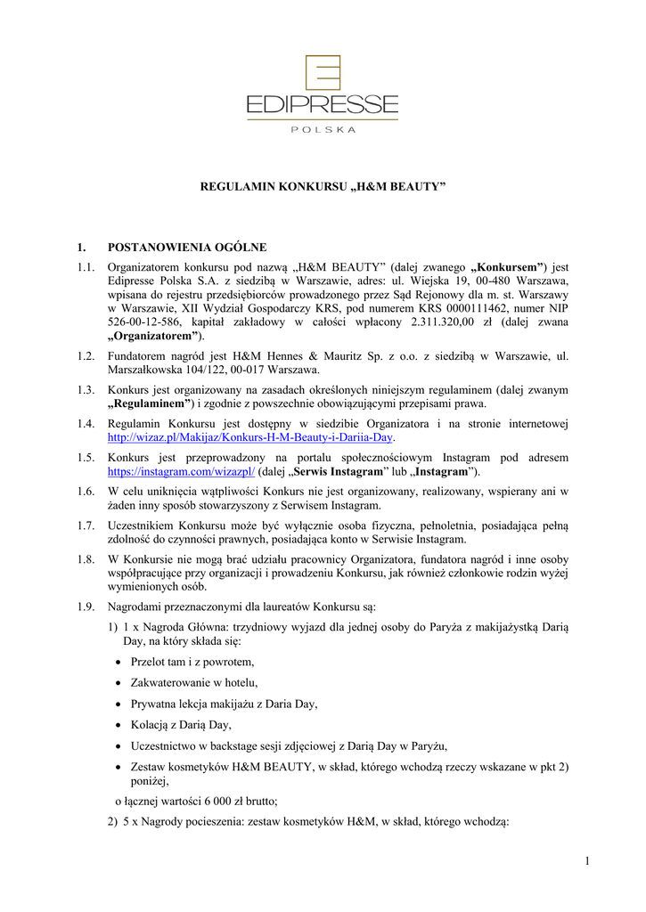 REGULAMIN KONKURSU „H&M BEAUTY” 1. POSTANOWIENIA OGÓLNE 1.1. Organizatorem konkursu pod nazwą „H&M BEAUTY” (dalej zwanego „Konkursem”) jest Edipresse Polska S.A. z siedzibą w Warszawie, adres: ul. Wiejska 19, 00-480 Warszawa, wpisana do rejestru przedsiębiorców prowadzonego przez Sąd Rejonowy dla m. st. Warszawy w Warszawie, XII Wydział Gospodarczy KRS, pod numerem KRS 0000111462, numer NIP 526-00-12-586, kapitał zakładowy w całości wpłacony 2.311.320,00 zł (dalej zwana „Organizatorem”). 1.2. Fundatorem nagród jest H&M Hennes & Mauritz Sp. z o.o. z siedzibą w Warszawie, ul. Marszałkowska 104/122, 00-017 Warszawa. 1.3. Konkurs jest organizowany na zasadach określonych niniejszym regulaminem (dalej zwanym „Regulaminem”) i zgodnie z powszechnie obowiązującymi przepisami prawa. 1.4. Regulamin Konkursu jest dostępny w siedzibie Organizatora i na stronie internetowej http://wizaz.pl/Makijaz/Konkurs-H-M-Beauty-i-Dariia-Day. 1.5. Konkurs jest przeprowadzony na portalu społecznościowym Instagram pod adresem https://instagram.com/wizazpl/ (dalej „Serwis Instagram” lub „Instagram”). 1.6. W celu uniknięcia wątpliwości Konkurs nie jest organizowany, realizowany, wspierany ani w żaden inny sposób stowarzyszony z Serwisem Instagram. 1.7. Uczestnikiem Konkursu może być wyłącznie osoba fizyczna, pełnoletnia, posiadająca pełną zdolność do czynności prawnych, posiadająca konto w Serwisie Instagram. 1.8. W Konkursie nie mogą brać udziału pracownicy Organizatora, fundatora nagród i inne osoby współpracujące przy organizacji i prowadzeniu Konkursu, jak również członkowie rodzin wyżej wymienionych osób. 1.9. Nagrodami przeznaczonymi dla laureatów Konkursu są: 1) 1 x Nagroda Główna: trzydniowy wyjazd dla jednej osoby do Paryża z makijażystką Darią Day, na który składa się: Przelot tam i z powrotem, Zakwaterowanie w hotelu, Prywatna lekcja makijażu z Daria Day, Kolacją z Darią Day, Uczestnictwo w backstage sesji zdjęciowej z Darią Day w Paryżu, Zestaw kosmetyków H&M BEAUTY, w skład, którego wchodzą rzeczy wskazane w pkt 2) poniżej, o łącznej wartości 6 000 zł brutto; 2) 5 x Nagrody pocieszenia: zestaw kosmetyków H&M, w skład, którego wchodzą: 1 Tusz do rzęs: CONTROL CHIC MASCARA 39,90 PLN, Paleta cieni do oczu: SUPER NATURALS 49,90 PLN, Szminka: MAROONED 39,90 PLN, Róż do policzków: APRICOT 29,90 PLN, Eyeliner 22,90 PLN, Paleta do brwi: CARAMEL 24,90 PLN, Żel do brwi: BROW SHAPING GEL 24,90 PLN, Puder brązujący: SHEER TAN 29,90 PLN, Zalotka: 29,90 PLN, o łącznej wartości jednego zestawu 291,1 (słownie: dwieście dziewięćdziesiąt jeden złotych i 10 dziesięć groszy). 1.10 Organizator powoła komisję (zwaną dalej „Komisją”), w skład której wejdzie dwóch przedstawicieli Organizatora i jeden przedstawiciel fundatora nagród. Komisja zobowiązana będzie do pełnienia nadzoru nad przestrzeganiem postanowień Regulaminu przez uczestników i podejmowania innych czynności, wskazanych w Regulaminie. W razie braku porozumienia wszystkich członków Komisji, decyzje Komisji zapadają większością głosów. 2. ZAŁOŻENIA KONKURSU 2.1. Konkurs będzie przeprowadzony w Serwisie Instagram. Ogłoszenie o Konkursie ukaże się w dniu 13.10.2015 r. na stronie internetowej http://wizaz.pl/Makijaz/Konkurs-H-M-Beauty-iDariia-Day oraz w Serwisie Instagram https://instagram.com/wizazpl/. 2.2. Konkurs będzie trwał w dniach od 13.10.2015 r. do 26.10.2015 r. 2.3 Rozwiązanie Konkursu zostanie ogłoszone na portalu społecznościowym https://instagram.com/wizazpl/ w osobnym poście konkursowym, w terminie nie później niż do dnia 03.11.2015 r. Nagrodzeni uczestnicy zostaną otagowani (oznaczeni) w treści posta (nick użytkownika z Instagramu). 3. ZASADY PROWADZENIA KONKURSU 3.1. Konkurs polega na samodzielnym wykonaniu przez uczestniczkę makijażu inspirowanego linią kosmetyków H&M Beauty, następnie na zrobieniu sobie przez uczestniczkę zdjęcia w tym makijażu, prezentowanego na sobie lub modelce (zwane dalej „Zdjęciem”) i zamieszczeniu Zdjęcia na Instagramie na zasadach wskazanych w pkt 3.2 poniżej. W celu uniknięcia wątpliwości osobą biorącą udział w konkursie jest autor makijażu i zdjęcia. 3.2. W celu wzięcia udziału w Konkursie uczestnik powinien: samodzielnie wykonać makijaż kosmetykami H&M Beauty; zrobić Zdjęcie pokazujące makijaż uczesticznki wykonany kosmetykami H&M Beauty; udostępnić Zdjęcie na swoim profilu na Instagramie z wykorzystaniem znacznika #HMBeautyWizazpl #hmbeauty #dariiaday; w opisie Zdjęcia zawrzeć informację jakich kosmetyków z H&M Beauty uczestniczka użyła do wykonania makijażu konkursowego. 3.3. Komisja będzie obradować w dwóch etapach. Przy wyborze najlepszych Zdjęć, zgodnie z procedurą opisaną poniżej, Komisja będzie się kierować własnym uznaniem, biorąc pod uwagę walory estetyczne Zdjęcia, jak również oryginalność i pomysłowość uczestnika – autora Zdjęcia. Decyzje Komisji są ostateczne. Nie ma znaczenia kolejność zgłoszeń. 2 3.4. W pierwszym etapie Komisja wybierze spośród wszystkich poprawnie zamieszczonych na Instagramie Zdjęć 6 (sześć) najlepszych Zdjęć, które wezmą udział w drugim etapie Konkursu. . 3.5. W drugim etapie Komisja wybierze, spośród Zdjęć zakwalifikowanych w ramach pierwszego etapu, zgodnie z pkt. 3.4 powyżej, jedno Zdjęcie, który uzna za najlepsze. 3.6. Laureatem Nagrody Głównej w liczbie 1 zostanie osoba, której Zdjęcie zostanie uznane przez Komisję za najlepsze w drugim etapie Konkursu, o czym mowa w pkt 3.5 powyżej. Laureatami Nagrody pocieszenia w liczbie 5 zostaną osoby, których Zdjęcia Komisja zakwalifikowała do drugiego etapu Konkursu, ale które nie wygrały Nagrody głównej. Nagrody zostaną przyznana po spełnieniu warunków określonych w Regulaminie. 3.7. Jedna osoba może wziąć udział w Konkursie wiele razy, ale może wygrać tylko jedną