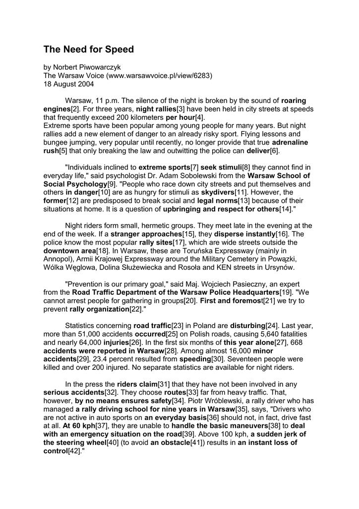 The Need for Speed by Norbert Piwowarczyk The Warsaw Voice (www.warsawvoice.pl/view/6283) 18 August 2004 Warsaw, 11 p.m. The silence of the night is broken by the sound of roaring engines[2]. For three years, night rallies[3] have been held in city streets at speeds that frequently exceed 200 kilometers per hour[4]. Extreme sports have been popular among young people for many years. But night rallies add a new element of danger to an already risky sport. Flying lessons and bungee jumping, very popular until recently, no longer provide that true adrenaline rush[5] that only breaking the law and outwitting the police can deliver[6]. "Individuals inclined to extreme sports[7] seek stimuli[8] they cannot find in everyday life," said psychologist Dr. Adam Sobolewski from the Warsaw School of Social Psychology[9]. "People who race down city streets and put themselves and others in danger[10] are as hungry for stimuli as skydivers[11]. However, the former[12] are predisposed to break social and legal norms[13] because of their situations at home. It is a question of upbringing and respect for others[14]." Night riders form small, hermetic groups. They meet late in the evening at the end of the week. If a stranger approaches[15], they disperse instantly[16]. The police know the most popular rally sites[17], which are wide streets outside the downtown area[18]. In Warsaw, these are Toruńska Expressway (mainly in Annopol), Armii Krajowej Expressway around the Military Cemetery in Powązki, Wólka Węglowa, Dolina Służewiecka and Rosoła and KEN streets in Ursynów. "Prevention is our primary goal," said Maj. Wojciech Pasieczny, an expert from the Road Traffic Department of the Warsaw Police Headquarters[19]. "We cannot arrest people for gathering in groups[20]. First and foremost[21] we try to prevent rally organization[22]." Statistics concerning road traffic[23] in Poland are disturbing[24]. Last year, more than 51,000 accidents occurred[25] on Polish roads, causing 5,640 fatalities and nearly 64,000 injuries[26]. In the first six months of this year alone[27], 668 accidents were reported in Warsaw[28]. Among almost 16,000 minor accidents[29], 23.4 percent resulted from speeding[30]. Seventeen people were killed and over 200 injured. No separate statistics are available for night riders. In the press the riders claim[31] that they have not been involved in any serious accidents[32]. They choose routes[33] far from heavy traffic. That, however, by no means ensures safety[34]. Piotr Wróblewski, a rally driver who has managed a rally driving school for nine years in Warsaw[35], says, "Drivers who are not active in auto sports on an everyday basis[36] should not, in fact, drive fast at all. At 60 kph[37], they are unable to handle the basic maneuvers[38] to deal with an emergency situation on the road[39]. Above 100 kph, a sudden jerk of the steering wheel[40] (to avoid an obstacle[41]) results in an instant loss of control[42]." Night riders are usually young people with access to[43] good cars who try to impress their friends[44]. But the group also includes persons who it seems would be free of the need to impress[45]: managers, employees of ad agencies[46], people with high and responsible posts[47]. They drive at insane speeds at dawn[48], when city streets are empty. There are friendly garages[49] where mechanics intervene in the event of an accident without drawing unwanted attention[50]. The riders themselves say this is how they vent stress[51] after a week at work. "It is rather about pursuing a different kind of stress[52]," said Sobolewski. "The pressure they feel in their jobs is static. Their response to it is to find[53] stress resulting from[54] a real, dynamic and immediate danger." The rallies came into fashion[55] three years ago and the fad is spreading rapidly[56]. "The media is largely to blame[57] because it shows various celebrities[58] who drive cars at high speeds," said Piaseczny. "Officially, nobody accepts it, but the message from the press and TV gets across[59]." Recently, the phenomenon[60] has taken on an even more disturbing dimension[61] as movies documenting races become available online[62]. In the past few weeks one hit clip documented a night race through Warsaw. The amateur filmmakers recorded some of their excesses[63] in the city center, on streets with regular car traffic[64]. The title of one episode speaks for itself[65]: Through Downtown Warsaw in 90 Seconds. Internet forums feature descriptions[66] of rides at insane speeds, often in broad daylight and on crowded streets[67], when other drivers are shoved off the road[68]. "In cases like that, excuses like 'we pose no threat[69], since[70] we drive when the streets are empty,' just don't apply[71]," said Sobolewski. "These lunatics have to realize[72] they are a real, extreme danger to themselves and others. This is not a question of stretching the law to its limits[73], but purely criminal conduct[74]." [1] The Need for Speed – nawiązanie do popularnej gry komputerowej pod tym samym tytułem. [2] roaring engines – ryczące silniki. [3] night rallies – nocni rajdowcy. [4] speeds that frequently exceed 200 kilometers per hour – szybkości niejednokrotnie przekraczające 200 km/h. [5] no longer provide that true adrenaline rush – już nie uwalniają tej dawki adrenaliny. [6] that only breaking the law and outwitting the police can deliver – którą zapewnić może tylko łamanie prawa i przechytrzanie policji. [7] Individuals inclined to extreme sports – jednostki skłaniające się ku sportom ekstremalnym. [8] seek stimuli – poszukują bodźców. [9] the Warsaw School of Social Psychology – Warszawska Szkoła Psychologii Społecznej. [10] put themselves and others in danger – narażają siebie i innych na niebezpieczeństwo. [11] are as hungry for stimuli as skydivers – są równie spragnieni boźdźców jak spadochroniarze-akrobaci. [12] the former – ci pierwsi. [13] are pre