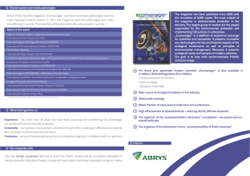 Branch events and media patronages The magazine has been published since 2009 with the circulation of 6,000 copies. The main subject of the magazine is environmental protection in the industry. The largest group of readers are the people responsible for the environmental protection and implementing CRS policies in enterprises. „Ecomanager” is a platform of experience exchange for scientists and companies. It presents innovative eco-technologies, the law and financial aspects of the ecological investments as well as principles of environmental management. Moreover, it presents ecological trends and samples of modern solutions. Our goal is to help build environmentally friendly company image. (KII KILKHHLȊ(IHLHĖLKHLKHHKILHIÝK IKIKHLKÜHLÝLKĀÓLKHHLKIIKHKILHIÝI KHL%ÜHLÝLKĀ1ILKÜIIKLKHHHKÝLKHāď Name of the event 3HKILH1HLLIL LȊ3LÝILLKHIKKILHĖ ÓLKLHKILHÛIÓLK)H(3(c 3HKILHILI (LHL+HKLÛÔN(/ÛÔØ ÓLKLHKILHHÓLK(ÞÜKIL(cÛÔ+(a 0HÛIaKL ÓLKLHKILHÛIÓLK)H(cÛÔÛÔN(/ ILÝLKILIHLÜNHKaHLHLKIHLÚKIĊ3HKILH)II KHLL0K (LÝILLKÛIKKIL)H(I)I(cÛÔ ÓLKLHKILH(LKIL L(b/ÔÛÔN(/ ÓLKLHKILHIL LHLÓLKLHKILH(ÞÜKILÔÓØ3Ú*0 3HKILHILÛ(1/ÔÙÓ3(0ÿHþ)þ*HþÛI ÓLKLHKILHIL LȊÓLLIÝHKÝIKIL IÝKHHKILI HHHĖ (IIH)I IKHÙHL ÓLKLHKILH(LÝILLKHÛIKKILIL(32ÓÔ3 For those who appreciate modern solutions „Ecomanager” is also available in e-edition. What distinguishes the e-edition: Í)HKHKIL IHKILþ ÍØLKIHKþ ÍKIKHĀ ÓLKLHKILH1H)H I(LÝILLKHÛIKKILÛÔØ(-Ô ÓLKLHKILHIL LÛI/L * Editor reserves the right to change the list of events. Main source of ecological solutions in the industry Nationwide coverage Media Partner of many branch trade fairs and conferences What distinguishes us: Experience 5 I I KHL H HÝ ÜL HL HL KHL L K LI ILLKKLÝILLKHIKKILĀ Complexity 5IIKHLÝILKHIKþHKLHL KÝIIKILH KII IHLKLÝILLKHKIĀ Frankness 5HHHKÜHKLHLLÝHHIHLHKILKIHKLĀ High effectiveness of advertisements – reaching strictly defined recipients The organizer of the „Ecoresponsibles in Business” Competition – we award environmental attitudes The organizer of the Discussion Forum „Ecoresponsibility of Polish business” Publisher: We cooperate with: Nforeign companiesLKILKKÛIHKHLHIHLLKKL ÜL ĀNHÝ ILIHLIKIHLHKLHHLLIHĀ ecomanager Magazine Receivers 8% Editors of „Ecomanager” care about the high quality of the magazine. They participate actively in the branch events where they get the newest information and the current issues. They cooperate with many institutions in the country and benefit from many years of experience of the authors. The „Ecomanager” also organizes meetings, facilitating experience exchange. 5% 43% 13% 8% Regular Sections 10% All of the acquired knowledge and information is presented in the following sections: 13% News, Interview, Opinions, Economy, Technologies and innovations, Law, Finance, Management, Green ICT, Database of knowledge, Presentations, Eco-trends Editorial calendar Fuel and energy industry pro-innovation institutions chemical industry training and consulting companies metallurgical industry other automotive industry Issue 1-2/2012 3/2012 4/2012 5/2012 6/2012 7-8/2012 9/2012 10/2012 11-12/2012 Termin składania zleceń 13.01.2011 24.02.2012 26.03.2012 27.04.2012 25.05.2012 02.07.2012 24.08.2012 26.09.2012 26.10.2012 Termin składania gotowych materiałów 16.01.2012 27.02.2012 30.03.2012 30.04.2012 28.05.2012 06.07.2012 27.08.2012 01.10.2012 29.10.2012 Odbiór z drukarni 25.01.2012 08.03.2012 10.04.2012 10.05.2012 08.06.2012 16.07.2012 07.09.2012 10.10.2012 08.11.2012 More information: Joanna Paszyk, Foreign Affairs Manager mobile: +48 784 001 818, fax: +48 61 655 81 01 [email protected], [email protected] Publisher: ABRYS Sp. z o.o., ul. Daleka 33, 60-124 Poznań, Poland www.abrys.pl Distribution The monthly is distributed by the structure of the distribution of the Publisher and through distributors, based on reliable and constantly updated databases. The magazine is also available in the EMPIK stores. Moreover, the magazine is present on branch trade fairs, exhibitions, conferences and seminars.