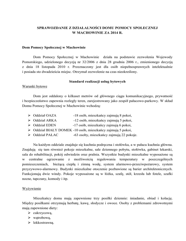 SPRAWOZDANIE Z DZIAŁALNOŚCI DOMU POMOCY SPOLECZNEJ W MACHOWINIE ZA 2014 R. Dom Pomocy Społecznej w Machowinie Dom Pomocy Społecznej w Machowinie działa na podstawie zezwolenia Wojewody Pomorskiego, udzielonego decyzją nr 32/2006 z dnia 28 grudnia 2006 r., zmienionego decyzją z dnia 18 listopada 2010 r. Przeznaczony jest dla osób niepełnosprawnych intelektualnie i posiada sto dwadzieścia miejsc. Otrzymał zezwolenie na czas nieokreślony. Standard realizacji usług bytowych Warunki bytowe Dom jest oddalony o kilkaset metrów od głównego ciągu komunikacyjnego, prywatność i bezpieczeństwo zapewnia rozległy teren, zarejestrowany jako zespół pałacowo-parkowy. W skład Domu Pomocy Społecznej w Machowinie wchodzą: Oddział OAZA -18 osób, mieszkańcy zajmują 8 pokoi, Oddział ARKA -12 osób, mieszkańcy zajmują 5 pokoi, Oddział EDEN -17 osób, mieszkańcy zajmują 6 pokoi, Oddział BIAŁY DOMEK -10 osób, mieszkańcy zajmują 5 pokoi, Oddział PAŁAC -63 osoby, mieszkańcy zajmują 22 pokoje. Na każdym oddziale znajduje się kuchnia podręczna i stołówka, a w pałacu kuchnia główna. Znajdują się tam również pokoje mieszkalne, sale dziennego pobytu, stołówka, gabinet lekarski, sala do rehabilitacji, pokój odwiedzin oraz pralnia. Wszystkie budynki mieszkalne wyposażone są w centralne ogrzewanie z możliwością regulowania temperatury w poszczególnych pomieszczeniach, bieżącą ciepłą i zimną wodę, system alarmowo-przeciwpożarowy, system przyzywowo-alarmowy. Budynki mieszkalne otoczenie pozbawione są barier architektonicznych. Funkcjonują dwie windy. Pokoje wyposażone są w łóżka, szafę, stół, krzesła lub fotele, szafki nocne, tapczany, komody i itp. Wyżywienie Mieszkańcy domu mają zapewnione trzy posiłki dziennie: śniadanie, obiad i kolację. Między posiłkami otrzymują herbatę, kawę, słodycze i owoce. Osoby z problemami zdrowotnymi mają zapewnione diety: cukrzycową, wątrobową, lekkostrawną. Na każdym z oddziałów przez całą dobę dostępne są podstawowe produkty i napoje. W razie potrzeby mieszkańcy są karmieni. Dom współpracując ze Stowarzyszeniem RazemWszystko, w ubiegłym roku pozyskał nieodpłatnie artykuły spożywcze za około 14 tys. zł. Warzywa i owoce z własnego ogrodu w znacznym stopniu uzupełniają potrzeby kuchni. Dzienna stawka żywieniowa wynosiła 6,89 zł na osobę. Utrzymanie czystości Mieszkańcom zapewnia się pomoc w utrzymaniu higieny osobistej oraz czystości. Mniej sprawnym pomagają opiekunowie i pielęgniarki. Pościel wymieniana jest w miarę potrzeb, nie rzadziej niż raz na dwa tygodnie. Pomieszczenia mieszkalne i ogólnodostępne sprzątane są na bieżąco, nie rzadziej niż raz dziennie. Do ich sprzątania aktywizuje się mieszkańców w obecności pracowników. Standard realizacji usług opiekuńczych Udzielanie pomocy w podstawowych czynnościach życiowych Usługi opiekuńcze zapewnia kadra pracowników o odpowiednich kwalifikacjach, która dba o rozwój fizyczny i psychiczny mieszkańców, daje im wsparcie i możliwie najlepszą opiekę. Pracownicy pomagają mieszkańcom w podstawowych czynnościach życiowych, w utrzymaniu czystości i higieny osobistej, zmianie bielizny, wymianie ręczników, sprzątaniu, w doborze codziennej odzieży, w utrzymaniu czystości w pokojach, w ścieleniu łóżka itp. Pielęgnacja Praca opiekunów i pielęgniarek polega na całodobowej opiece, pielęgnacji chorego mieszkańca, stosowaniu profilaktyki przeciwodleżynowej, usprawnianiu mieszkańców poruszających się na wózkach inwalidzkich, oraz przy pomocy innych środków pomocniczych, jak również przez różnego rodzaju ćwiczenia ruchowe. Udzielanie niezbędnej pomocy w załatwianiu spraw osobistych W 2014 roku pracownicy udzielali niezbędnej pomocy mieszkańcom w: kontaktowaniu się z rodzinami, utrzymywaniu korespondencji z rodzinami, znajomymi, w załatwianiu spraw urzędowych, w pobieraniu i dysponowaniu środkami pieniężnymi, zaspokajaniu potrzeb bytowych, zakupie rzeczy osobistego użytku, wyjazdach do domu rodzinnego. 2 Standard realizacji usług wspomagających Organizacja terapii zajęciowej Terapia zajęciowa obejmowała: wykonywanie prac manualnych, gry i zabawy edukacyjne, przygotowanie dekoracji, kukiełek i innych rekwizytów dla teatrzyku, oglądanie seansów filmowych na dvd, przygotowanie dekoracji na imprezy okolicznościowe oraz święta. Wszystkie zajęcia dostosowane są do indywidualnych potrzeb mieszkańców, a przede wszystkim do ich możliwości fizycznych i zdrowotnych. Instruktor ds. kulturalno-oświatowych prowadził zajęcia muzyczno – wokalne (wyjazdy na Przeglądy Twórczości Wokalnej), zajęcia teatralne (prowadzenie teatru „Kubuś”), który między innymi w ubiegłym roku wystawili spektakl pt. „Ostatnia wieczerza” dla mieszkańców tut. Domu jaki dla sąsiednich Domów (w Machowinku oraz w Lubuczewie). Ponadto instruktor ds. k.o organizował szereg imprez dla mieszkańców na terenie tut. do Domu oraz wycieczki o różnej tematyce np. zwiedzanie bunkrów w Ustce i wycieczki do ZOO. Przygotowywał mieszkańców do udziału w festiwalach twórczości artystycznej m.in.: „Przegląd Twórczości Osób Niepełnosprawnych”, który odbył się w Słupskiej Filharmonii. Podnoszenie sprawności i aktywizowanie mieszkańców: Mieszkańcy korzystają z sali rehabilitacyjnej wyposażonej w rowery stacjonarne, rotor, stół do masażu, bieżnię stacjonarną, orbitrek, atlas do ćwiczeń ogólnokondycyjnych, zestaw do ćwiczeń siłowych, drabinki gimnastyczne, poręcze do nauki chodu, materace gimnastyczne, przyrząd do ćwiczenia kończyn górnych i dolnych, przyrząd do ćwiczenia mięśni brzucha w pozycji siedzącej i inne pomoce gimnastyczne. Zajęcia w 2013 roku prowadzone były codziennie i obejmowały: kinezyterapię (ćwiczenia czynne, bierne), masaż, ćwiczenia oddechowe, trening koordynacji ruchowo – oddechowej, gimnastykę poranną,