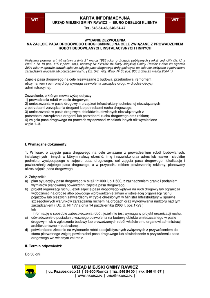 WIT KARTA INFORMACYJNA URZĄD MIEJSKI GMINY RAWICZ - BIURO OBSŁUGI KLIENTA WIT TEL. 546-54-46, 546-54-47 WYDANIE ZEZWOLENIA NA ZAJĘCIE PASA DROGOWEGO DROGI GMINNEJ NA CELE ZWIĄZANE Z PROWADZENIEM ROBÓT BUDOWLANYCH, INSTALACYJNYCH I INNYCH Podstawa prawna: art. 40 ustawy z dnia 21 marca 1985 roku, o drogach publicznych ( tekst jednolity Dz. U. z 2007 r. Nr 19 poz. 115 z póżń. zm.), uchwały Nr XV/156/ 04 Rady Miejskiej Gminy Rawicz z dnia 28 stycznia 2004 roku w sprawie stawek opłat za zajęcie pasa drogowego dróg gminnych na cele nie związane z potrzebami zarządzania drogami lub potrzebami ruchu ( Dz. Urz. Woj. Wlkp. Nr 35 poz. 905 z dnia 25 marca 2004 r.) Zajęcie pasa drogowego na cele niezwiązane z budową, przebudową, remontem, utrzymaniem i ochroną dróg wymaga zezwolenia zarządcy drogi, w drodze decyzji administracyjnej. Zezwolenie, o którym mowa wyżej dotyczy: 1) prowadzenia robót w pasie drogowym; 2) umieszczania w pasie drogowym urządzeń infrastruktury technicznej niezwiązanych z potrzebami zarządzania drogami lub potrzebami ruchu drogowego; 3) umieszczania w pasie drogowym obiektów budowlanych niezwiązanych z potrzebami zarządzania drogami lub potrzebami ruchu drogowego oraz reklam; 4) zajęcia pasa drogowego na prawach wyłączności w celach innych niż wymienione w pkt 1–3. I. Wymagane dokumenty: 1. Wniosek o zajęcie pasa drogowego na cele związane z prowadzeniem robót budowlanych, instalacyjnych i innych w którym należy określić: imię i nazwisko oraz adres lub nazwę i siedzibę podmiotu występującego o zajęcie pasa drogowego, cel zajęcia pasa drogowego, lokalizację i powierzchnię zajętego pasa drogowego, a w przypadku reklam powierzchnię reklamy, planowany okres zajęcia pasa drogowego 2. Załączniki: a) plan sytuacyjny pasa drogowego w skali 1:1000 lub 1:500, z zaznaczeniem granic i podaniem wymiarów planowanej powierzchni zajęcia pasa drogowego, b) projekt organizacji ruchu, jeżeli zajęcie pasa drogowego wpływa na ruch drogowy lub ogranicza widoczność na drodze albo powoduje wprowadzenie zmian w istniejącej organizacji ruchu pojazdów lub pieszych zatwierdzony w trybie określonym w Ministra Infrastruktury w sprawie szczegółowych warunków zarządzania ruchem na drogach oraz wykonywania nadzoru nad tym zarządzaniem ( Dz. U. Nr 177 z dnia 14 października 2003 r. poz.1729 ) lub informację o sposobie zabezpieczenia robót, jeżeli nie jest wymagany projekt organizacji ruchu, c) oświadczenie o posiadaniu ważnego pozwolenia na budowę obiektu umieszczanego w pasie drogowym lub o zgłoszeniu budowy lub prowadzonych robót właściwemu organowi administracji architektoniczno – budowlanej, d) potwierdzone zlecenie na wykonanie robót specjalistycznych związanych z przywróceniem do stanu pierwotnego zajętej powierzchni pasa drogowego lub oświadczenie o przywróceniu pasa drogowego we własnym zakresie. II. Termin odpowiedzi: Do 30 dni URZĄD MIEJSKI GMINY RAWICZ | UL. PIŁSUDSKIEGO 21 | 63-900 RAWICZ | TEL. 546 54 00 | FAX. 546 41 67 | | WWW.RAWICZ.PL | [email protected] | WIT KARTA INFORMACYJNA URZĄD MIEJSKI GMINY RAWICZ - BIURO OBSŁUGI KLIENTA WIT TEL. 546-54-46, 546-54-47 III. Opłaty: Wysokość opłaty za zajęcie pasa drogowego ustala się na podstawie UchwałyNr XV/156/ 04 Rady Miejskiej Gminy Rawicz z dnia 28 stycznia 2004 roku w sprawie stawek opłat za zajęcie pasa drogowego dróg gminnych na cele nie związane z potrzebami zarządzania drogami lub potrzebami ruchu ( Dz. Urz. Woj. Wlkp. Nr 35 poz. 905 z dnia 25 marca 2004 r.) IV. Jednostka odpowiedzialna : Wydział Inwestycyjno – Techniczny: Aleksandra Szymanowska, pok. 112, tel. 546-54-27 V. Tryb odwoławczy: Odwołanie wnosi się do Samorządowego Kolegium Odwoławczego w Lesznie za pośrednictwem organu który wydał decyzję /odwołanie składa się w sekretariacie Urzędu Miejskiego/. Odwołanie wnosi się w terminie 14 dni od dnia doręczenia decyzji stronie. VI. Uwagi: W przypadku braku kompletu wymaganych dokumentów wnioskodawca zostanie wezwany do ich uzupełnienia. Wnioski, do których nie będą przedłożone dokumenty, o których mowa w pkt.I Załączniki niniejszego wniosku, zgodnie z art. 64 § 2 K.p.a. będą zwracane Wnioskodawcy bez rozpatrzenia. VII. Inne informacje: W przypadku zajęcia pasa drogowego bez zezwolenia Zarządca Drogi orzeka o przywróceniu pasa drogowego do stanu poprzedniego i pobiera opłaty karne w wysokości dziesięciokrotnej należnej opłaty. URZĄD MIEJSKI GMINY RAWICZ | UL. PIŁSUDSKIEGO 21 | 63-900 RAWICZ | TEL. 546 54 00 | FAX. 546 41 67 | | WWW.RAWICZ.PL | [email protected] |