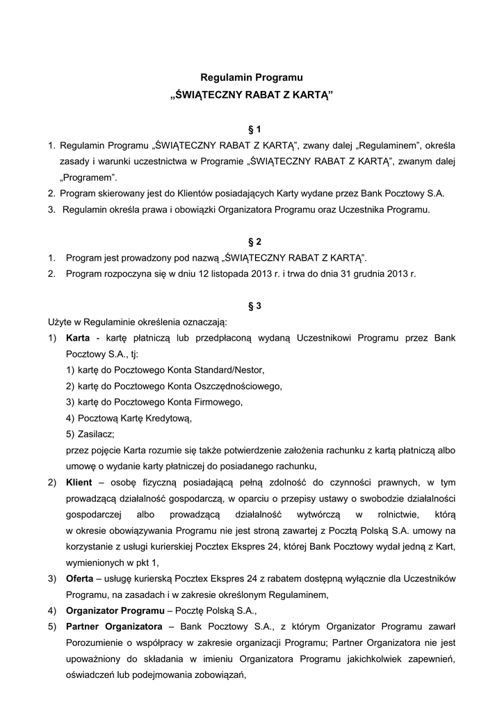 Regulamin Programu „ŚWIĄTECZNY RABAT Z KARTĄ” §1 1. Regulamin Programu „ŚWIĄTECZNY RABAT Z KARTĄ”, zwany dalej „Regulaminem”, określa zasady i warunki uczestnictwa w Programie „ŚWIĄTECZNY RABAT Z KARTĄ”, zwanym dalej „Programem”. 2. Program skierowany jest do Klientów posiadających Karty wydane przez Bank Pocztowy S.A. 3. Regulamin określa prawa i obowiązki Organizatora Programu oraz Uczestnika Programu. §2 1. Program jest prowadzony pod nazwą „ŚWIĄTECZNY RABAT Z KARTĄ”. 2. Program rozpoczyna się w dniu 12 listopada 2013 r. i trwa do dnia 31 grudnia 2013 r. §3 Użyte w Regulaminie określenia oznaczają: 1) Karta - kartę płatniczą lub przedpłaconą wydaną Uczestnikowi Programu przez Bank Pocztowy S.A., tj: 1) kartę do Pocztowego Konta Standard/Nestor, 2) kartę do Pocztowego Konta Oszczędnościowego, 3) kartę do Pocztowego Konta Firmowego, 4) Pocztową Kartę Kredytową, 5) Zasilacz; przez pojęcie Karta rozumie się także potwierdzenie założenia rachunku z kartą płatniczą albo umowę o wydanie karty płatniczej do posiadanego rachunku, 2) Klient – osobę fizyczną posiadającą pełną zdolność do czynności prawnych, w tym prowadzącą działalność gospodarczą, w oparciu o przepisy ustawy o swobodzie działalności gospodarczej albo prowadzącą działalność wytwórczą w rolnictwie, którą w okresie obowiązywania Programu nie jest stroną zawartej z Pocztą Polską S.A. umowy na korzystanie z usługi kurierskiej Pocztex Ekspres 24, której Bank Pocztowy wydał jedną z Kart, wymienionych w pkt 1, 3) Oferta – usługę kurierską Pocztex Ekspres 24 z rabatem dostępną wyłącznie dla Uczestników Programu, na zasadach i w zakresie określonym Regulaminem, 4) Organizator Programu – Pocztę Polską S.A., 5) Partner Organizatora – Bank Pocztowy S.A., z którym Organizator Programu zawarł Porozumienie o współpracy w zakresie organizacji Programu; Partner Organizatora nie jest upoważniony do składania w imieniu Organizatora Programu jakichkolwiek zapewnień, oświadczeń lub podejmowania zobowiązań, 6) Rabat – obniżka ceny (brutto) za usługę o 30 %, 7) Uczestnik Programu – Klienta posiadającego Kartę, o której mowa w pkt 1, będącego nadawcą przesyłki Pocztex Ekspres 24, 8) usługa kurierska Pocztex Ekspres 24 – usługę pocztową niepowszechną świadczoną przez Organizatora Programu w oparciu o Regulamin świadczenia usługi pocztowej Pocztex w obrocie krajowym, który jest dostępny na stronie www.poczta-polska.pl, 9) Wyznaczona placówka – urząd pocztowy albo filia urzędu pocztowego realizująca usługę Pocztex (przyjęcie). §4 Oferta obejmuje uprawnienie do skorzystania z rabatu dla usługi kurierskiej Pocztex Ekspres 24 wskazanego w Załączniku Nr 1A do Regulaminu w ramach Programu. §5 1. Uczestnik Programu może skorzystać z rabatu na usługę kurierską Pocztex Ekspres 24, objętą Ofertą, wyłącznie w okresie trwania Programu, w Wyznaczonych placówkach wskazanych przez Organizatora Programu. Lista wyznaczonych placówek znajduje się na stronie internetowej: www.poczta-polska.pl. Organizator Programu zastrzega sobie prawo do wprowadzenia zmian do listy Wyznaczonych placówek biorących udział w Programie. 2. Warunkiem skorzystania z Oferty jest okazanie Karty przy nadaniu przesyłki Pocztex Ekspres 24 w Wyznaczonej placówce przez Uczestnika Programu. 3. Rabaty nie są udzielane dla usług nadawanych za pośrednictwem Kuriera. 4. W okresie trwania Programu, Organizator Programu zastrzega sobie prawo zmiany wysokości przyznanego rabatu, o którym mowa w Załączniku Nr 1A do Regulaminu, z zastrzeżeniem § 8 ust. 2 i 3. Organizator Programu zastrzega, że wysokość rabatu określona w Załączniku Nr 1 do Regulaminu nie ulega zmianie w sytuacji gdy Uczestnik Programu dysponuje równocześnie dwoma i więcej Kartami, o których mowa w § 3 pkt 1. 5. Karta uszkodzona w sposób, który uniemożliwia identyfikację Uczestnika Programu lub nasuwa podejrzenia co do autentyczności Karty, jest uznana za nieważną. 6. Organizator Programu nie ponosi odpowiedzialności za skutki posługiwania się przez Uczestnika Programu uszkodzoną Kartą. §6 1. Reklamacje co do niezgodności funkcjonowania Programu z niniejszym Regulaminem można przesyłać lub składać na adres: Poczta Polska S.A. Dział Contact Center ul. Kolejowa 10 98-300 Wieluń lub telefonicznie: Dział Contact Center Poczta Polska S.A. Tel. 801-333-444, e-mail: [email protected] w terminie do dnia 15 stycznia 2014 r. (decyduje data stempla pocztowego). 2. Termin rozpatrywania reklamacji wynosi 30 dni od dnia jej prawidłowego złożenia u Organizatora Programu. §7 1. Uczestnictwo w Programie jest jednoznaczne z wyrażeniem zgody przez Uczestnika Programu na przetwarzanie jego danych osobowych w celu realizacji Programu, zgodnie z ustawą z dnia 29 sierpnia 1997 roku o ochronie danych osobowych. 2. Administratorem danych osobowych Uczestników Programu jest Poczta Polska S.A. z siedzibą w Warszawie 00-940, ul. Stawki 2. 3. Dane osobowe Uczestników Programu będą przetwarzane jedynie w celu prawidłowej realizacji Programu. 4. Uczestnik Programu ma prawo dostępu do treści swoich danych oraz ich poprawiania. 5. Podanie danych przez Uczestnika Programu jest dobrowolne, jednak ich niepodanie uniemożliwia udział w Programie. §8 1. Poczta Polska S.A. zastrzega sobie prawo wprowadzenia zmian w niniejszym Regulaminie w każdym czasie bez podania przyczyny. 2. Wprowadzane zmiany nie dotyczą Uczestników Programu, którzy skorzystali z Oferty przed terminem wprowadzenia zmian. 3. W przypadku wprowadzenia zmian do niniejszego Regulaminu, Organizator Programu każdorazowo zawiadomi Uczestników Programu o wprowadzonych zmianach poprzez udostępnienie ujednoliconego tekstu zmienionego Regulaminu na stronie www.pocztapolska.pl. 4. Regulamin dostępny jest do wglądu w Wyznaczonych placówkach, a także na stronie inter