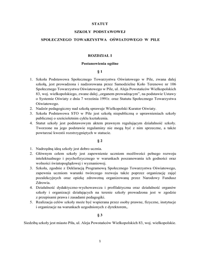 STATUT SZKOŁY PODSTAWOWEJ SPOŁECZNEGO TOWARZYSTWA OŚWIATOWEGO W PILE ROZDZIAŁ I Postanowienia ogólne §1 1. Szkoła Podstawowa Społecznego Towarzystwa Oświatowego w Pile, zwana dalej szkołą, jest prowadzona i nadzorowana przez Samodzielne Koło Terenowe nr 106 Społecznego Towarzystwa Oświatowego w Pile, ul. Aleja Powstańców Wielkopolskich 83, woj. wielkopolskiego, zwane dalej „organem prowadzącym”, na podstawie Ustawy o Systemie Oświaty z dnia 7 września 1991r. oraz Statutu Społecznego Towarzystwa Oświatowego. 2. Nadzór pedagogiczny nad szkołą sprawuje Wielkopolski Kurator Oświaty. 3. Szkoła Podstawowa STO w Pile jest szkołą niepubliczną o uprawnieniach szkoły publicznej o sześcioletnim cyklu kształcenia. 4. Statut szkoły jest podstawowym aktem prawnym regulującym działalność szkoły. Tworzone na jego podstawie regulaminy nie mogą być z nim sprzeczne, a także powtarzać kwestii rozstrzygniętych w statucie. §2 1. Nadrzędną ideą szkoły jest dobro ucznia. 2. Głównym celem szkoły jest zapewnienie uczniom możliwości pełnego rozwoju intelektualnego i psychofizycznego w warunkach poszanowania ich godności oraz wolności światopoglądowej i wyznaniowej. 3. Szkoła, zgodnie z Deklaracją Programową Społecznego Towarzystwa Oświatowego, zapewnia uczniom warunki twórczego rozwoju także poprzez organizację zajęć pozalekcyjnych oraz opiekę zdrowotną organizowaną przez Narodowy Fundusz Zdrowia. 4. Działalność dydaktyczno-wychowawcza i profilaktyczna oraz działalność organów szkoły i organizacji działających na terenie szkoły prowadzona jest w zgodzie z przepisami prawa i zasadami pedagogiki. 5. Realizacja celów szkoły może być wspierana przez osoby prawne, fizyczne, instytucje i organizacje na warunkach uzgodnionych z dyrektorem,. §3 Siedzibą szkoły jest miasto Piła, ul. Aleja Powstańców Wielkopolskich 83, woj. wielkopolskie. 1 §4 1. Uczniowie, ich rodzice lub prawni opiekunowie, zwani dalej „rodzicami”, nauczyciele i wychowawcy (pracownicy pedagogiczni), zwani dalej „nauczycielami” oraz inni pracownicy szkoły tworzą społeczność szkolną. 2. Członkowie społeczności szkolnej uczestniczą w życiu szkoły bezpośrednio oraz poprzez udział swoich przedstawicieli w Radzie Pedagogicznej, Samorządzie Uczniowskim i władzach organu prowadzącego. §5 Nauczyciele mają prawo nauczać zgodnie z wybranymi przez siebie i uzgodnionymi z dyrektorem metodami nauczania, przestrzegając zasad etyki zawodowej, statutu szkoły i przepisów prawa. §6 1. Szkoła jest pracodawcą w rozumieniu art. 3 Kodeksu Pracy. 2. Kierownikiem zakładu pracy w rozumieniu Kodeksu Pracy jest dyrektor szkoły, który nawiązuje i rozwiązuje stosunki pracy z nauczycielami i innymi pracownikami. Dyrektor szkoły zawiera także inne umowy niezbędne do właściwego funkcjonowania szkoły. 3. Nauczyciele i inni pracownicy szkoły są zatrudniani zgodnie z Kodeksem Pracy oraz przepisami w sprawach kwalifikacji i uprawnień nauczycieli zgodnie z UoSO i KN w zakresie dotyczącym nauczycieli szkół niepublicznych. §7 1. Działalność szkoły nie ma charakteru zarobkowego. Szkoła finansowana jest z czesnego i innych opłat rodziców, dotacji budżetowych, a także z dotacji organu prowadzącego i innych władz Towarzystwa oraz ze środków przekazywanych szkole w drodze darowizn i innych form finansowego wspierania szkoły przez osoby prywatne i instytucje. 2. Rodzice ucznia zobowiązani są do uiszczania opłat, o których mowa w ust. 1, w wysokości i terminie ustalonym przez organ prowadzący, zgodnie z § 12 pkt. 2 lit. b. 3. W przypadku niewywiązywania się rodziców ucznia ze zobowiązania, o którym mowa w ust. 2, dłużej niż jeden miesiąc, dyrektor może skreślić ucznia z listy uczniów szkoły. 2 ROZDZIAŁ II Organy szkoły oraz zakres ich zadań §8 Organami szkoły są: 1. Dyrektor, 2. Rada Pedagogiczna, 3. Samorząd Uczniowski. §9 1. Decyzje i opinie kolegialnych organów szkoły zapadają w formie uchwał zwykłą większością głosów przy obecności co najmniej polowy członków. Na wniosek jednego z członków organu zarządza się głosowanie tajne. 2. Posiedzenia kolegialnych organów szkoły są protokołowane. 3. Uchwały organów szkoły winny być udostępniane członkom społeczności szkolnej. Organy szkoły mają obowiązek udzielania sobie wzajemnych informacji w nieprzekraczalnym terminie 10 dni. 4. Uchwały organów szkoły sprzeczne ze statutem szkoły lub innymi przepisami prawa mogą być zawieszone lub uchylone przez organ prowadzący. O zawieszeniu lub uchyleniu uchwały organ prowadzący niezwłocznie powiadamia organ szkoły, który uchwałę podjął. 5. Opinie organów szkoły w sprawach określonych statutem, o ile dalsze postanowienia statutu nie stanowią inaczej, formułowane są w terminie do 14 dni. 6. Nieuwzględnienie opinii organu szkoły przez organ prowadzący, dyrektora lub Radę Pedagogiczną wymaga wyjaśnienia na piśmie. Termin, o którym mowa w ust.5, stosuje się odpowiednio. § 10 1. Organy szkoły, z własnej inicjatywy lub na wniosek organu prowadzącego albo Zarządu Głównego Społecznego Towarzystwa Oświatowego, mają prawo wyrażania opinii i składania wniosków w każdej sprawie dotyczącej szkoły i przedstawienia ich właściwym adresatom. 2. Organy szkoły (z wyjątkiem dyrektora) nie mogą reprezentować szkoły na zewnątrz. Dyrektor § 11 1. Dyrektora powołuje i odwołuje Zarząd SKT nr 106 STO w Pile. 2. W zakresie dyscypliny pracy jednostką nadrzędną dla dyrektora jest organ prowadzący. 3 1. 2. 3. 4. 5. 6. 7. 8. § 12 Dyrektor kieruje bieżącą działalnością szkoły i reprezentuje ją na zewnątrz, a w szczególności: a) sprawuje nadzór pedagogiczny wewnątrz szkoły, b) przewodniczy Radzie Pedagogicznej, przygotowuje i prowadzi posiedzenia Rady oraz jest odpowiedzialny za powiadomienie wszystkich jej członków o terminie i porządku posiedzenia