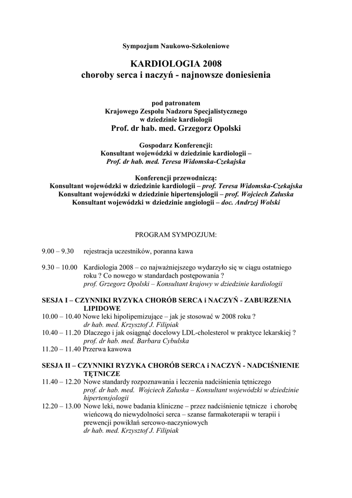 Sympozjum Naukowo-Szkoleniowe KARDIOLOGIA 2008 choroby serca i naczyń - najnowsze doniesienia pod patronatem Krajowego Zespołu Nadzoru Specjalistycznego w dziedzinie kardiologii Prof. dr hab. med. Grzegorz Opolski Gospodarz Konferencji: Konsultant wojewódzki w dziedzinie kardiologii – Prof. dr hab. med. Teresa Widomska-Czekajska Konferencji przewodniczą: Konsultant wojewódzki w dziedzinie kardiologii – prof. Teresa Widomska-Czekajska Konsultant wojewódzki w dziedzinie hipertensjologii – prof. Wojciech Załuska Konsultant wojewódzki w dziedzinie angiologii – doc. Andrzej Wolski PROGRAM SYMPOZJUM: 9.00 – 9.30 rejestracja uczestników, poranna kawa 9.30 – 10.00 Kardiologia 2008 – co najważniejszego wydarzyło się w ciągu ostatniego roku ? Co nowego w standardach postępowania ? prof. Grzegorz Opolski – Konsultant krajowy w dziedzinie kardiologii SESJA I – CZYNNIKI RYZYKA CHORÓB SERCA i NACZYŃ - ZABURZENIA LIPIDOWE 10.00 – 10.40 Nowe leki hipolipemizujące – jak je stosować w 2008 roku ? dr hab. med. Krzysztof J. Filipiak 10.40 – 11.20 Dlaczego i jak osiągnąć docelowy LDL-cholesterol w praktyce lekarskiej ? prof. dr hab. med. Barbara Cybulska 11.20 – 11.40 Przerwa kawowa SESJA II – CZYNNIKI RYZYKA CHORÓB SERCA i NACZYŃ - NADCIŚNIENIE TĘTNICZE 11.40 – 12.20 Nowe standardy rozpoznawania i leczenia nadciśnienia tętniczego prof. dr hab. med. Wojciech Załuska – Konsultant wojewódzki w dziedzinie hipertensjologii 12.20 – 13.00 Nowe leki, nowe badania kliniczne – przez nadciśnienie tętnicze i chorobę wieńcową do niewydolności serca – szanse farmakoterapii w terapii i prewencji powikłań sercowo-naczyniowych dr hab. med. Krzysztof J. Filipiak SESJA III – CZYNNIKI RYZYKA CHORÓB SERCA i NACZYŃ – NADREAKTYWNOŚĆ PŁYTEK 13.00 – 13.20 Jak stosować leki przeciwpłytkowe u stabilnych pacjentów z chorobą niedokrwienną serca lub ekwiwalentem wieńcowym ? prof. dr hab. med. Andrzej Wysokiński 13.20 – 13.40 Jak stosować leki przeciwpłytkowe u osób po ostrych zespołach wieńcowych ? dr med. Anna Jankowska 13.40 – 14.00 Oporność na leki przeciwpłytkowe – co o niej wiemy w 2008 roku ? dr hab. n. med. Andrzej Kleinrok 14.00 – 15.00 PRZERWA – LUNCH Uwaga: w przerwie – w osobnej sali – spotkanie Konsultantów wojewódzkich, konsultanta krajowego i ordynatorów oddziałów kardiologicznych i internistycznokardiologicznych województwa lubelskiego. Opieka kardiologiczna w województwie lubelskim w 2007 r. prof. Teresa Widomska-Czekajska – Konsultant wojewódzki w dziedzinie kardiologii (10 minut) SESJA IV – CZYNNIKI RYZYKA CHORÓB SERCA i NACZYŃ – ZAKRZEPICA 15.00 – 15.30 Zasady prewencji powikłań zakrzepowo-zatorowych – komu ? kiedy ? co ? dr hab. med. Andrzej Wolski – Konsultant wojewódzki w dziedzinie angiologii 15.30 – 16.00 Nowe leki przeciwkrzepliwe – czym dysponujemy w 2008 roku ? dr hab. Wojciech Myśliński 16.00 Zakończenie konferencji, rozdanie certyfikatów