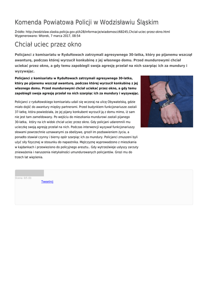Komenda Powiatowa Policji w Wodzisławiu Śląskim Źródło: http://wodzislaw.slaska.policja.gov.pl/k28/informacje/wiadomosci/68245,Chcial-uciec-przez-okno.html Wygenerowano: Wtorek, 7 marca 2017, 08:54 Chciał uciec przez okno Policjanci z komisariatu w Rydułtowach zatrzymali agresywnego 30-latka, który po pijanemu wszczął awanturę, podczas której wyrzucił konkubinę z jej własnego domu. Przed mundurowymi chciał uciekać przez okno, a gdy temu zapobiegli swoja agresję przelał na nich szarpiąc ich za mundury i wyzywając. Policjanci z komisariatu w Rydułtowach zatrzymali agresywnego 30-latka, który po pijanemu wszczął awanturę, podczas której wyrzucił konkubinę z jej własnego domu. Przed mundurowymi chciał uciekać przez okno, a gdy temu zapobiegli swoja agresję przelał na nich szarpiąc ich za mundury i wyzywając. Policjanci z rydułtowskiego komisariatu udali się wczoraj na ulicę Obywatelską, gdzie miało dojść do awantury między partnerami. Przed budynkiem funkcjonariusze zastali 37-latkę, która powiedziała, że jej pijany konkubent wyrzucił ją z domu mimo, iż sam nie jest tam zameldowany. Po wejściu do mieszkania mundurowi zastali pijanego 30-latka, który na ich widok chciał uciec przez okno. Gdy policjani udaremnili mu ucieczkę swoją agresję przelał na nich. Podczas interwencji wyzywał funkcjonariuszy słowami powrzechnie uznawanymi za obelżywe, groził im pozbawieniem życia, a ponadto stawiał czynny i bierny opór szarpiąc ich za mundury. Policjanci zmuszeni byli użyć siły fizycznej w stosunku do napastnika. Mężczyznę wyprowadzono z mieszkania w kajdankach i przewieziono do policyjnego aresztu.. Gdy wytrzeźwieje usłyszy zarzuty znieważenia i naruszenia nietykalności umundurowanych policjantów. Grozi mu do trzech lat więzienia. Ocena: 0/5 (0) Tweetnij