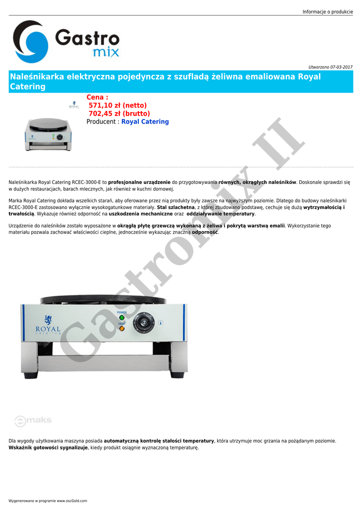 Informacje o produkcie Utworzono 07-03-2017 Naleśnikarka elektryczna pojedyncza z szufladą żeliwna emaliowana Royal Catering Cena : 571,10 zł (netto) 702,45 zł (brutto) II Producent : Royal Catering ix Naleśnikarka Royal Catering RCEC-3000-E to profesjonalne urządzenie do przygotowywania równych, okrągłych naleśników. Doskonale sprawdzi się w dużych restauracjach, barach mlecznych, jak również w kuchni domowej. m Marka Royal Catering dokłada wszelkich starań, aby oferowane przez nią produkty były zawsze na najwyższym poziomie. Dlatego do budowy naleśnikarki RCEC-3000-E zastosowano wyłącznie wysokogatunkowe materiały. Stal szlachetna, z której zbudowano podstawę, cechuje się dużą wytrzymałością i trwałością. Wykazuje również odporność na uszkodzenia mechaniczne oraz oddziaływanie temperatury. G as tr o Urządzenie do naleśników zostało wyposażone w okrągłą płytę grzewczą wykonaną z żeliwa i pokrytą warstwą emalii. Wykorzystanie tego materiału pozwala zachować właściwości cieplne, jednocześnie wykazując znaczną odporność. Dla wygody użytkowania maszyna posiada automatyczną kontrolę stałości temperatury, która utrzymuje moc grzania na pożądanym poziomie. Wskaźnik gotowości sygnalizuje, kiedy produkt osiągnie wyznaczoną temperaturę. Wygenerowano w programie www.oscGold.com II ix m Pod powierzchnią grzewczą umieszczono wysuwaną półkę do przechowywania gotowych naleśników lub innych artykułów. Może być także wykorzystana jako miejsce do przechowywania szpatułki lub kabli podłączeniowych. W ten sposób niezbędne akcesoria są zawsze pod ręką. tr o Drewniana szpatułka do ciasta znajduje się w zestawie. Przyrząd umożliwia równomierne rozłożenie masy na płycie, co przyczynia się do uzyskania jednakowo grubych i okrągłych naleśników. Zaletą prezentowanego produktu jest jego proste czyszczenie. Stal nierdzewna, z której został wykonany, charakteryzuje się pozbawioną porowatości powierzchnią. Dodatkowo gładka powłoka płyty zapobiega przyklejaniu się ciasta, a gotowe placki podnosi się szybko i łatwo. Kompaktowy charakter sprzętu pozwala zaoszczędzić miejsce. Jesteśmy pewni wysokiej jakości oferowanych produktów, dlatego też na naleśnikarkę Royal Catering RCEC-3000-E udzielamy długookresowej gwarancji. Specyfikacja Producent Model Moc 1252 Nowy Stal szlachetna, żeliwo pokryte emalią G Stan artykułu Napięcie Royal Catering RCEC-3000-E Nr katalogowy Materiał 1252 as Numer katalogowy 230 V 3000 W Średnica płyty grzewczej 40 cm Wysokość płyty grzewczej 2 cm Zakres regulacji temperatury od 50 do 300 °C Podłączenie prądu 1 Wymiary (DxSxW) 48 x 45 x 23,5 cm Waga 14 kg Wymiary wysyłki (DxSxW) 50,5 x 54,5 x 29 cm Waga wysyłki 16,5 kg