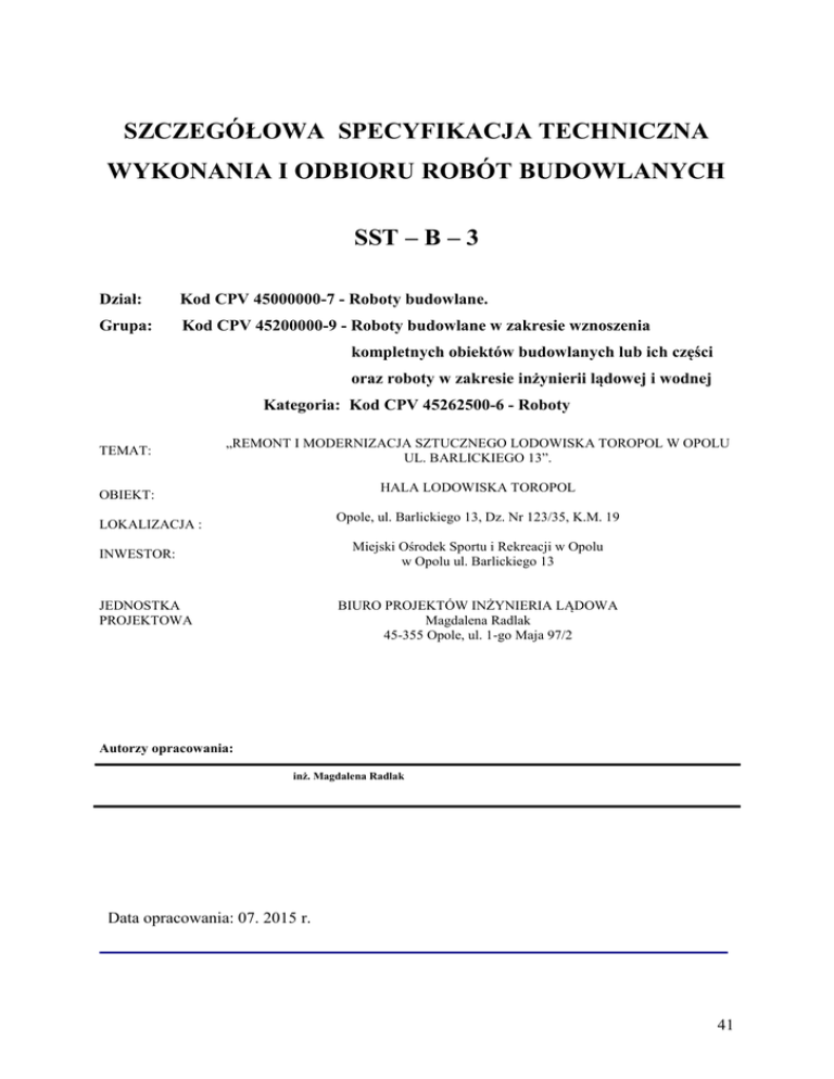 SZCZEGÓŁOWA SPECYFIKACJA TECHNICZNA WYKONANIA I ODBIORU ROBÓT BUDOWLANYCH SST – B – 3 Dział: Kod CPV 45000000-7 - Roboty budowlane. Grupa: Kod CPV 45200000-9 - Roboty budowlane w zakresie wznoszenia kompletnych obiektów budowlanych lub ich części oraz roboty w zakresie inżynierii lądowej i wodnej Kategoria: Kod CPV 45262500-6 - Roboty TEMAT: „REMONT I MODERNIZACJA SZTUCZNEGO LODOWISKA TOROPOL W OPOLU UL. BARLICKIEGO 13”. HALA LODOWISKA TOROPOL OBIEKT: Opole, ul. Barlickiego 13, Dz. Nr 123/35, K.M. 19 LOKALIZACJA : Miejski Ośrodek Sportu i Rekreacji w Opolu w Opolu ul. Barlickiego 13 INWESTOR: JEDNOSTKA PROJEKTOWA BIURO PROJEKTÓW INŻYNIERIA LĄDOWA Magdalena Radlak 45-355 Opole, ul. 1-go Maja 97/2 Autorzy opracowania: inż. Magdalena Radlak oData opracowania: 07. 2015 r. 41 1. WSTĘP 1.1. Przedmiot ST Przedmiotem niniejszej szczegółowej specyfikacji technicznej (SST) są wymagania dotyczące wykonania i odbioru murów z cegieł realizowanych dla zadnia pn. „REMONT I MODERNIZACJA SZTUCZNEGO LODOWISKA TOROPOL W OPOLU UL. BARLICKIEGO 13”. 1.2. Zakres stosowania SST Specyfikacja techniczna (SST) jest stosowana jako dokument przetargowy i kontraktowy przy zleceniu i realizacji robót wymienionych w pkt 1.1. Odstępstwa od wymagań podanych w niniejszej specyfikacji mogą mieć miejsce tylko w przypadkach małych prostych robót i konstrukcji drugorzędnych o niewielkim znaczeniu, dla których istnieje pewność, że podstawowe wymagania będą spełnione przy zastosowaniu metod wykonania na podstawie doświadczenia i przy przestrzeganiu zasad sztuki budowlanej. 1.3. Zakres robót objętych SST Ustalenia zawarte w niniejszej specyfikacji dotyczą zasad prowadzenia robót związanych z: Wykonaniem ścian murowanych i zamurowań ścian z cegły pełnej; Wykuciem gniazd w ścianach z cegieł na zaprawie cementowo-wapiennej dla belek stalowych; Wykonaniem nadproży z kształtowników stalowych oraz nadproży prefabrykowanych. 1.4. Ogólne wymagania dotyczące robót Wykonawca robót jest odpowiedzialny za jakość ich wykonania oraz za ich zgodność z dokumentacją projektową, SST i poleceniami Inspektora nadzoru. Ogólne wymagania dotyczące robót podano w SST – B – O „Wymagania ogólne" pkt 1.2. 1.5. Określenia podstawowe Element murowy - jest to drobno lub średniowymiarowy wyrób budowlany przeznaczony do ręcznego wznoszenia konstrukcji murowych. Zaprawa murarska - jest to zaprawa budowlana przeznaczona do stosowania w konstrukcjach budowlanych do spajania elementów murowych. Wyroby pomocnicze - są to różnego rodzaju wyroby metalowe lub z tworzyw sztucznych stosowane w konstrukcjach murowych jako elementy uzupełniające tj.: kotwy, łączniki, wsporniki ,nadproża, wzmocnienia ścian. Warstwa konstrukcyjna - część ściany oparta na fundamencie , przenosząca obciążenia własne muru, obciążenia stropów i od zabudowy otworów i mocowanych elementów instalacyjnych oraz wyposażenia. Warstwa izolacyjna - nałożona na warstwę konstrukcyjną i trwale z nią połączona powłoka lub warstwa materiału , którego zadaniem jest przede wszystkim nadanie zdolności izolacyjnych murowi. Kotwienie - mocowanie warstwy izolacyjnej lub elementów instalacji i wyroby pomocnicze w warstwie nośnej. Pozostałe określenia podane w niniejszej ST są zgodne z obowiązującymi odpowiednimi normami oraz określeniami podanymi w SST – B – O „Wymagania ogólne”. 42 1.6. Prace towarzyszące i roboty tymczasowe Prace towarzyszące i roboty tymczasowe wyszczególnione są w ogólnej specyfikacji technicznej wykonania i odbioru robót budowlanych. 2. MATERIAŁY Ogólne wymagania dotyczące materiałów, ich pozyskania i składowania podano w SST – B – O „Wymagania ogólne”. Dopuszcza się zamienne rozwiązania (w oparciu na produktach innych producentów) pod warunkiem: spełnienia tych samych właściwości technicznych, przedstawienia zamiennych rozwiązań na piśmie (dane techniczne, atesty, dopuszczenia do stosowania), uzyskania akceptacji Inspektora nadzoru. Uwaga: Wszelkie nazwy własne produktów i materiałów przywołane w specyfikacji służą określeniu pożądanego standardu wykonania i określeniu właściwości i wymogów technicznych założonych w dokumentacji technicznej dla danych rozwiązań. Wymagania szczegółowe dla materiałów Wszelkie materiały do wykonania robót murowych powinny odpowiadać wymaganiom zawartym w normach polskich lub aprobatach technicznych ITB dopuszczających dany materiał do powszechnego stosowania w budownictwie. Ponadto materiały stosowane do wykonywania robót murowych powinny mieć: Aprobaty Techniczne lub być produkowane zgodnie z obowiązującymi normami, Certyfikat lub Deklaracje Zgodności z Aprobatą Techniczną lub z PN, Certyfikat na znak bezpieczeństwa, Certyfikat zgodności ze zharmonizowaną normą europejską wprowadzoną do zbioru norm polskich, Na opakowaniach powinien znajdować się termin przydatności do stosowania. Szalowanie a) Drewno do wyrobu szalunków: deski i sklejki używane przy deskowaniu oraz pozostałe materiały do budowy szalunków, deskowania indywidualne wykonane z tarcz zbijanych desek gr. 25 mm. Tarcze powinny być usztywnione nakładkami z desek gr. 38 mm lub bali 50 mm. b) Metalowe formy kształtowe - w miejscach gdzie jest to potrzebne – zastosować Łączenie deskowań: złącza usuwalne lub na zatrzaskach metalowych o stałej lub zmiennej długości, nie posiadające elementów pozostawiających w powierzchni betonu otworów o średnicy większej niż 25 mm. Środek antyprzyczepny - aktywne chemicznie środki zawierające składniki wchodzące w reakcję z wolnym wapnem znajdującym się w betonie, powodujące wytwarzanie się 43 nierozpuszczalnych w wodzie substancji, zapobiegających przywieraniu betonu do deskowania. Środek używany przy demontażu deskowań - bezbarwny olej mineralny, nie zawierający kerosenu, o lepkości od 100 do 110 s (w uniwersaln