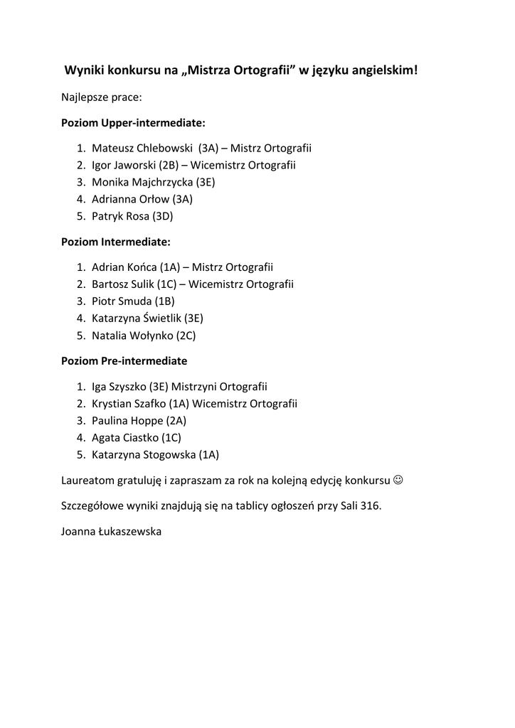 Wyniki konkursu na „Mistrza Ortografii” w języku angielskim! Najlepsze prace: Poziom Upper-intermediate: 1. 2. 3. 4. 5. Mateusz Chlebowski (3A) – Mistrz Ortografii Igor Jaworski (2B) – Wicemistrz Ortografii Monika Majchrzycka (3E) Adrianna Orłow (3A) Patryk Rosa (3D) Poziom Intermediate: 1. 2. 3. 4. 5. Adrian Końca (1A) – Mistrz Ortografii Bartosz Sulik (1C) – Wicemistrz Ortografii Piotr Smuda (1B) Katarzyna Świetlik (3E) Natalia Wołynko (2C) Poziom Pre-intermediate 1. 2. 3. 4. 5. Iga Szyszko (3E) Mistrzyni Ortografii Krystian Szafko (1A) Wicemistrz Ortografii Paulina Hoppe (2A) Agata Ciastko (1C) Katarzyna Stogowska (1A) Laureatom gratuluję i zapraszam za rok na kolejną edycję konkursu ☺ Szczegółowe wyniki znajdują się na tablicy ogłoszeń przy Sali 316. Joanna Łukaszewska
