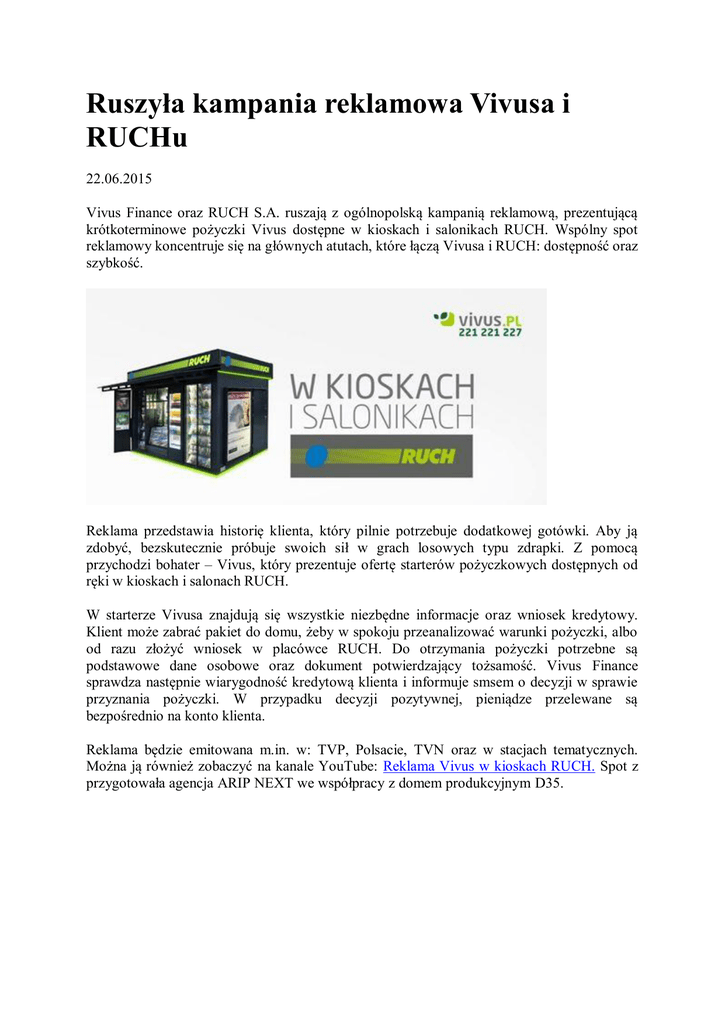 Ruszyła kampania reklamowa Vivusa i RUCHu 22.06.2015 Vivus Finance oraz RUCH S.A. ruszają z ogólnopolską kampanią reklamową, prezentującą krótkoterminowe pożyczki Vivus dostępne w kioskach i salonikach RUCH. Wspólny spot reklamowy koncentruje się na głównych atutach, które łączą Vivusa i RUCH: dostępność oraz szybkość. Reklama przedstawia historię klienta, który pilnie potrzebuje dodatkowej gotówki. Aby ją zdobyć, bezskutecznie próbuje swoich sił w grach losowych typu zdrapki. Z pomocą przychodzi bohater – Vivus, który prezentuje ofertę starterów pożyczkowych dostępnych od ręki w kioskach i salonach RUCH. W starterze Vivusa znajdują się wszystkie niezbędne informacje oraz wniosek kredytowy. Klient może zabrać pakiet do domu, żeby w spokoju przeanalizować warunki pożyczki, albo od razu złożyć wniosek w placówce RUCH. Do otrzymania pożyczki potrzebne są podstawowe dane osobowe oraz dokument potwierdzający tożsamość. Vivus Finance sprawdza następnie wiarygodność kredytową klienta i informuje smsem o decyzji w sprawie przyznania pożyczki. W przypadku decyzji pozytywnej, pieniądze przelewane są bezpośrednio na konto klienta. Reklama będzie emitowana m.in. w: TVP, Polsacie, TVN oraz w stacjach tematycznych. Można ją również zobaczyć na kanale YouTube: Reklama Vivus w kioskach RUCH. Spot z przygotowała agencja ARIP NEXT we współpracy z domem produkcyjnym D35.