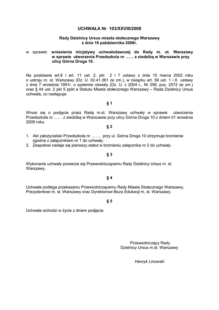 UCHWAŁA Nr 103/XXVIII/2008 Rady Dzielnicy Ursus miasta stołecznego Warszawy z dnia 16 października 2008r. w sprawie: wniesienia inicjatywy uchwałodawczej do Rady m. st. Warszawy w sprawie utworzenia Przedszkola nr …… z siedzibą w Warszawie przy ulicy Górna Droga 10. Na podstawie art.6 i art. 11 ust. 2, pkt 2 i 7 ustawy z dnia 15 marca 2002 roku o ustroju m. st. Warszawy (Dz. U. 02.41.361 ze zm.), w związku art. 58 ust. 1 i 6 ustawy z dnia 7 września 1991r. o systemie oświaty (Dz. U. z 2004 r., Nr 256, poz. 2572 ze zm.) oraz § 44 ust. 2 pkt 5 ppkt a Statutu Miasta stołecznego Warszawy – Rada Dzielnicy Ursus uchwala, co następuje: §1 Wnosi się o podjęcie przez Radę m.st. Warszawy uchwały w sprawie utworzenia Przedszkola nr …… z siedzibą w Warszawie przy ulicy Górna Droga 10 z dniem 01 września 2009 roku. §2 1. Akt załoŜycielski Przedszkola nr ……. przy ul. Górna Droga 10 otrzymuje brzmienie zgodne z załącznikiem nr 1 do uchwały. 2. Zespołowi nadaje się pierwszy statut w brzmieniu załącznika nr 2 do uchwały. §3 Wykonanie uchwały powierza się Przewodniczącemu Rady Dzielnicy Ursus m. st. Warszawy. §4 Uchwała podlega przekazaniu Przewodniczącemu Rady Miasta Stołecznego Warszawy, Prezydentowi m. st. Warszawy oraz Dyrektorowi Biura Edukacji m. st. Warszawy. §5 Uchwała wchodzi w Ŝycie z dniem podjęcia. Przewodniczący Rady Dzielnicy Ursus m.st. Warszawy Henryk Linowski Załącznik do Uchwały Nr 103 /XXVIII/2008 z dnia 16 października 2008r. Uzasadnienie Biorąc pod uwagę rosnące zapotrzebowanie w dzielnicy na placówki przedszkolne planujemy przy ulicy Górna Droga 10 powstanie nowej czterooddziałowej placówki przedszkolnej, stworzonej na bazie istniejących dotychczas oddziałów zamiejscowych Przedszkola nr 194 mającego siedzibę przy ulicy W. Sławka 7. Budynek przy ul. W. Sławka 7 zostanie rozbudowany, co pozwoli na utworzenie w nim 8 oddziałów. Utrzymanie w strukturze organizacyjnej przedszkola dodatkowych 4 oddziałów zamiejscowych, skomplikuje znacznie efektywny proces zarządzania Placówką. Wydzielenie samodzielnego przedszkola w miejsce aktualnie istniejących 4 oddziałów zamiejscowych P-194 znajduje uzasadnienie organizacyjne i ekonomiczne: • lokal przy ulicy Górna Droga 10 mieści się na nowym osiedlu mieszkaniowym w duŜej odległości od innych placówek przedszkolnych • stała obecność dyrektora w miejsce dotychczas istniejącego zastępcy przyczyni się do częstszych i bardziej efektywnych kontaktów z rodzicami oraz usprawnieniu pracy placówki • rozwiązanie to, bazujące na lokalu wcześniej juŜ wykorzystywanym na potrzeby placówki przedszkolnej nie pociąga za sobą zbyt duŜych nakładów finansowych. Biorąc powyŜsze pod uwagę, wydaje się, Ŝe utworzenie nowego Przedszkola przy ulicy Górna Droga 10 w Warszawie jest uzasadnione.